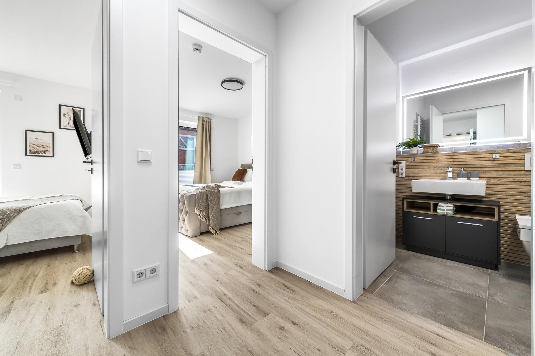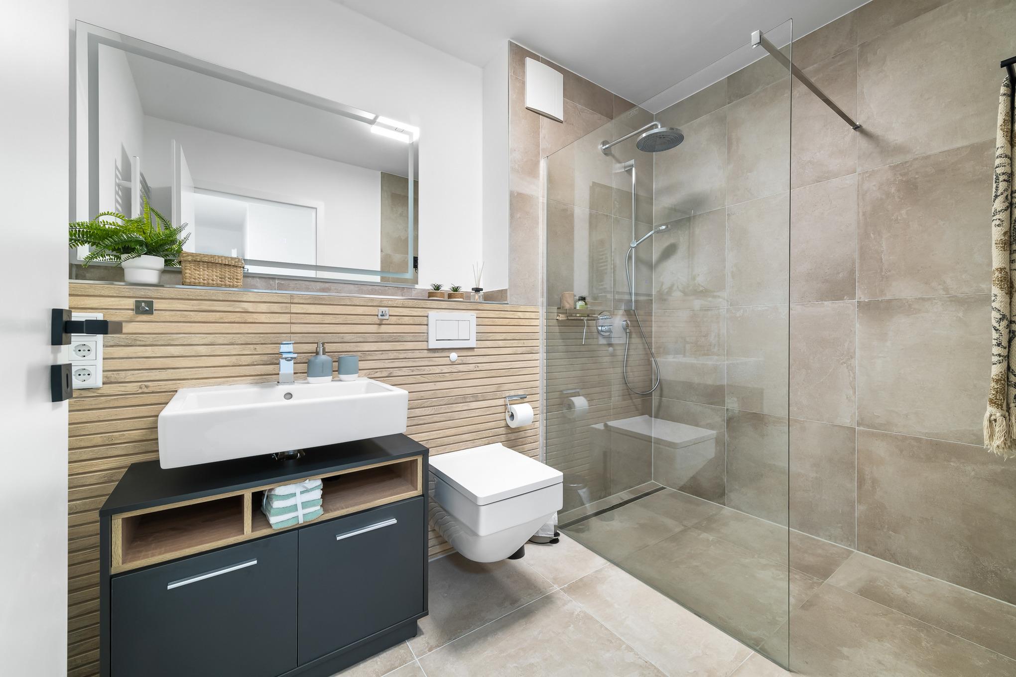 Das gut geschnittene, moderne Duschbad direkt neben dem Schlafzimmer sorgt für weitere Bequemlichkeit. Die ebenerdige Dusche, WC, Waschbecken, Spiegel und ein Handtuchwärmer runden den Raum ab.