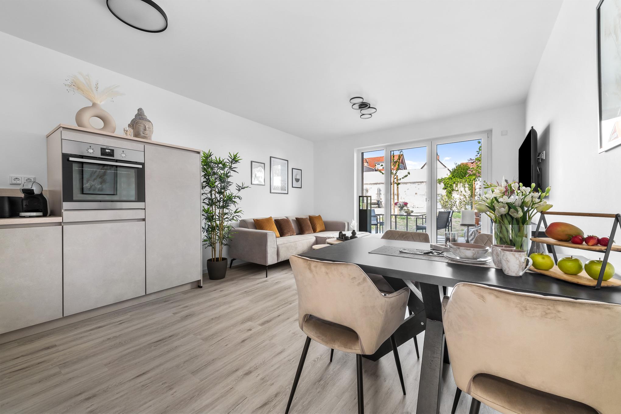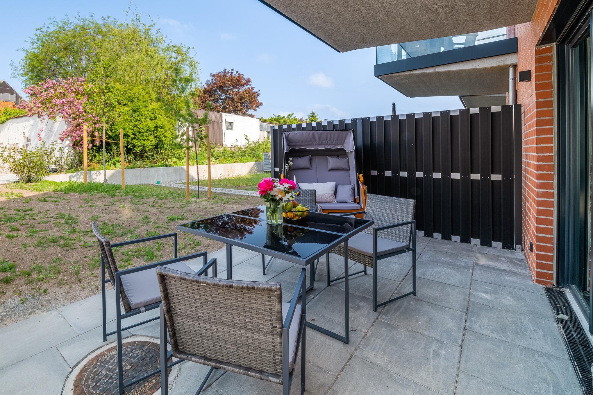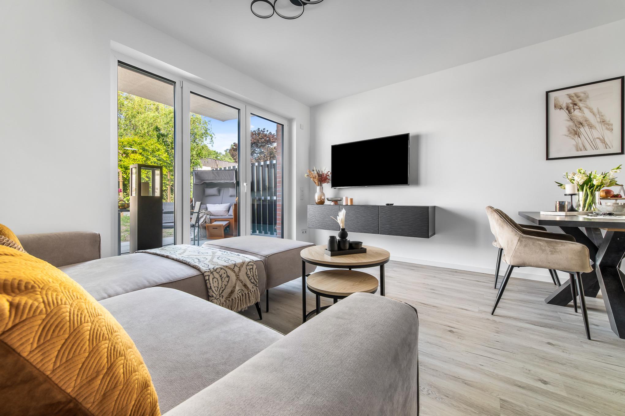 Zu den weiteren Ausstattungsmerkmalen gehören eine möblierte Terrasse und ein gemeinschaftlich nutzbarer, offener Gartenbereich. Die Terrasse der Wohnung schließt direkt an den Wohnbereich an. Diese lädt dazu ein, den Tag mit einer Tasse Kaffee an der frischen Seeluft zu beginnen oder laue Sommerabende entspannt ausklingen zu lassen.
