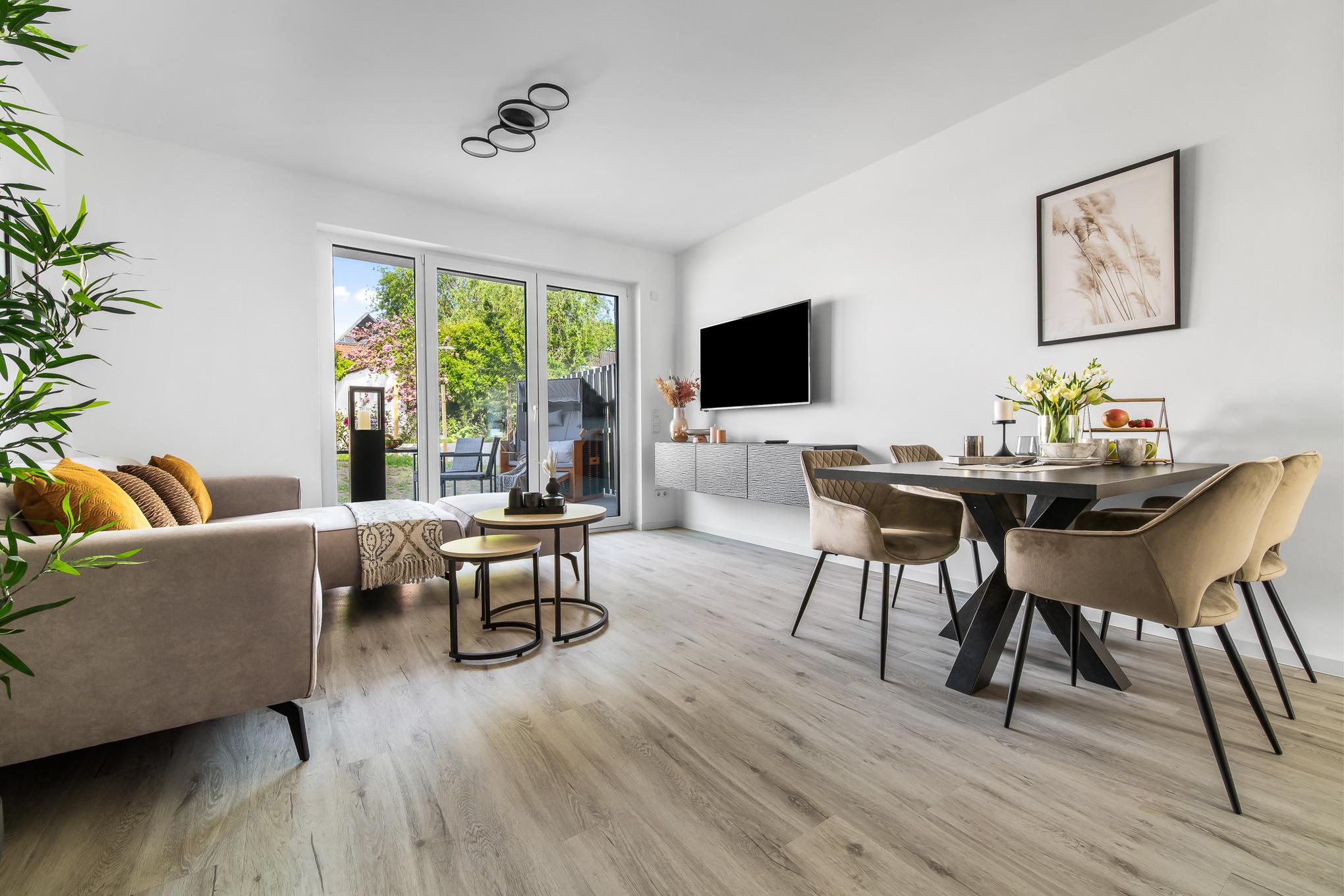 Herzstück ist der einladende Wohn- und Essbereich. Hier kann auf der gemütlichen Couch entspannt werden oder Sie genießen gesellige Stunden am Esstisch. Naturtöne und mit viel Geschick ausgewählte Dekorationen sorgen für ein wunderbar wohnliches Gefühl. TV und WLAN sind selbstverständlich. Durch die großen, charmanten Fenster haben Sie einen Blick in die Außenanlage vom Harbour Side Heiligenhafen.