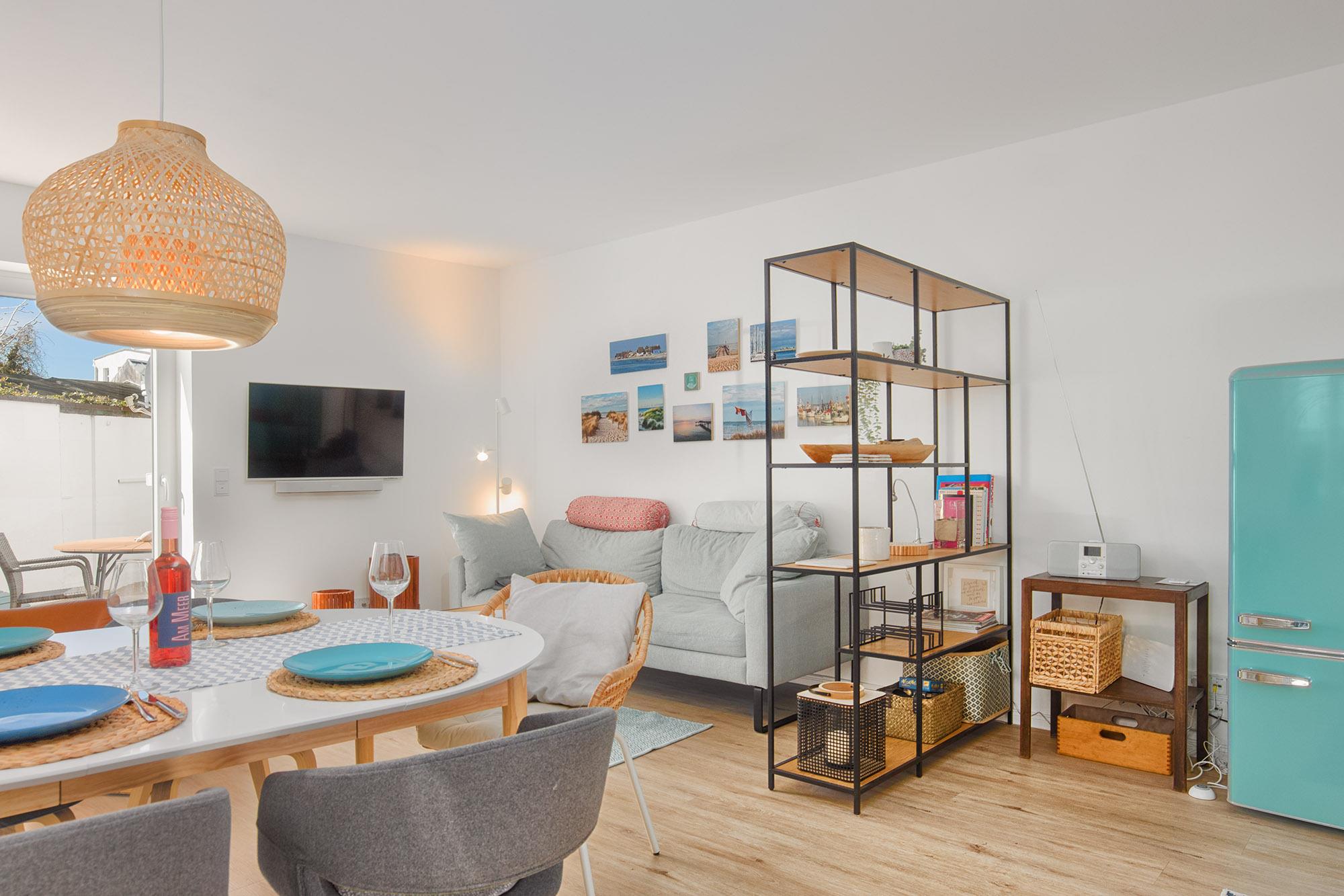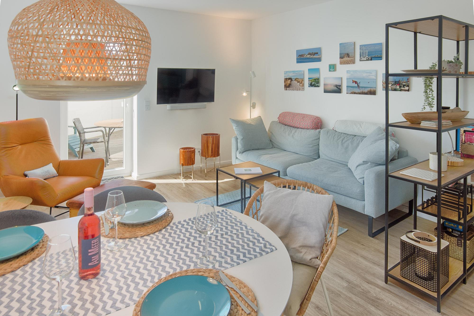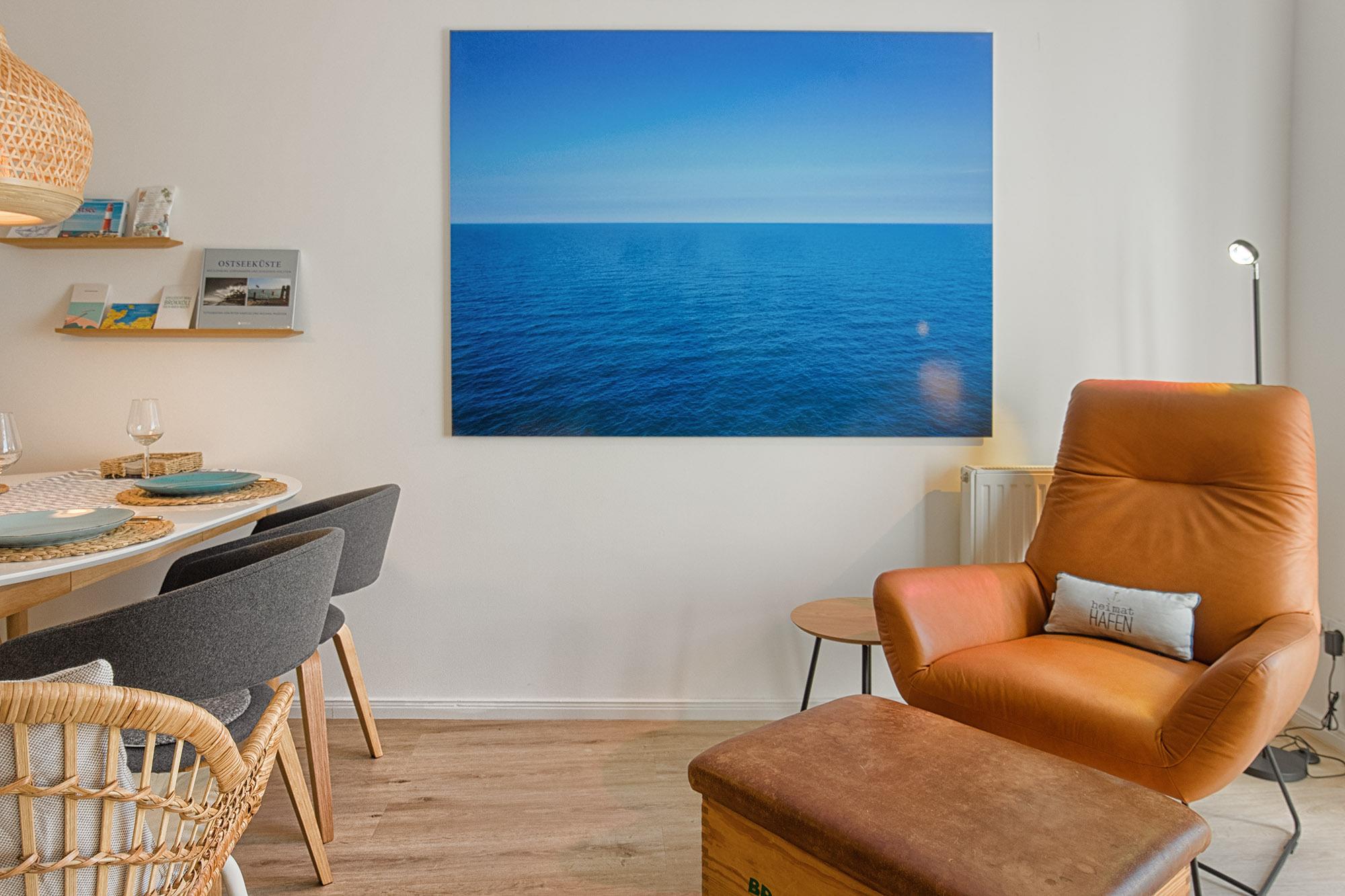 Komfort für Gäste steht hierbei im Vordergrund. Auf ca. 68 qm Wohnfläche ist für den bequemen Aufenthalt genug Raum für einen entspannten Urlaub. LilleHavn ist liebevoll und wertig eingerichtet. Der Wohn- und Essbereich ist großzügig offen gehalten und bietet mit dem gemütlichen Sofa und einem Ledersessel Platz zum Relaxen. Selbstverständlich ist die Wohnung mit Fernsehern, WLAN und Radio/Bluetooth ausgestattet.