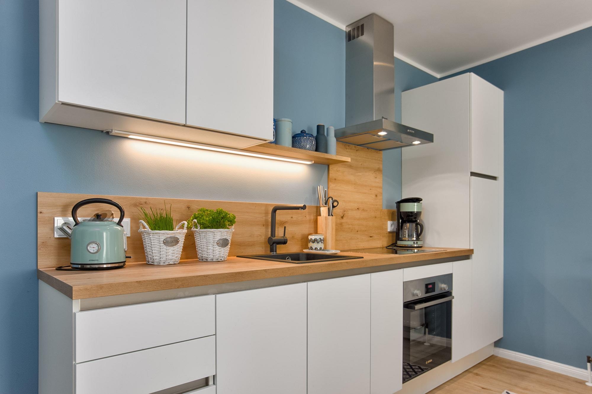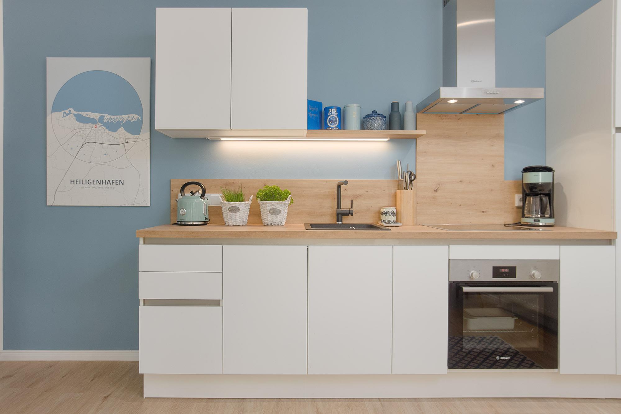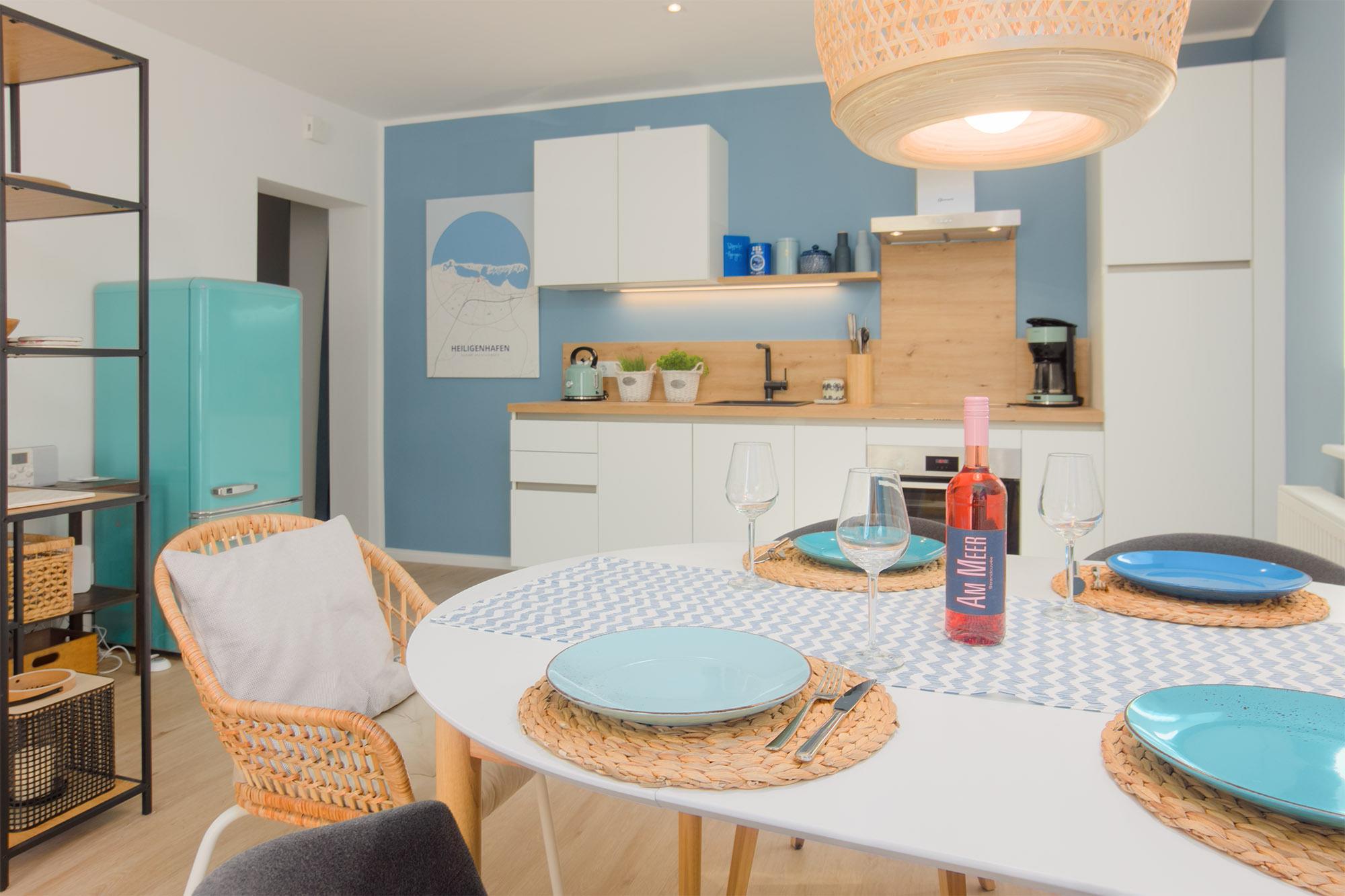 Komfort für Gäste steht hierbei im Vordergrund. Auf ca. 68 qm Wohnfläche ist für den bequemen Aufenthalt genug Raum für einen entspannten Urlaub. LilleHavn ist liebevoll und wertig eingerichtet. Der Wohn- und Essbereich ist großzügig offen gehalten und bietet mit dem gemütlichen Sofa und einem Ledersessel Platz zum Relaxen. Selbstverständlich ist die Wohnung mit Fernsehern, WLAN und Radio/Bluetooth ausgestattet.