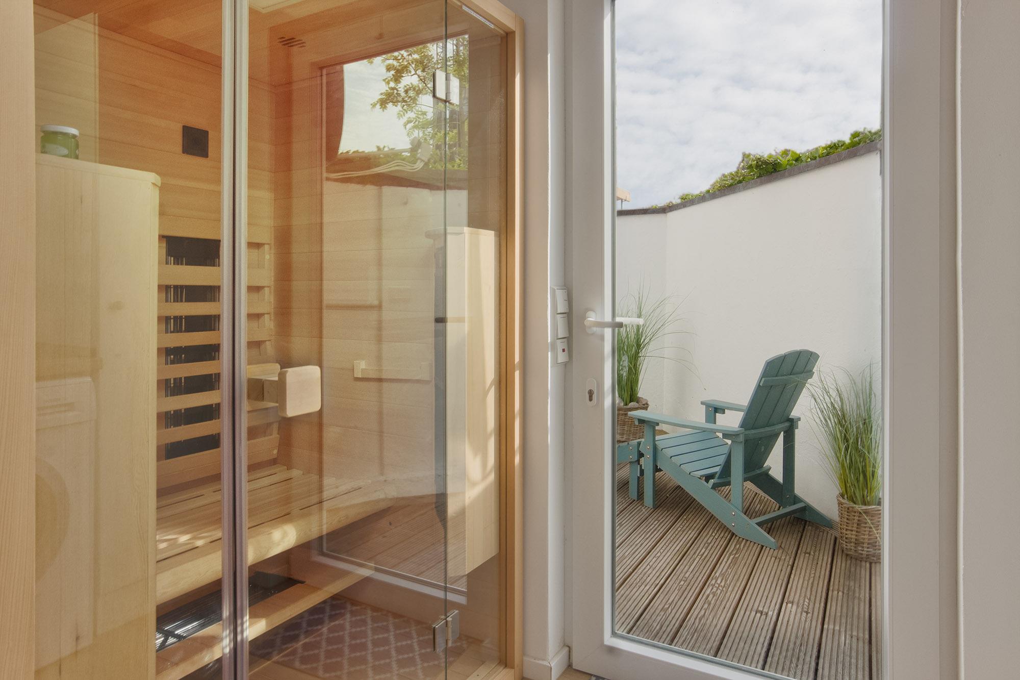 Im separaten Anbau der Terrasse befinden sich eine Waschmaschine und ein Trockner, sowie als Besonderheit für Wellness-Komfort eine Infrarot-Vollspektrum-Sauna zur Nutzung (gegen Gebühr).
