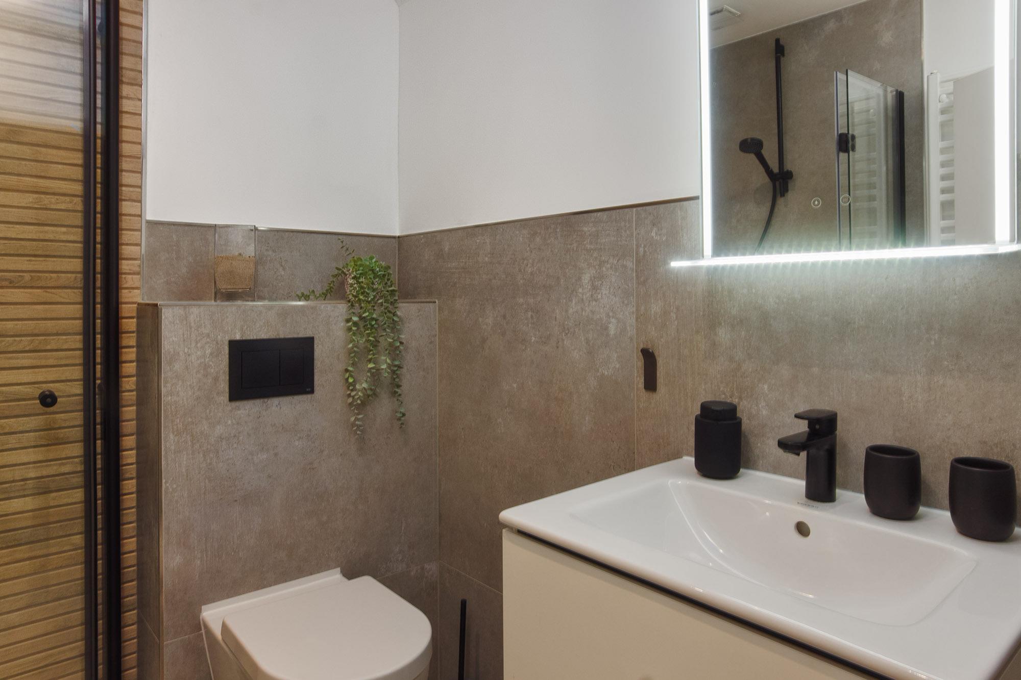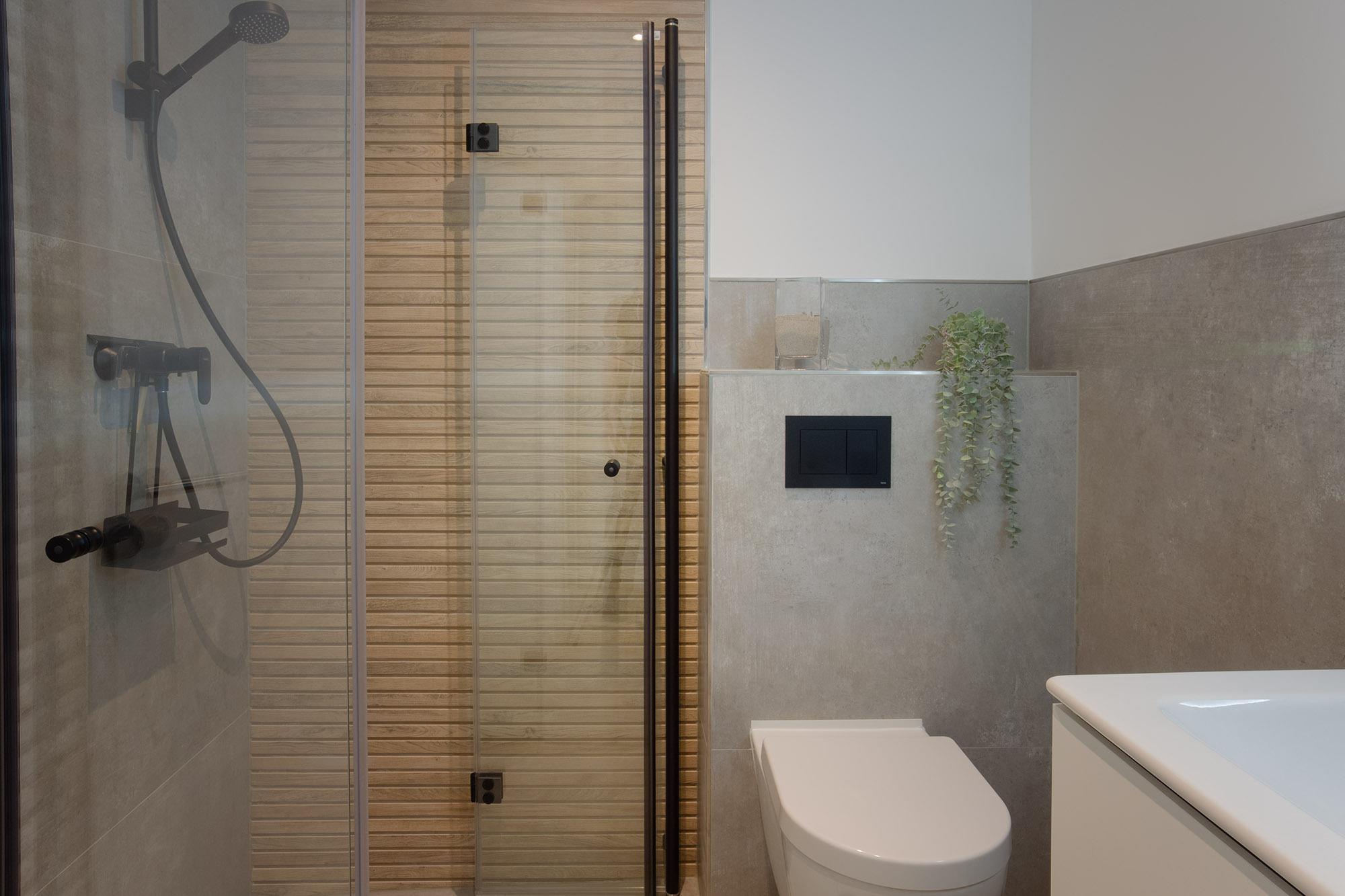 Das kleine aber hochwertige Badezimmer mit ebenerdiger Dusche (90x90cm), Handtuchwärmer und WC ist bequem von beiden Schlafzimmern erreichbar.