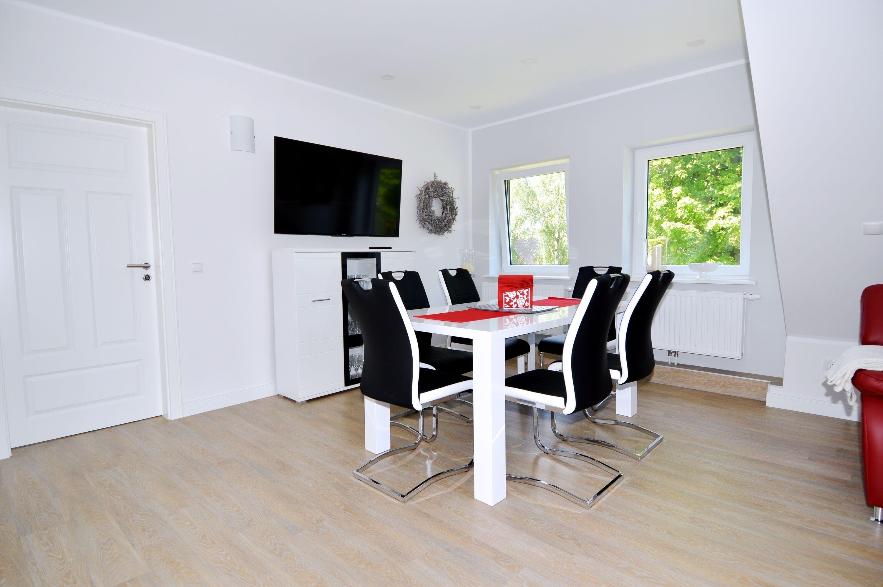 Die große Küche bietet alles, was Sie im Urlaub benötigen: Ceranfeld, Backofen, Mikrowelle, Kaffeemaschine, Geschirrspüler und Kühlschrank mit Gefrierfach. Die Küche ist zum Flur und Wohnraum hin offen. Der Wohn- und Essraum bietet eine große Couch und einen großen Esstisch. Ein TV darf natürlich auch hier nicht fehlen. Auch das Bad ist modern gestaltet und mit Dusche ausgestattet.