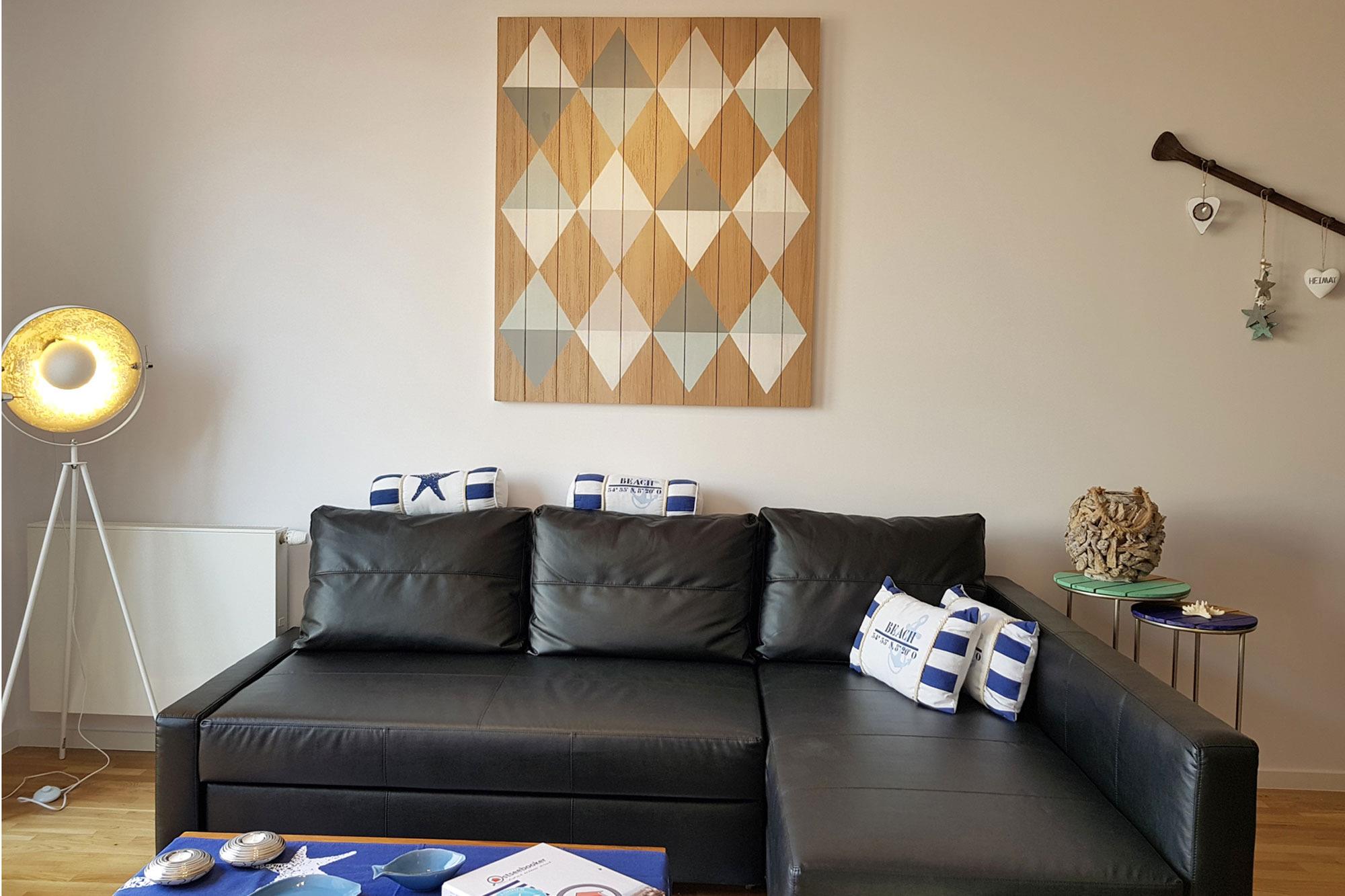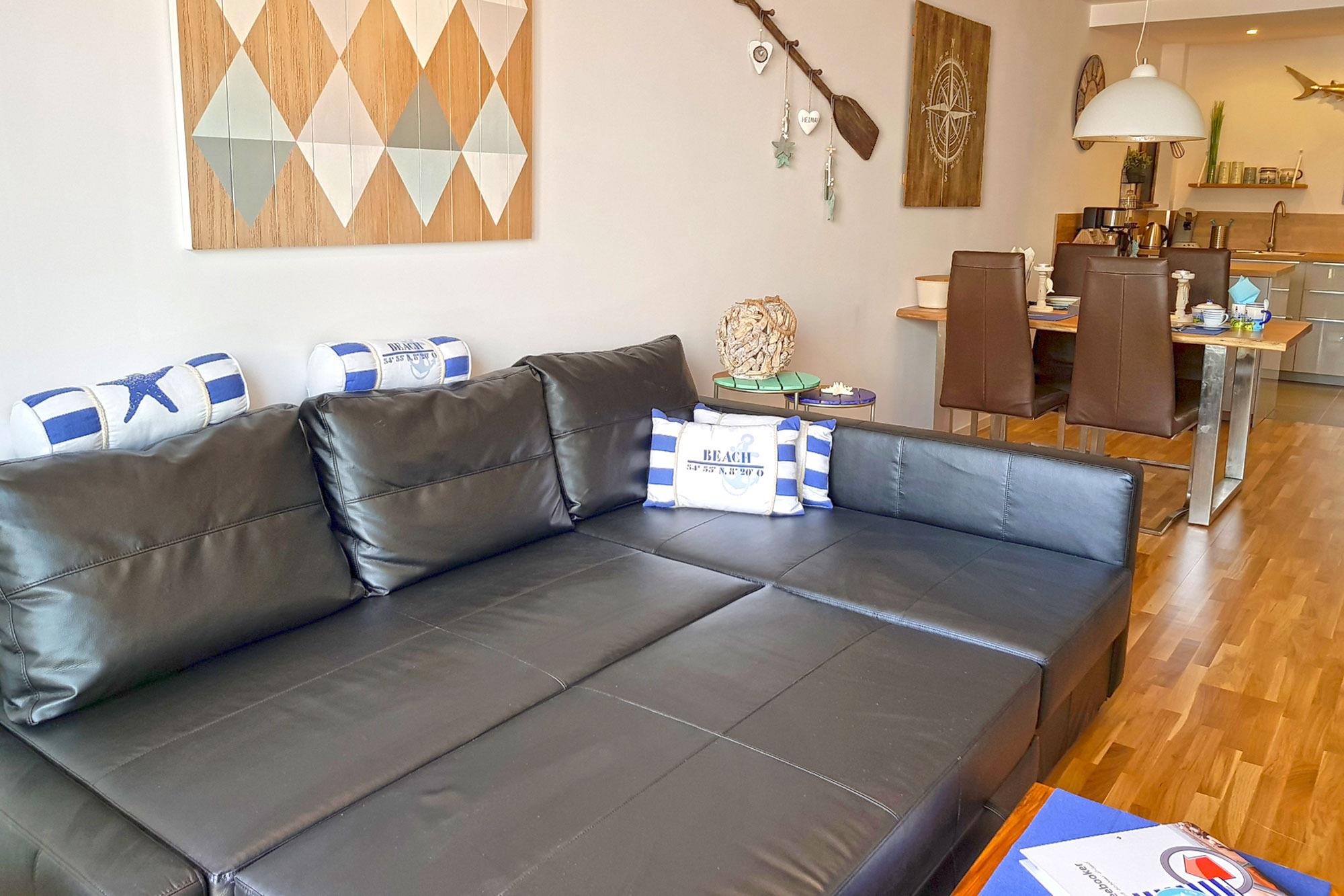 Mit einer Wohnfläche von ca. 58 m² im Erdgeschoss eignet sich diese Ferienwohnung ideal für 2 (+2) Personen und einen Hund (gegen Gebühr). Das maritime Flair zieht sich durch die gesamte, neu und modern eingerichtete Unterkunft. Der offene Wohnbereich mit Echtholzparkettboden sorgt für ein gemütliches Ambiente. Eine komfortable Schlafcouch, ein 40'' LED-TV, DVD-Player, Radio mit USB/Bluetooth und WLAN stehen für Unterhaltung bereit. Bodentiefe Fenster lassen viel Tageslicht herein und ermöglichen von der Couch aus einen direkten Blick auf die möblierte Terrasse. Durch die Nordausrichtung können Sie hier bereits morgens die Sonne beim Frühstück genießen und das Stadtleben beobachten.
