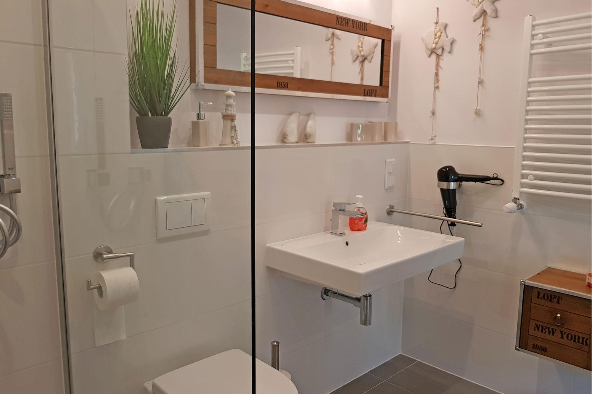 Das großzügige Badezimmer lädt zum Entspannen ein. Eine ebenerdige Dusche mit Rain-Shower-Funktion, ein Waschbecken, WC, Fön und Handtuchwärmer bieten höchsten Komfort. Als besonderes Highlight steht eine Infrarot-Sauna zur Verfügung – perfekt, um nach einem ereignisreichen Tag neue Energie zu tanken.