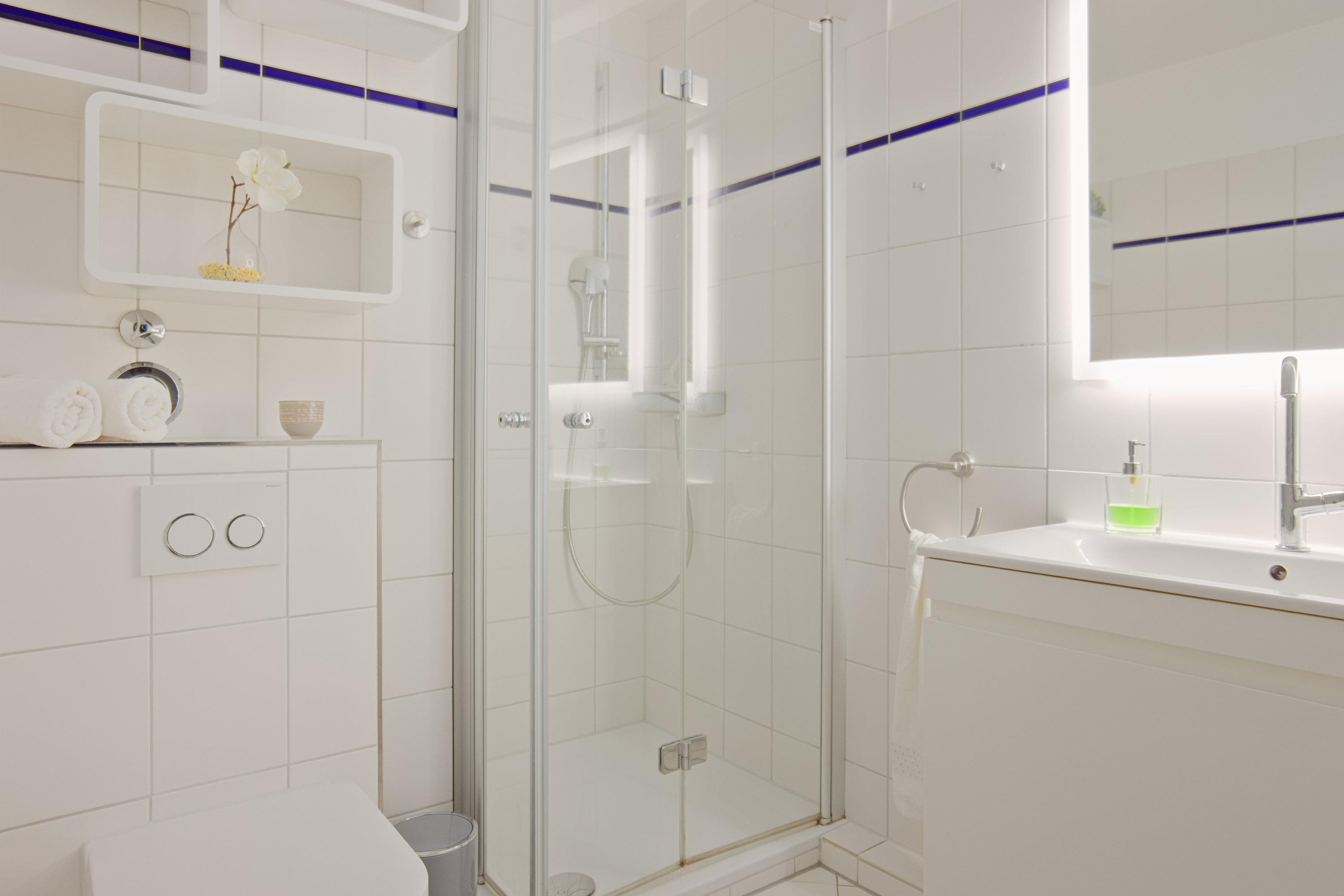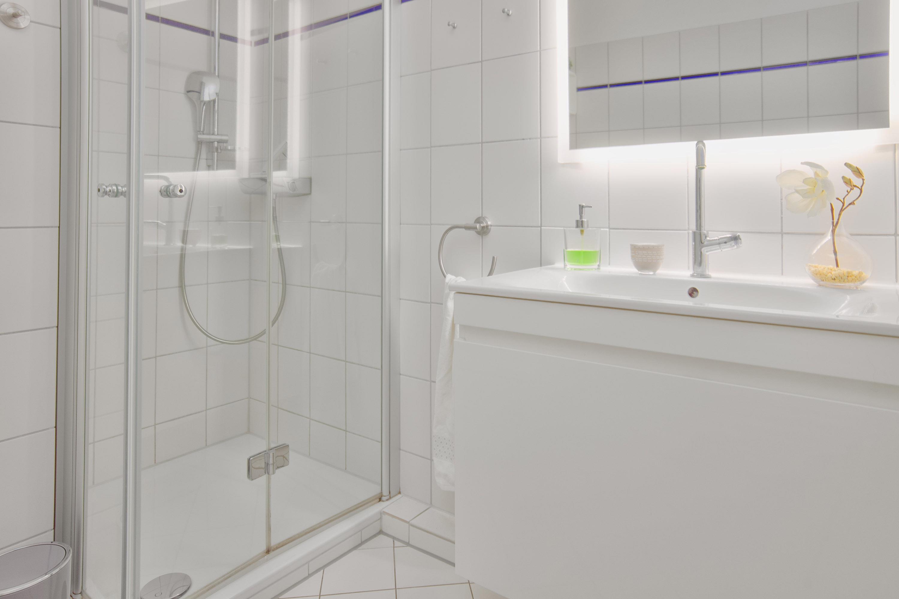 Das hochwertige, moderne Badezimmer ist mit einer geräumigen Dusche, einem beleuchteten Spiegel, einem Handtuchwärmer und einem Föhn ausgestattet – perfekt für einen angenehmen Start in den Tag.