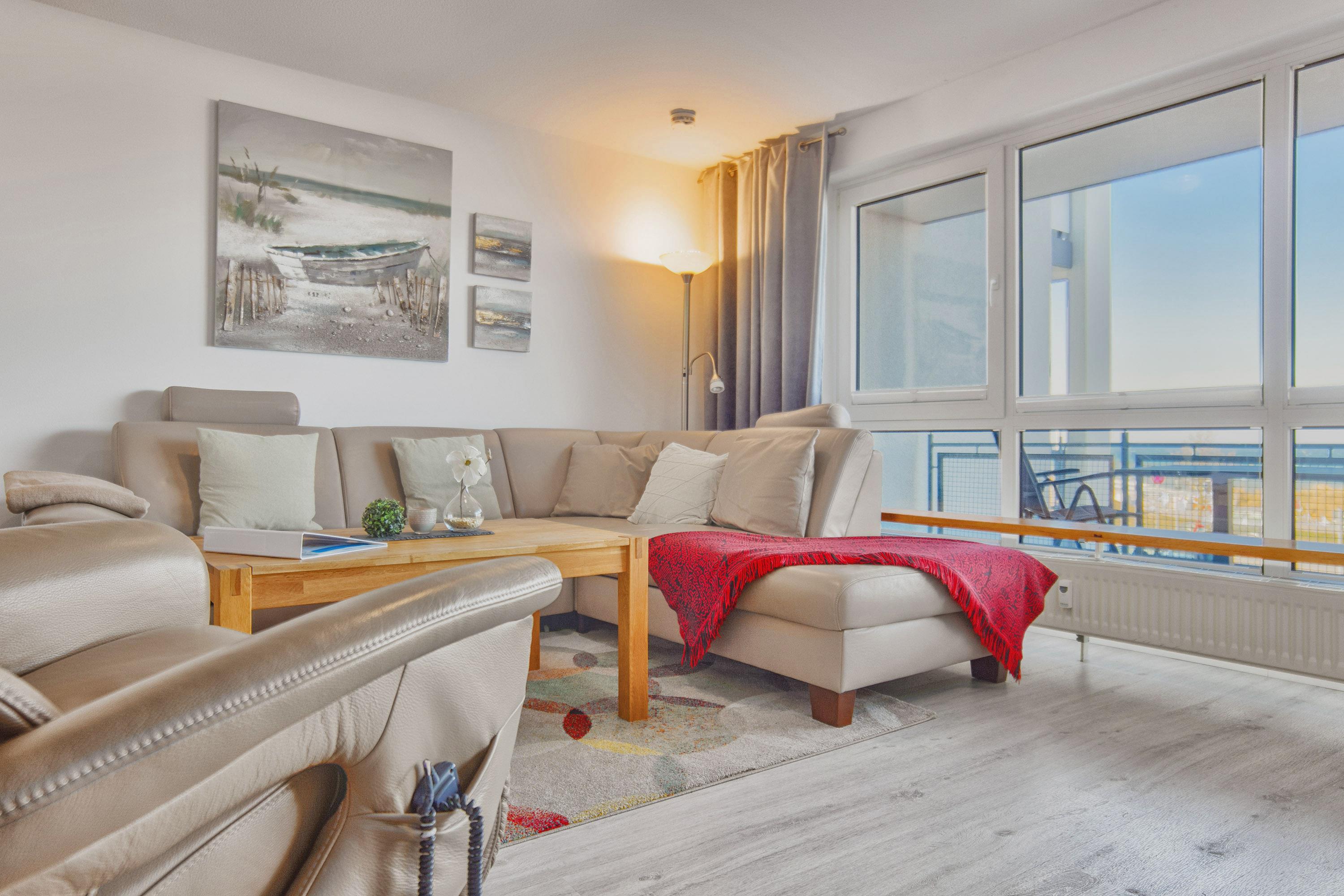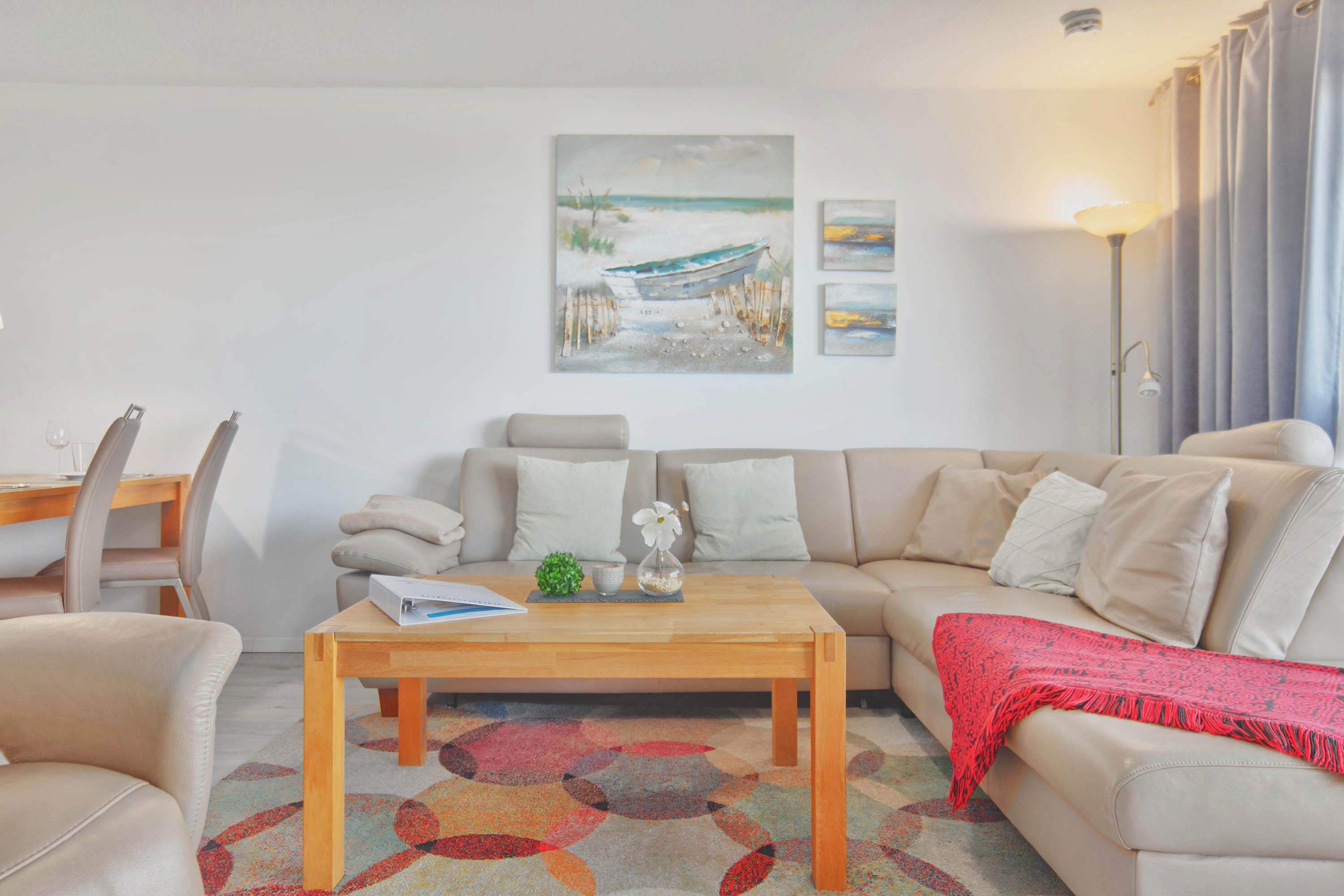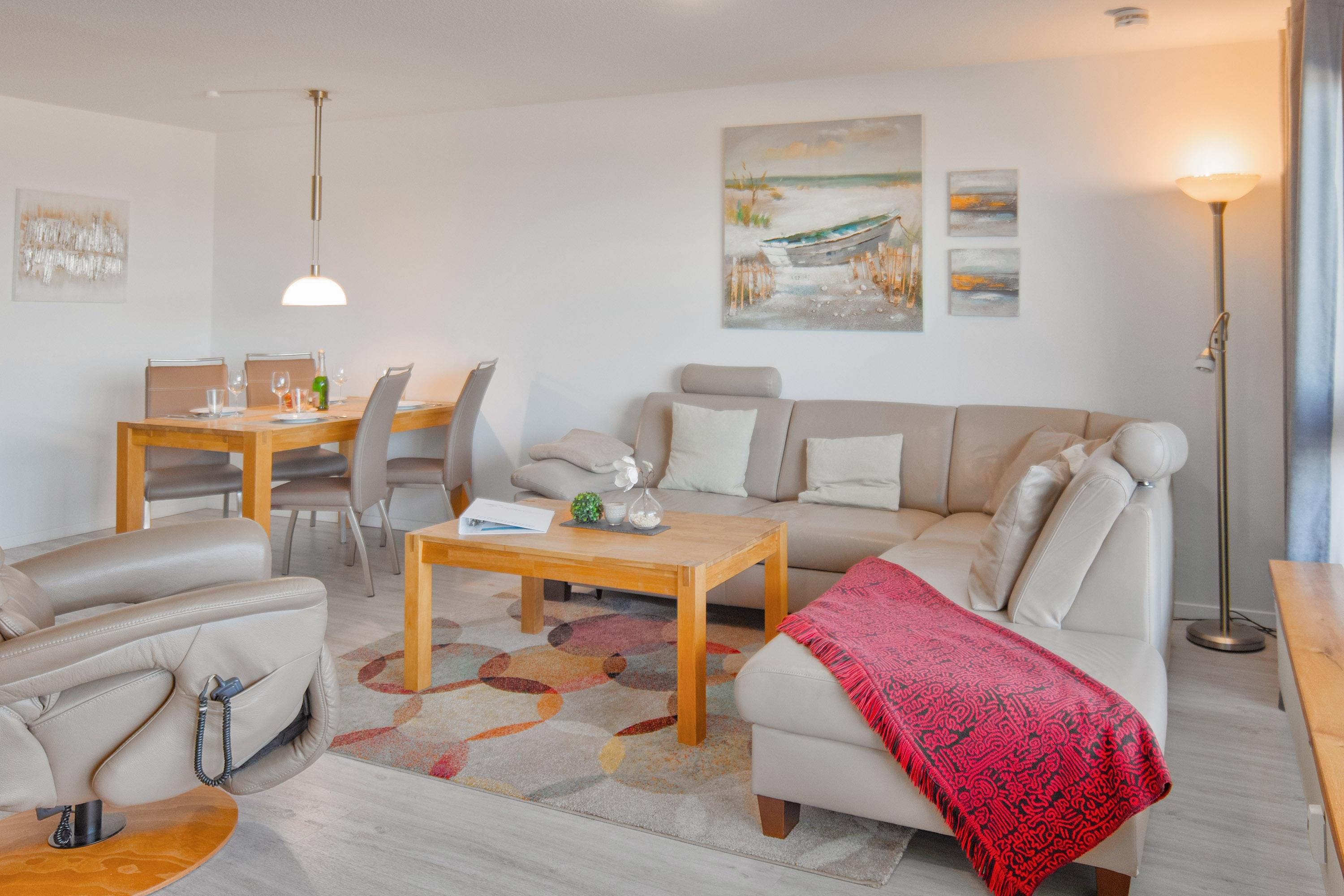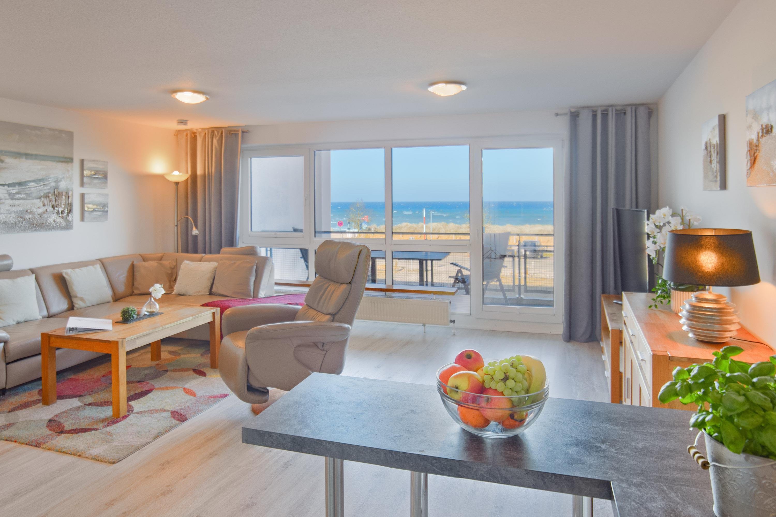 Der offene und großzügige (ca. 37 m²) Wohn- und Essbereich besticht durch eine lichtdurchflutete Panorama-Fensterfront, die einen herrlichen Blick auf die Ostsee und die angrenzenden Dünen bietet. Eine große Ledereckcouch mit Schlaffunktion lädt zum Entspannen ein, während der moderne 55-Zoll-LCD-TV mit Grundig-Soundsystem für beste Unterhaltung sorgt. Ein Esstisch für vier Personen rundet den Wohnbereich ab und bietet den perfekten Platz für gemeinsame Mahlzeiten oder einen gemütlichen Spieleabend – Gesellschaftsspiele und Bestseller-Bücher stehen zur Verfügung.