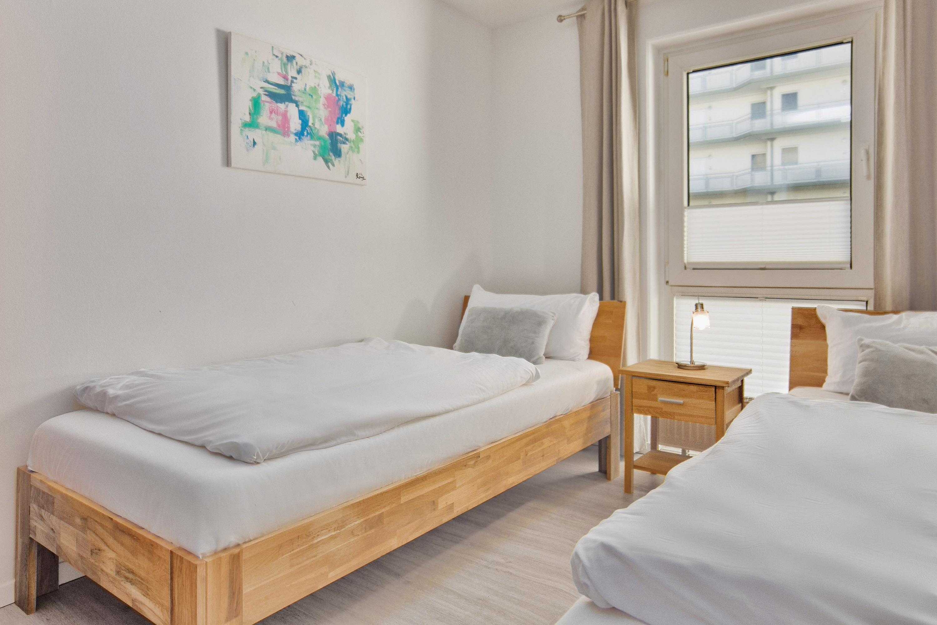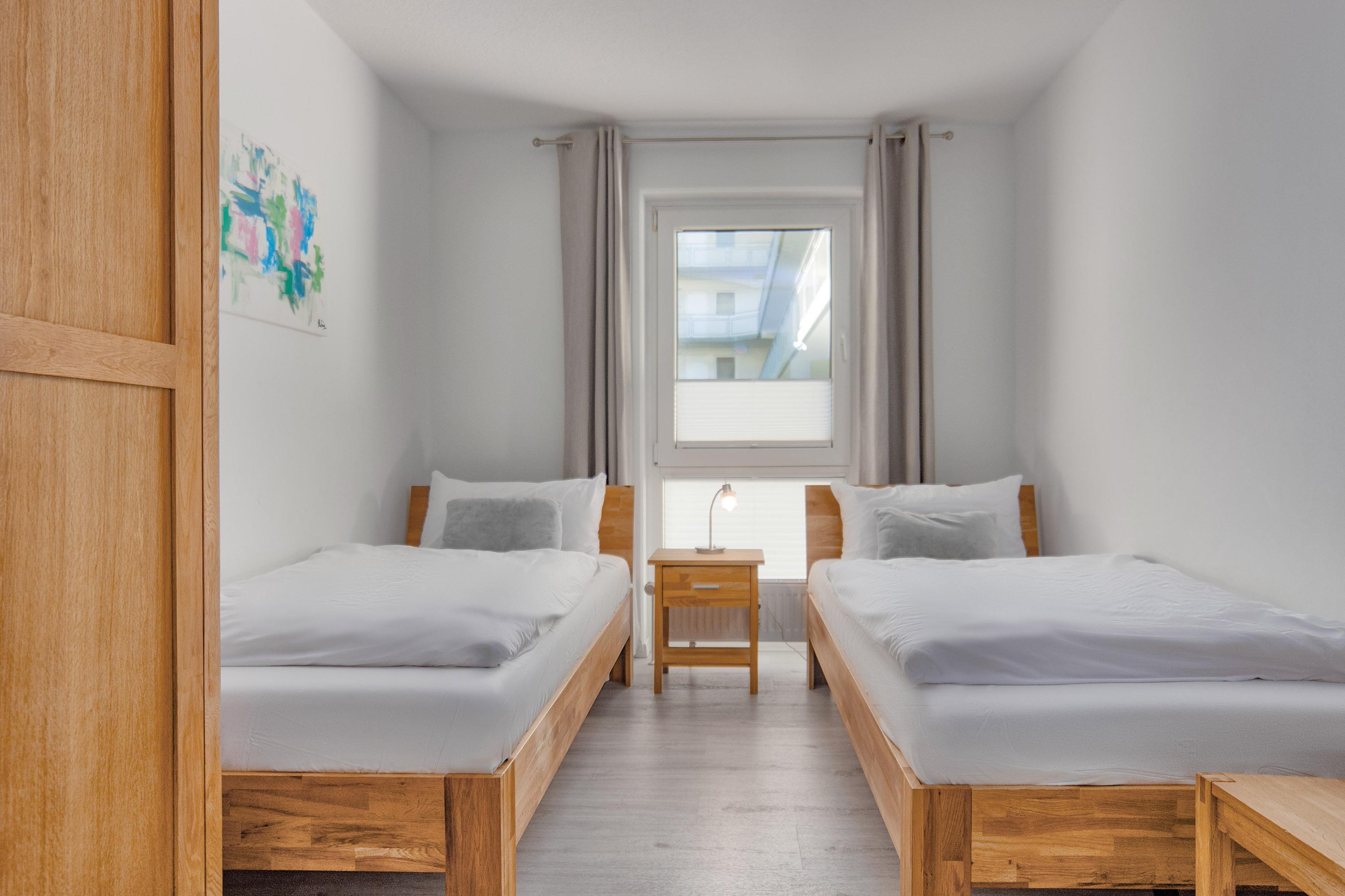 • Schlafzimmer 2 bietet zwei Einzelbetten (90x200 cm) und einen 32-Zoll-TV für individuelle Unterhaltung.