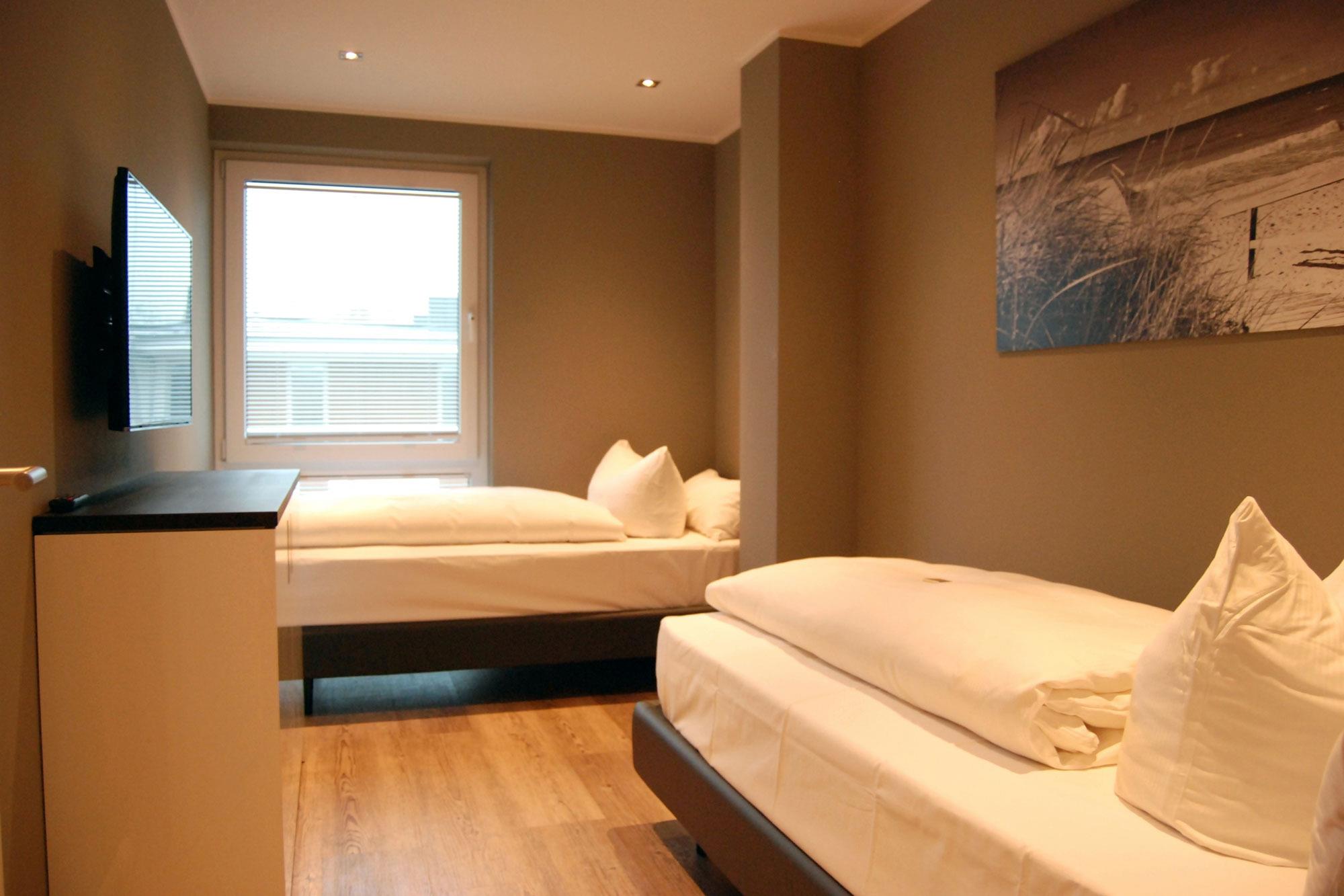 Die Wohnung bietet zwei komfortable Schlafzimmer – eines mit Doppelbett, das andere mit zwei Einzelbetten – jeweils mit eigenem TV. Allergiker-geeignete Hotelbettwäsche und Handtücher können optional dazu gebucht werden. Das großzügige Bad ist mit Fußbodenheizung, Handtuchwärmer und einer geräumigen Dusche ausgestattet – ideal, um nach einem Tag am Meer zu entspannen. Eine integrierte Waschmaschine befindet sich in der Küche.