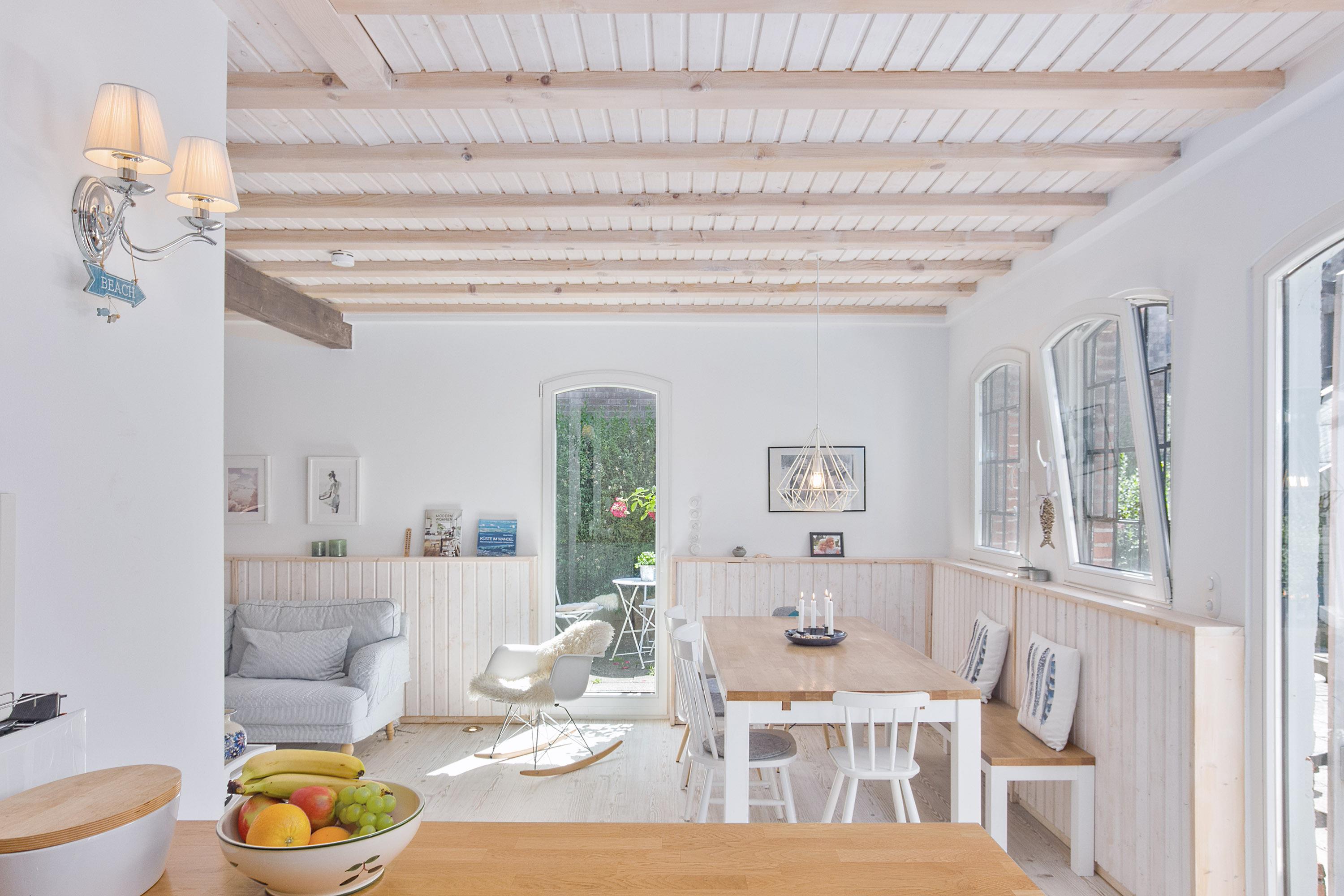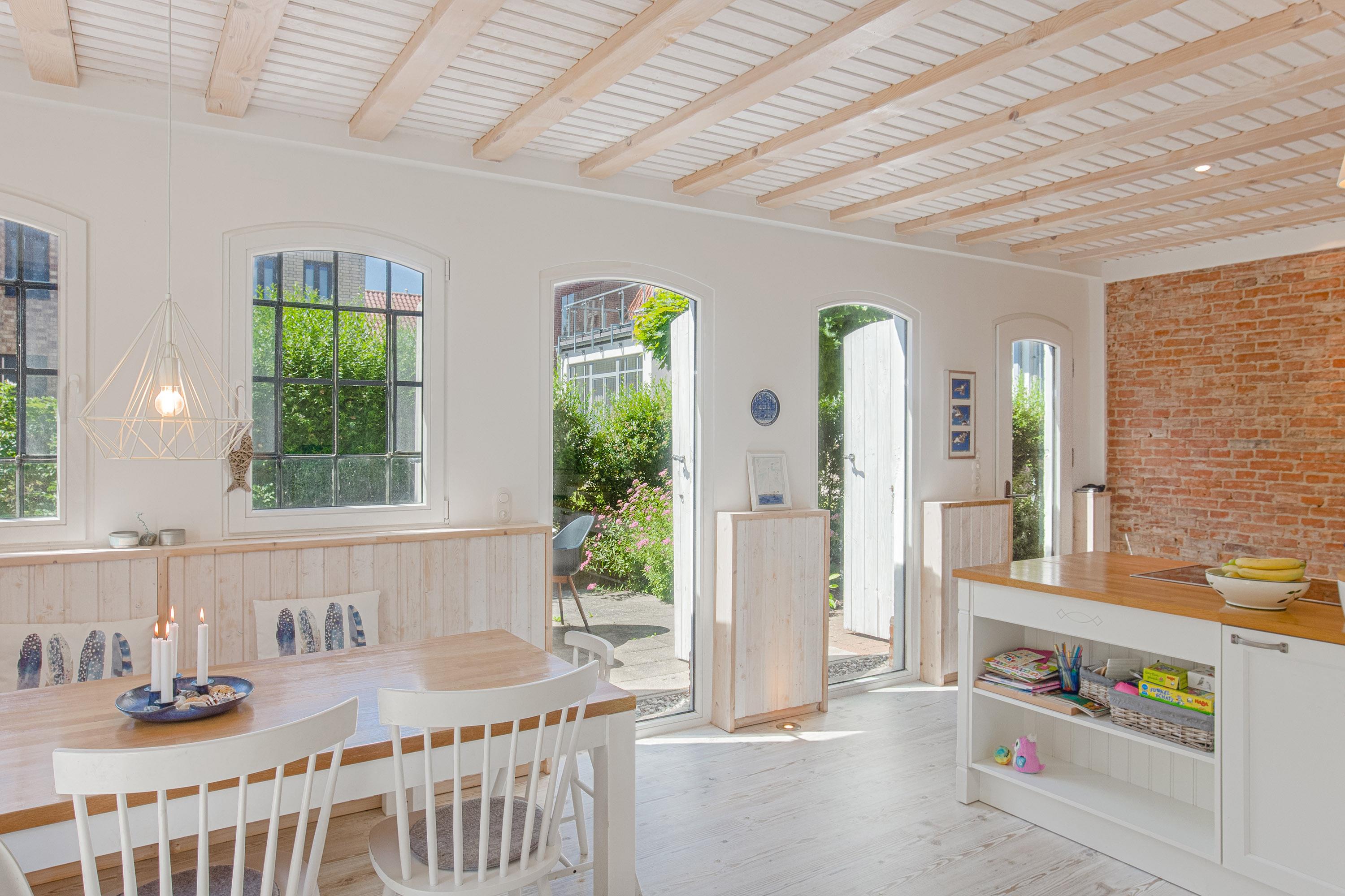 Herzstück ist der große und einladende Wohn- und Essbereich. Hier kann auf der gemütlichen Couch oder Sessel entspannt werden oder Sie genießen gesellige Stunden am großen Esstisch. Naturtöne und ausgewählte Dekorationen sorgen für ein wunderbar wohnliches Gefühl. Mit dem WLAN / WiFi können Sie auch im Urlaub bequem online bleiben oder ihre Lieblingsserien oder Filme per Stream schauen. Die vielen Fenster bringen jede Menge natürliches Licht in die Unterkunft und bieten direkt von der Couch den Blick auf die Terrasse. Authentische Fensterläden sorgen hierbei stilecht für Verdunklung oder Sichtschutz.