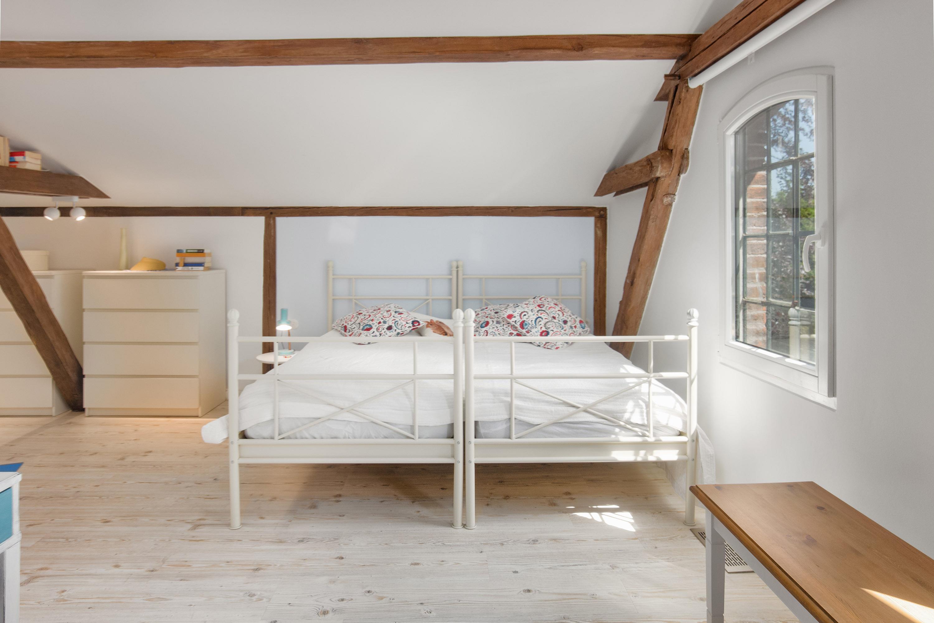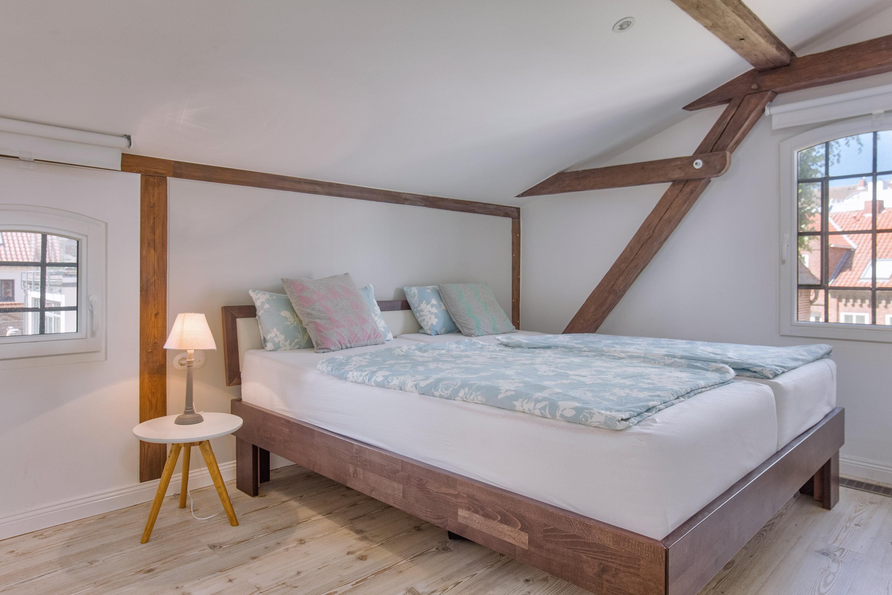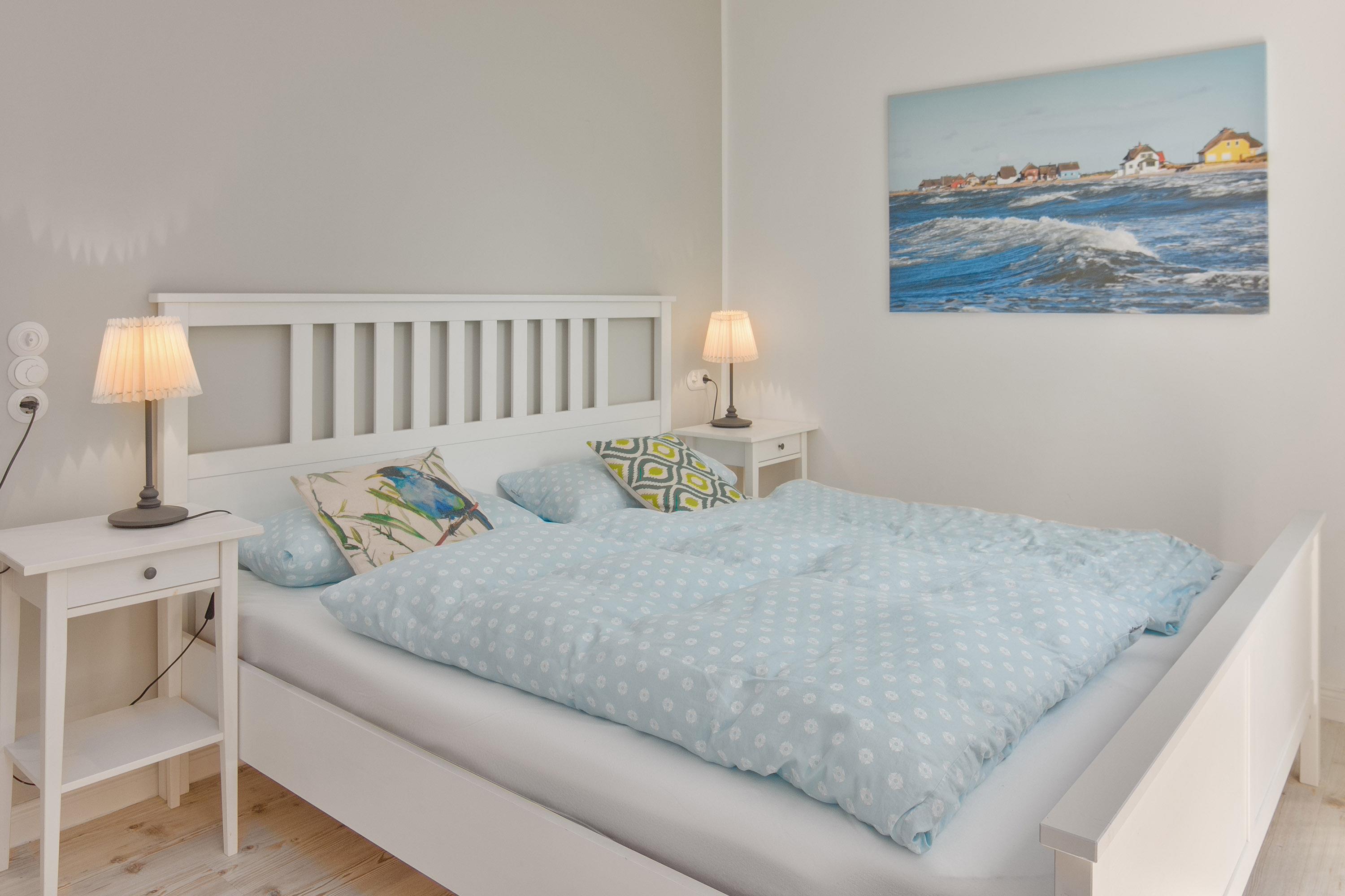 Vier Schlafzimmer mit verschiedenen Bettvariationen stehen zur Verfügung. Das 1.Schlafzimmer mit Doppelbett (180x200), das 2.Schlafzimmer ebenfalls mit Doppelbett (180x200), das 3.Schlafzimmer mit zwei Einzelbetten (90x200) als Doppelbett gestellt, und das 4.Schlafzimmer für Kinder mit einem Einzelbett (80x200), welches auf 160x200 ausgezogen werden kann. Kleiderschränke und Kommoden bieten dabei ausreichenden Stauraum. Allergiker geeignete Bettwäsche, Handtuchsets, Babyreisebett (ohne Bettzeug) und Hochstuhl können bei Bedarf gegen Gebühr geliehen werden. Für Verdunklung und nächtliche Ruhe sorgen hier blickdichte Rollos.