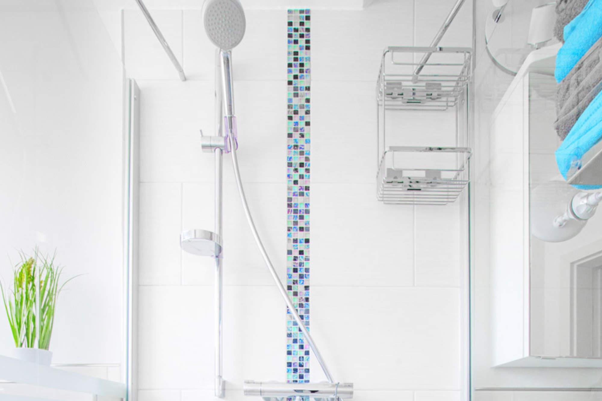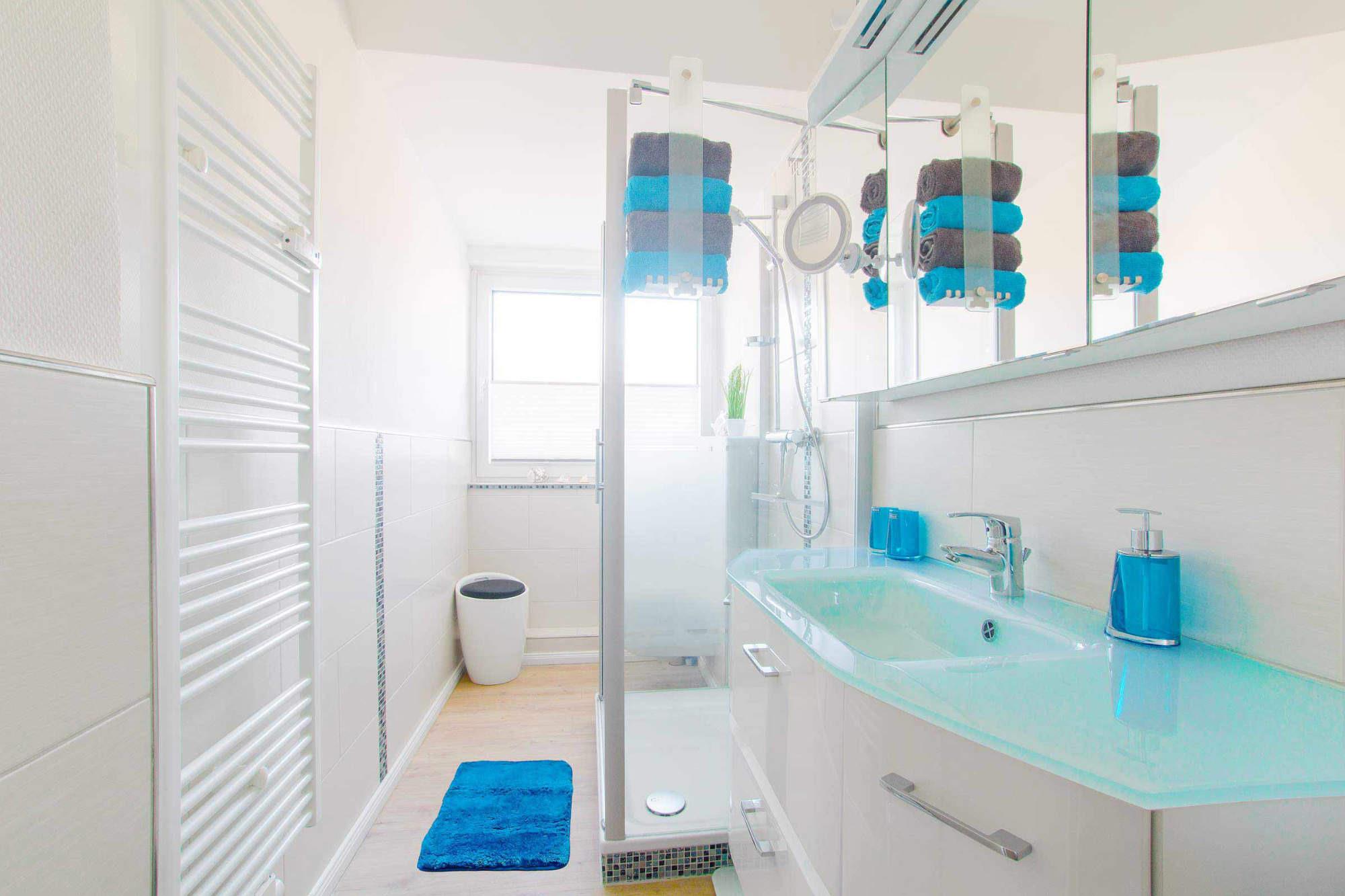 Das Wohlfühl-Badezimmer mit Fenster, ebenerdiger Dusche und Handtuchwärmer lädt auch an ungemütlicheren Tagen zur Entspannung ein. Ein Waschmaschine-Trockner-Kombigerät ist in der Unterkunft selbstverständlich vorhanden.