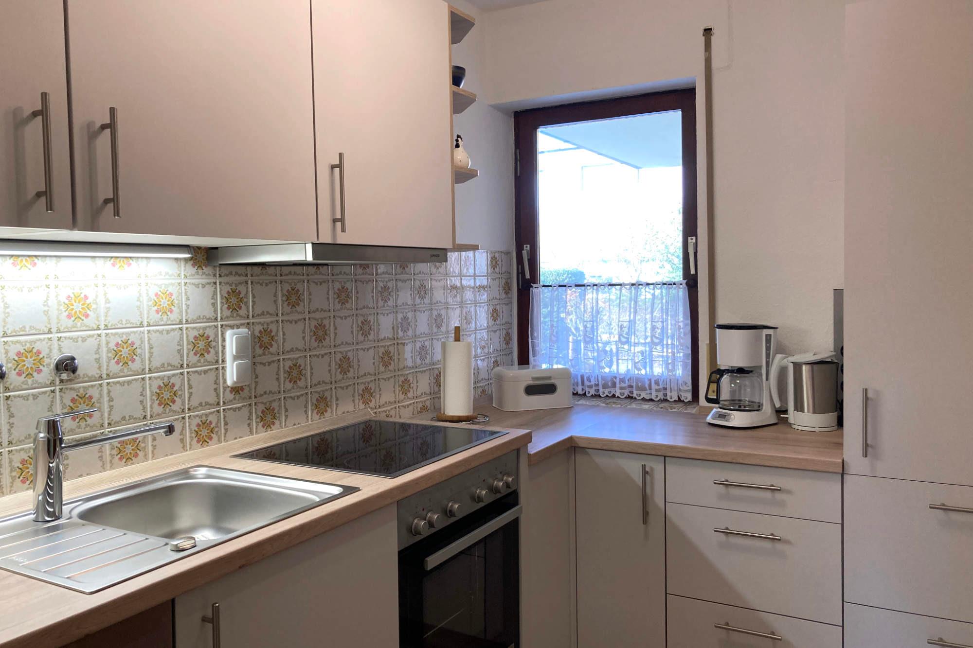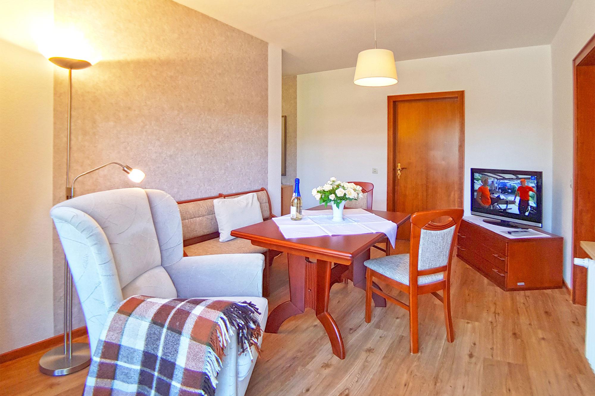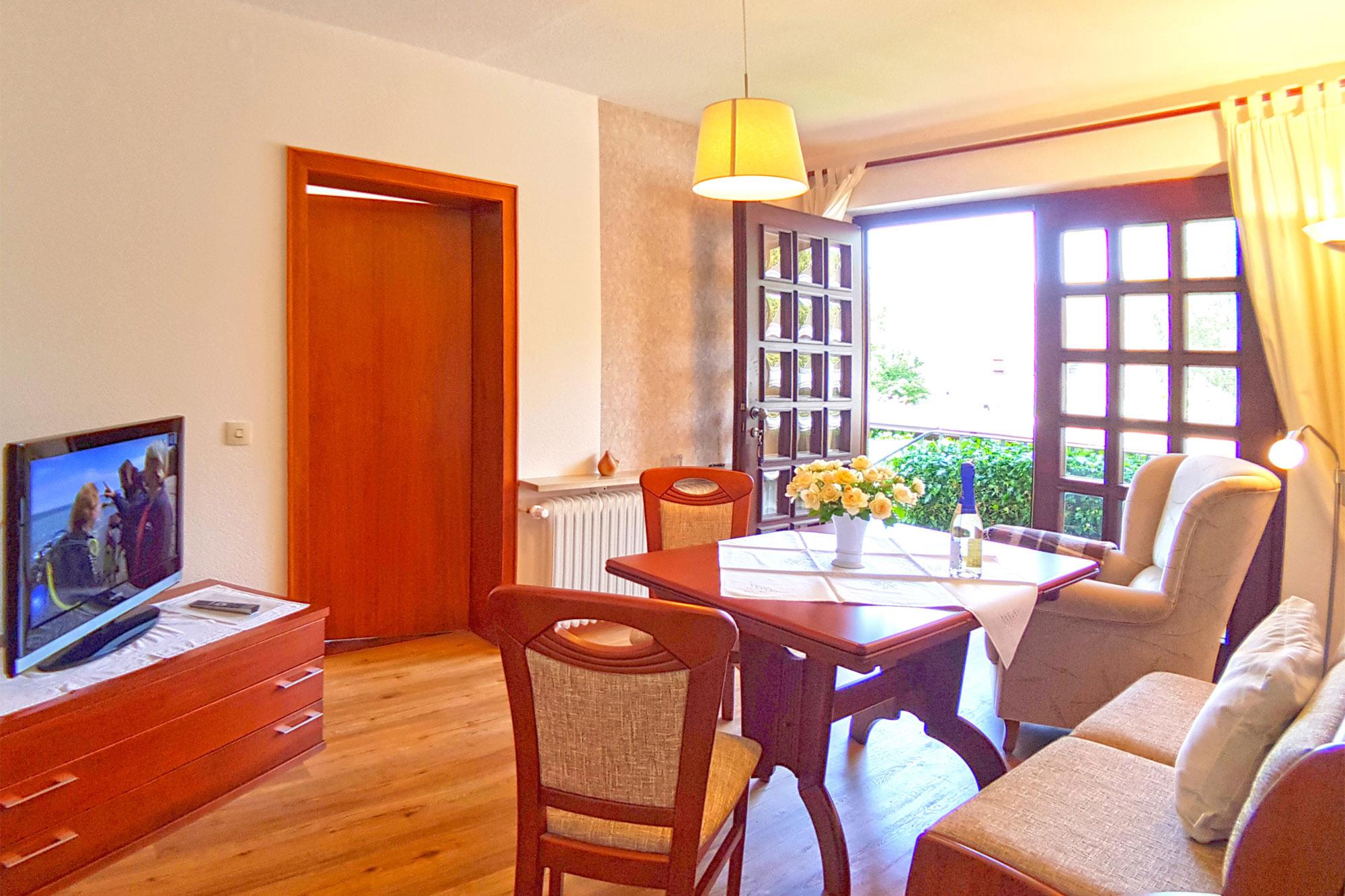 Die schöne, lichtdurchflutete Wohnung bietet viel Platz, ist stimmungsvoll eingerichtet und hat eine große Terrasse und Garten zur Südseite. Diese lädt zum Verweilen und Grillen ein. Sie ist interessant für Familien oder max. 4 Erwachsene mit 1 kleinem Kind, da sie über zwei Schlafzimmer mit Doppelbetten, sowie ein Baby-Reisebett verfügt. Hochstuhl und Wickeltisch verfügbar. Für Abdunklung sorgen die Außenjalousien. Der Wohnbereich ist teilweise mit einem Teppich-Fußboden ausgestattet, das Badezimmer ist gefliest. Die Einrichtung ist wohnfreundlich mit Flat-TV, WLAN und wohnungstypischen Möbeln versehen. Die Küche ist mit einem Herd mit vier Platten, Backofen mit Grill, Spüler, Kaffeemaschine, Wasserkocher etc. ausgestattet. Waschmaschine beim Vermieter auf Nachfrage.