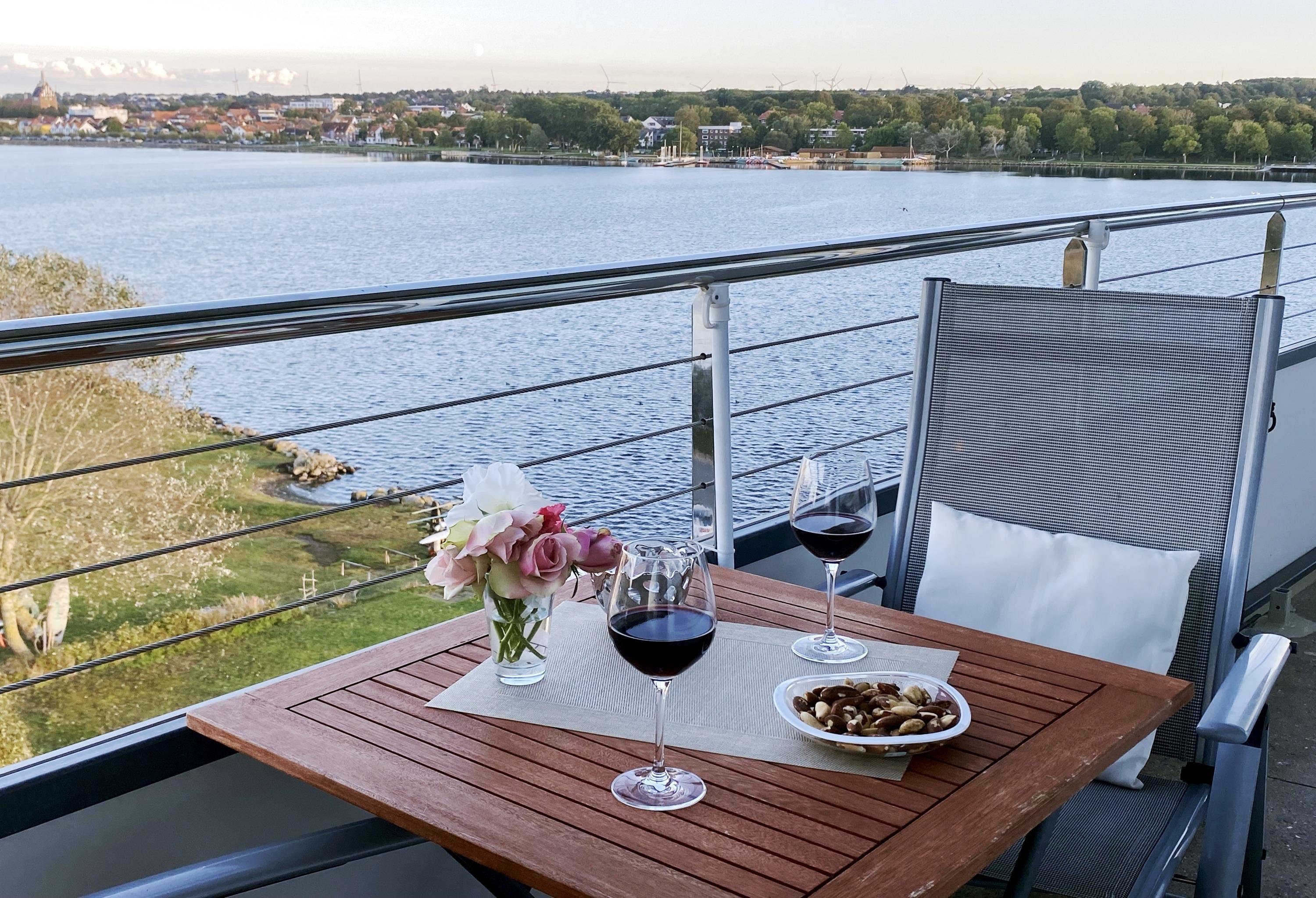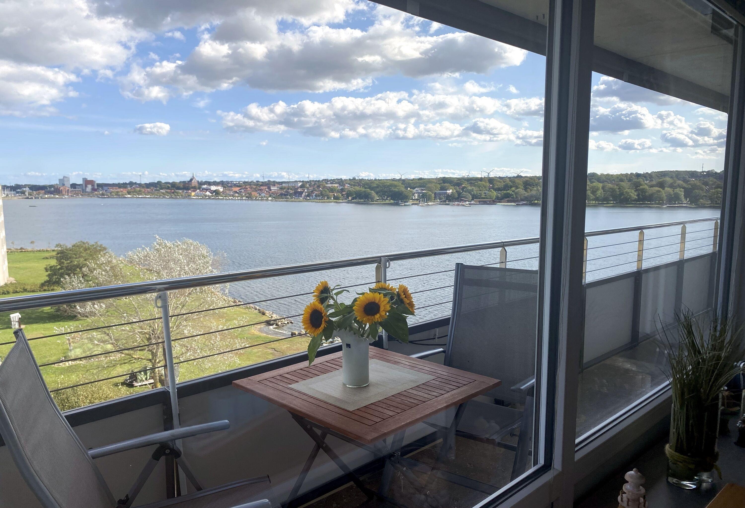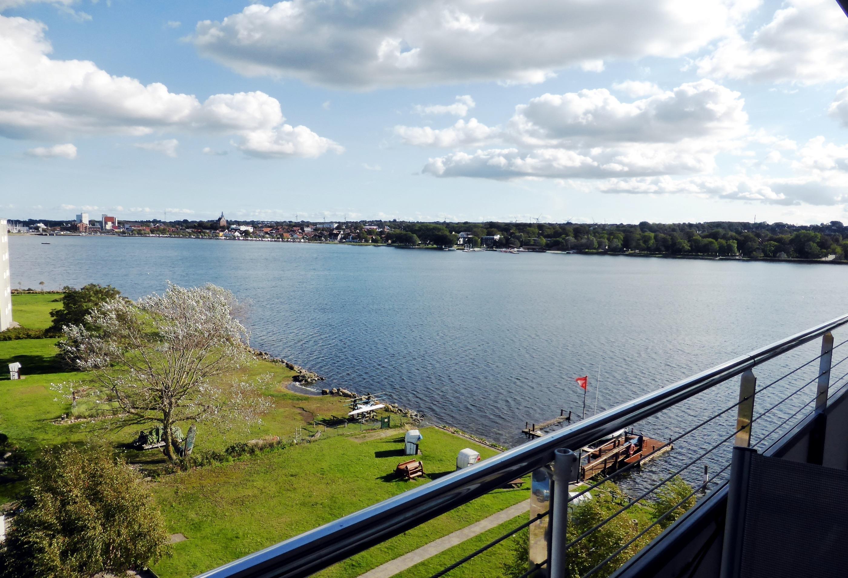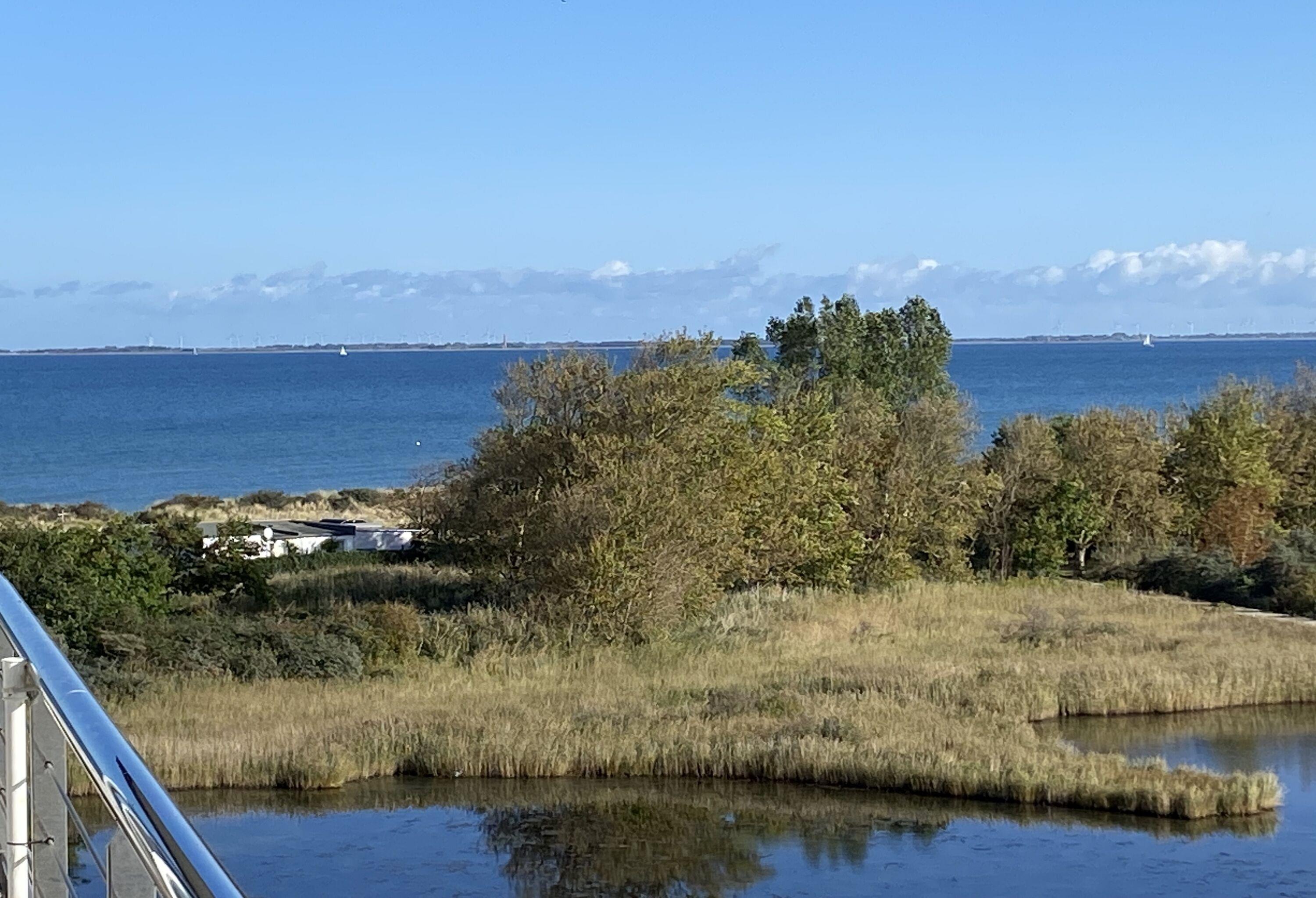 Der möblierte Balkon bietet einen traumhaften Ausblick auf den Binnensee mit Heiligenhafen als Hintergrund, sowie der Blick auf ein Biotop, dann die Ostsee mit der Insel Fehmarn.