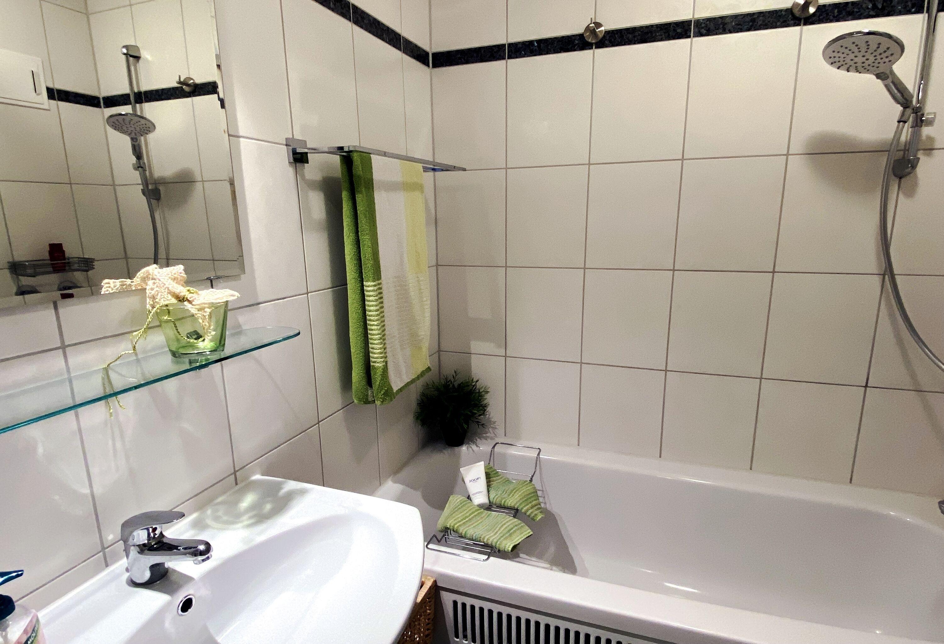 Bad mit Wanne, Haartrockner und viel Abstellmöglichkeiten