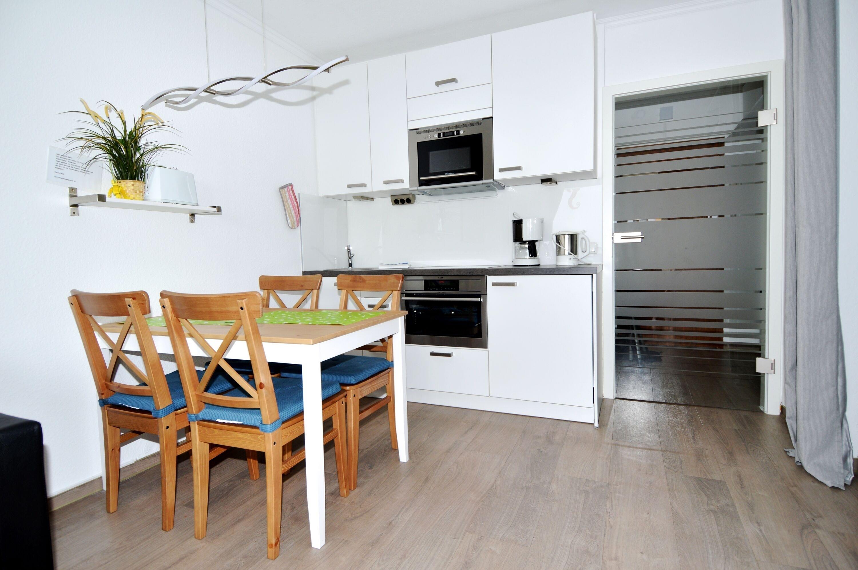 Die helle Küche bietet unter anderem ein Cerankochfeld und einen Backofen. Vom Westbalkon aus genießen Sie seitlich Blick auf den Binnensee. Zur Wohnung gehört ein eigener Parkplatz. Gerne dürfen Sie Ihren (kleinen) Hund mitbringen.