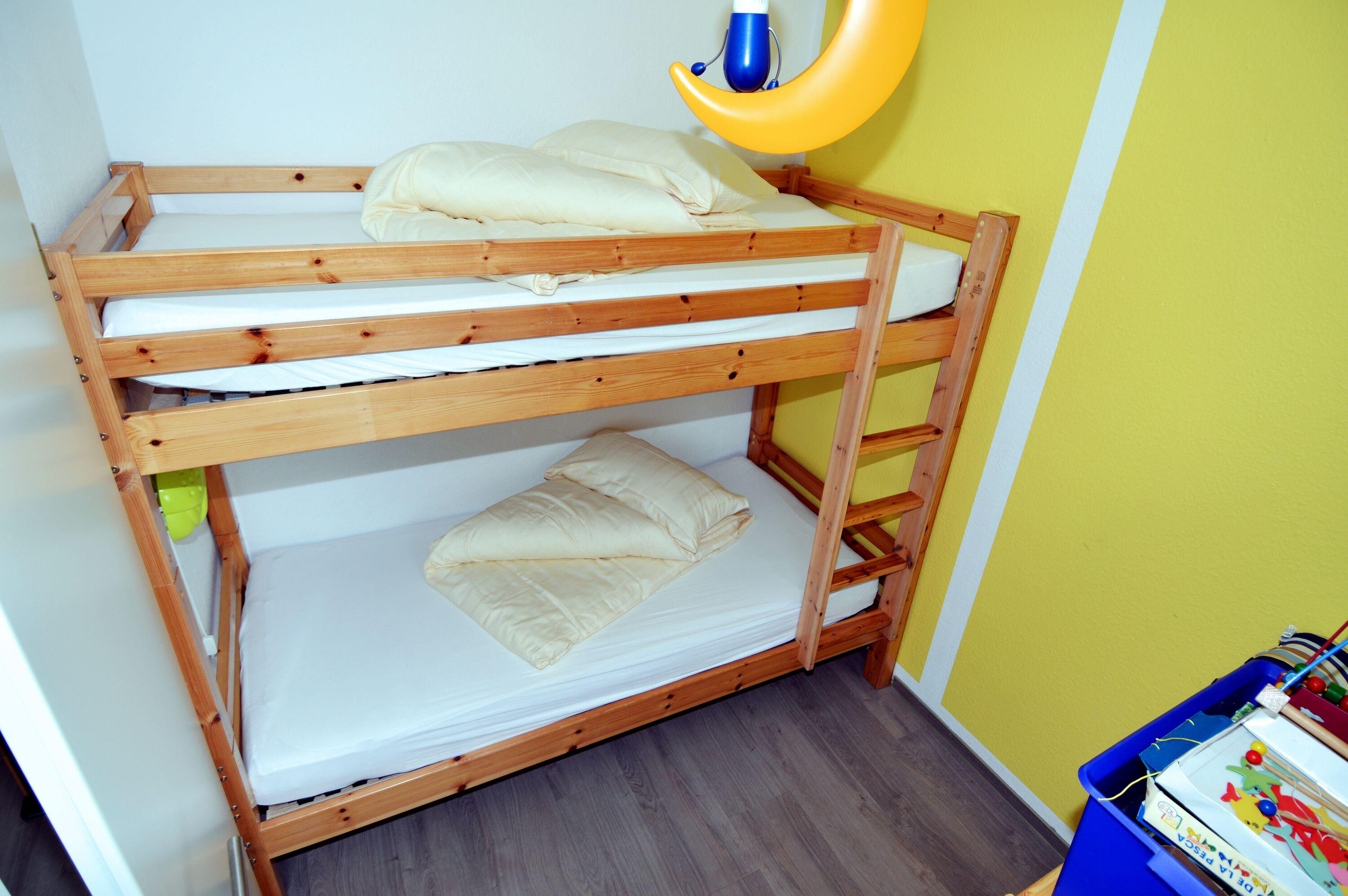 Dieses süße Apartment bietet Platz für 2 Erwachsene + 2 Kinder. Im separaten Kinderzimmer gibt es ein Etagenbett. Der Elternschlafbereich bietet zwei Einzelbetten und ist durch ein Regal und einen Vorhang optisch vom Wohnbereich getrennt.