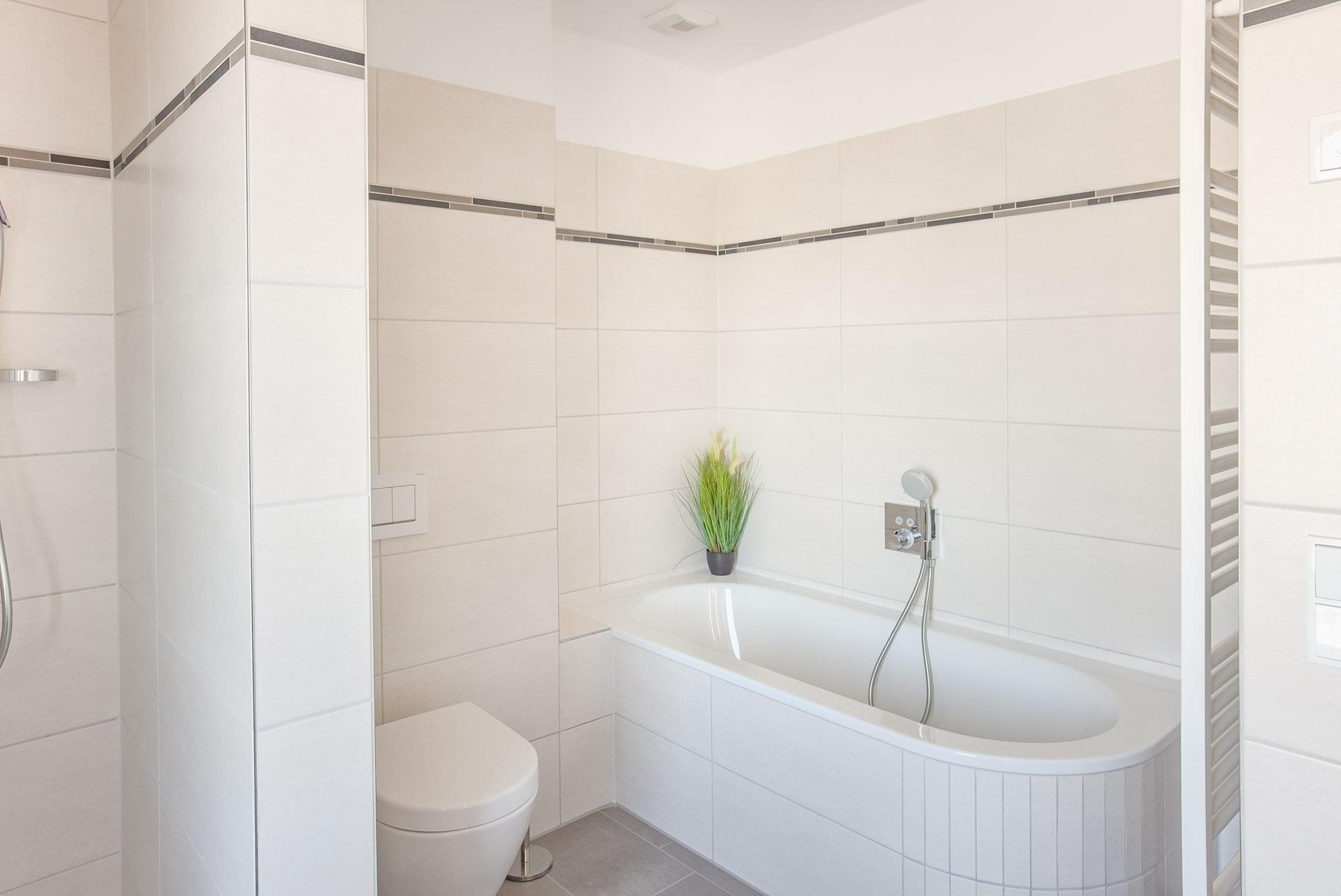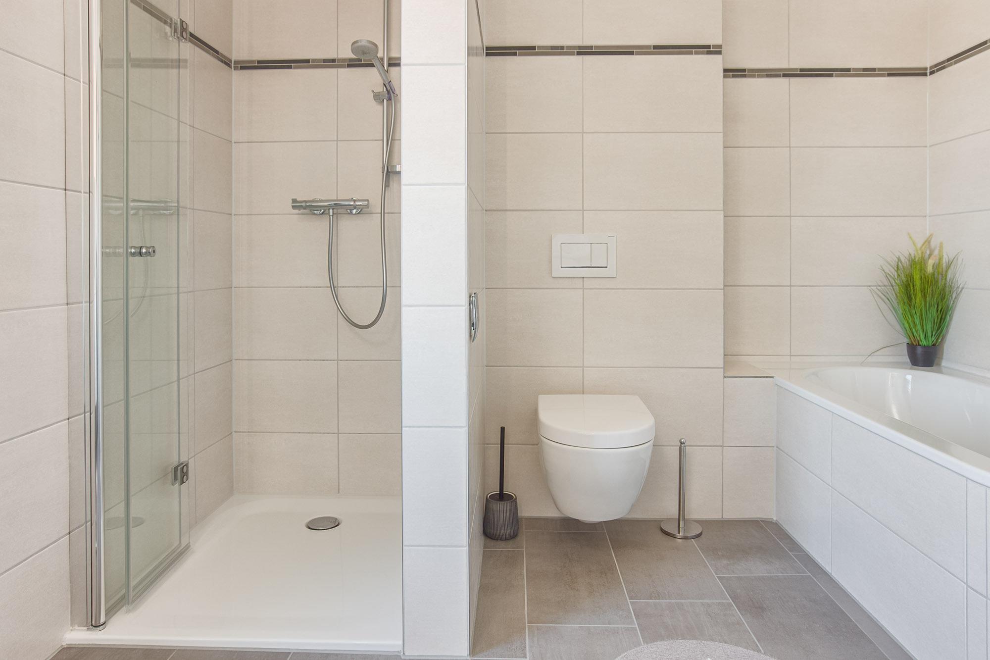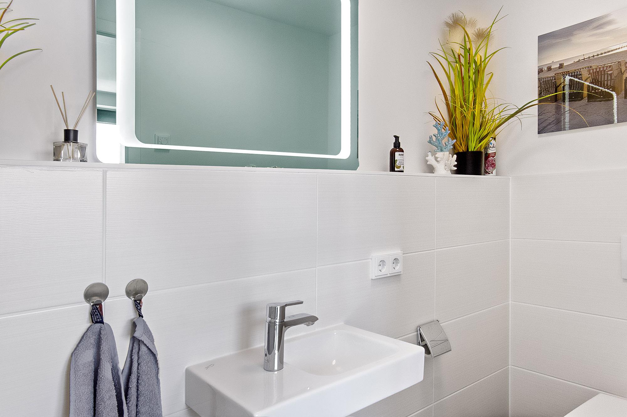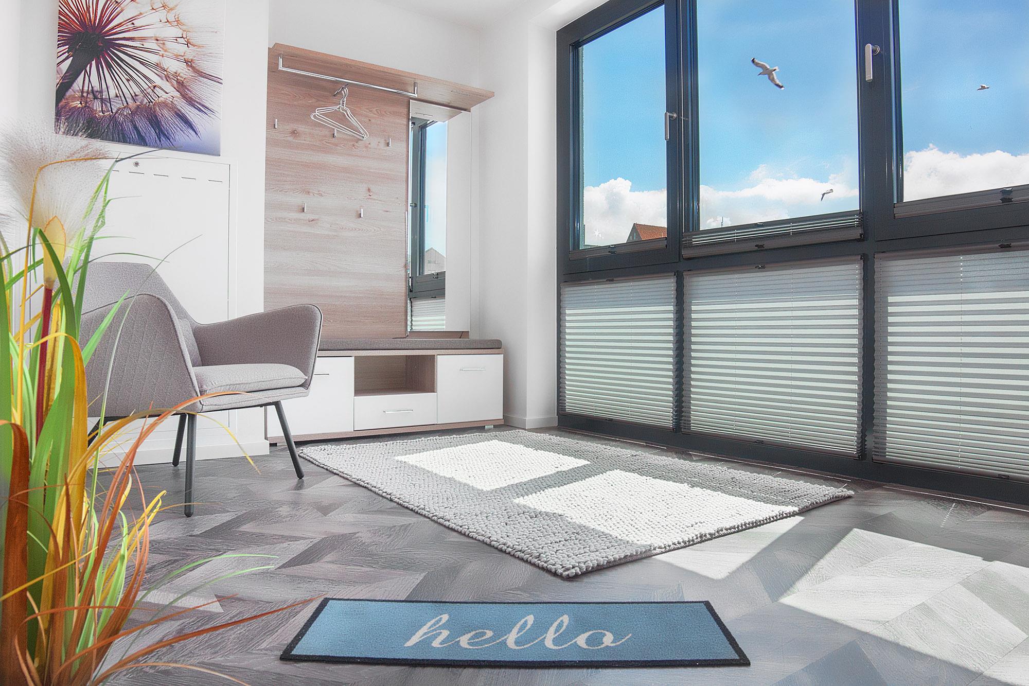 Das Badezimmer mit ebenerdiger Dusche, Wanne, Handtuchwärmer und Jachthafenblick bietet entsprechende Annehmlichkeiten. Entspannen geht hier wie von allein! Zum Komfort gehört zudem ein separates Gäste-WC und eine Waschmaschine. Auch Flur und die Garderobe beeindrucken.