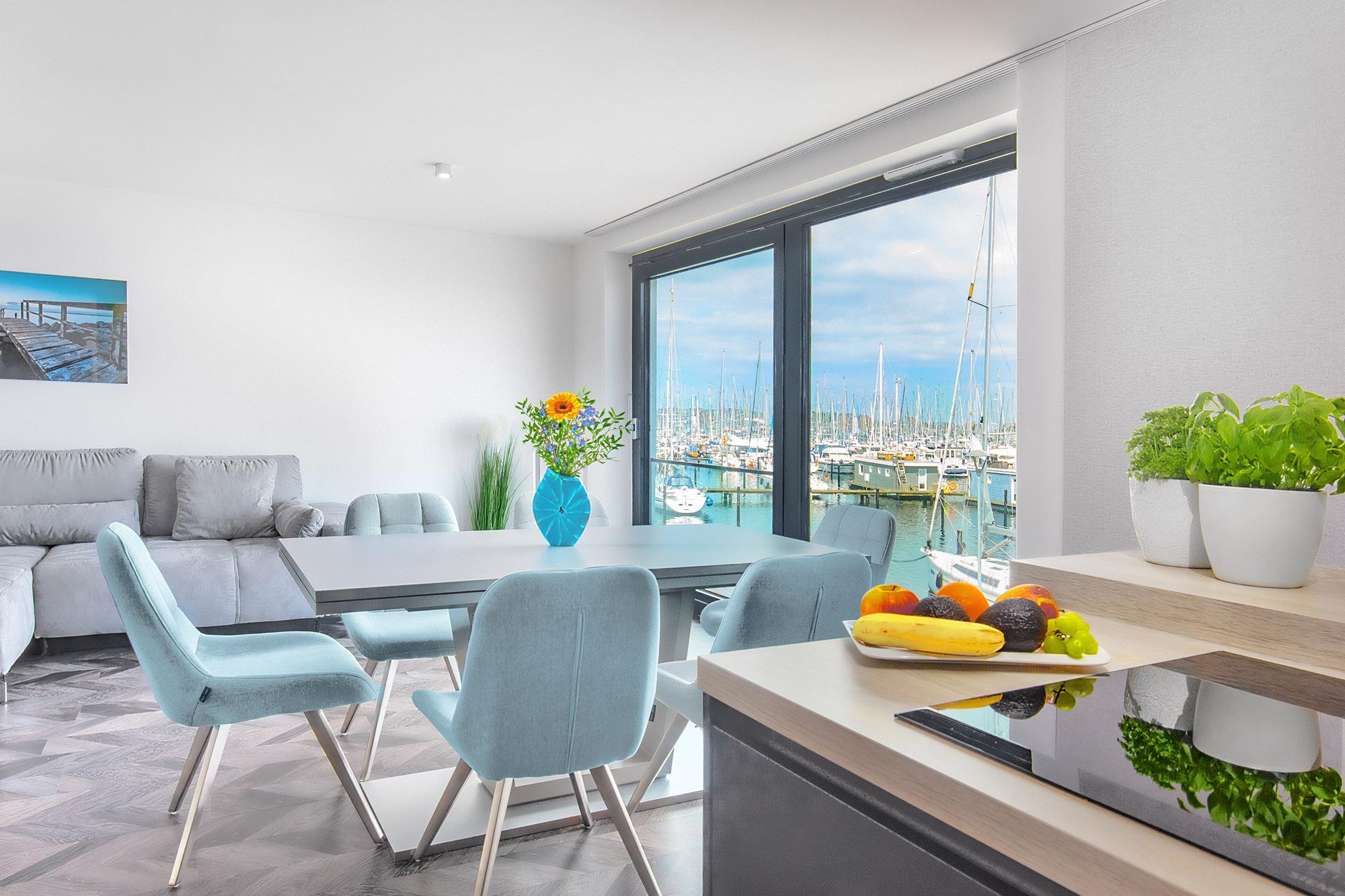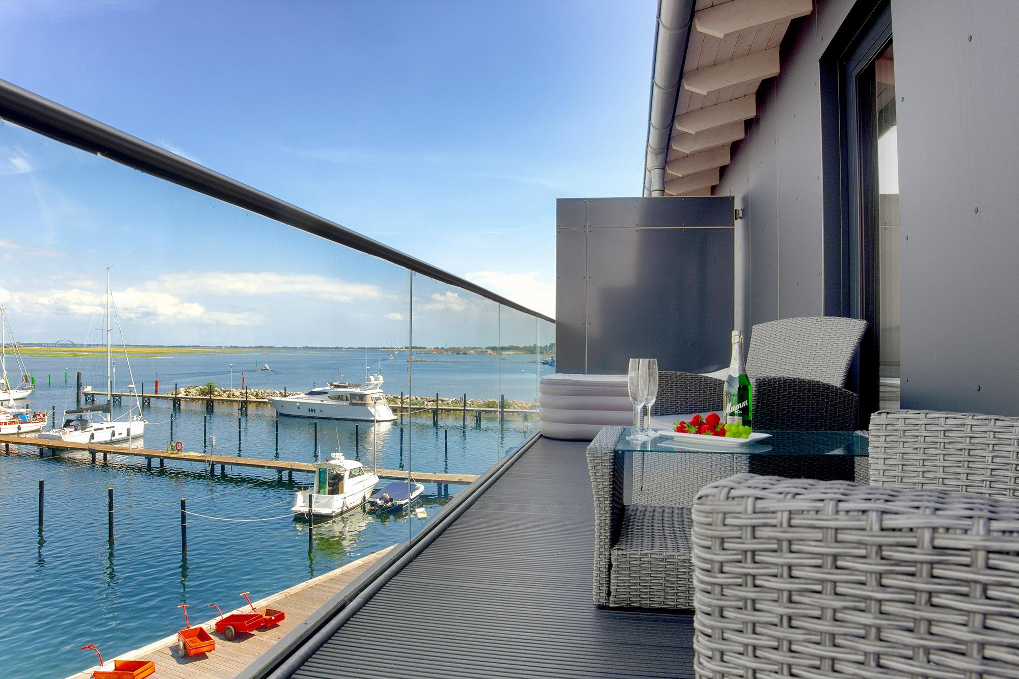 Die exklusive Maisonette-Ferienwohnung Stressless erstreckt sich auf zwei Ebenen mit ca. 111 m² über das 1. OG und Staffelgeschoss, mittels einer innenliegenden Treppe. Der moderne und großzügige Wohnbereich mit besonderer Einrichtungslinie bietet Ihnen einen fantastischen Panoramablick über den Jachthafen und die Ostsee. Näher am Wasser kann man nicht Urlaub machen!