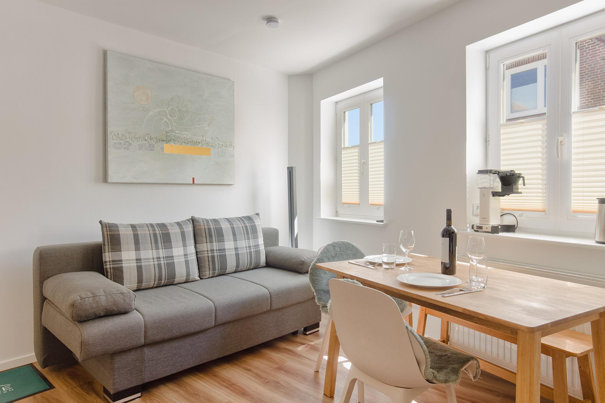 Die Regelbelegung ist für 2 Personen. Durch die vorhandene Schlafcouch steht jedoch zum einen eine Fluchtmöglichkeit bereit, sofern das Schnarchen des Mitmenschen zu heftig ist. Zum anderen ist in Ausnahmefällen auch eine Belegung mit maximal 3 Erwachsenen gegen Aufpreis möglich. Jeder Raum hat 2 Fenster, die zum Sichtschutz und zur Verdunklung mit Plissees ausgestattet sind.