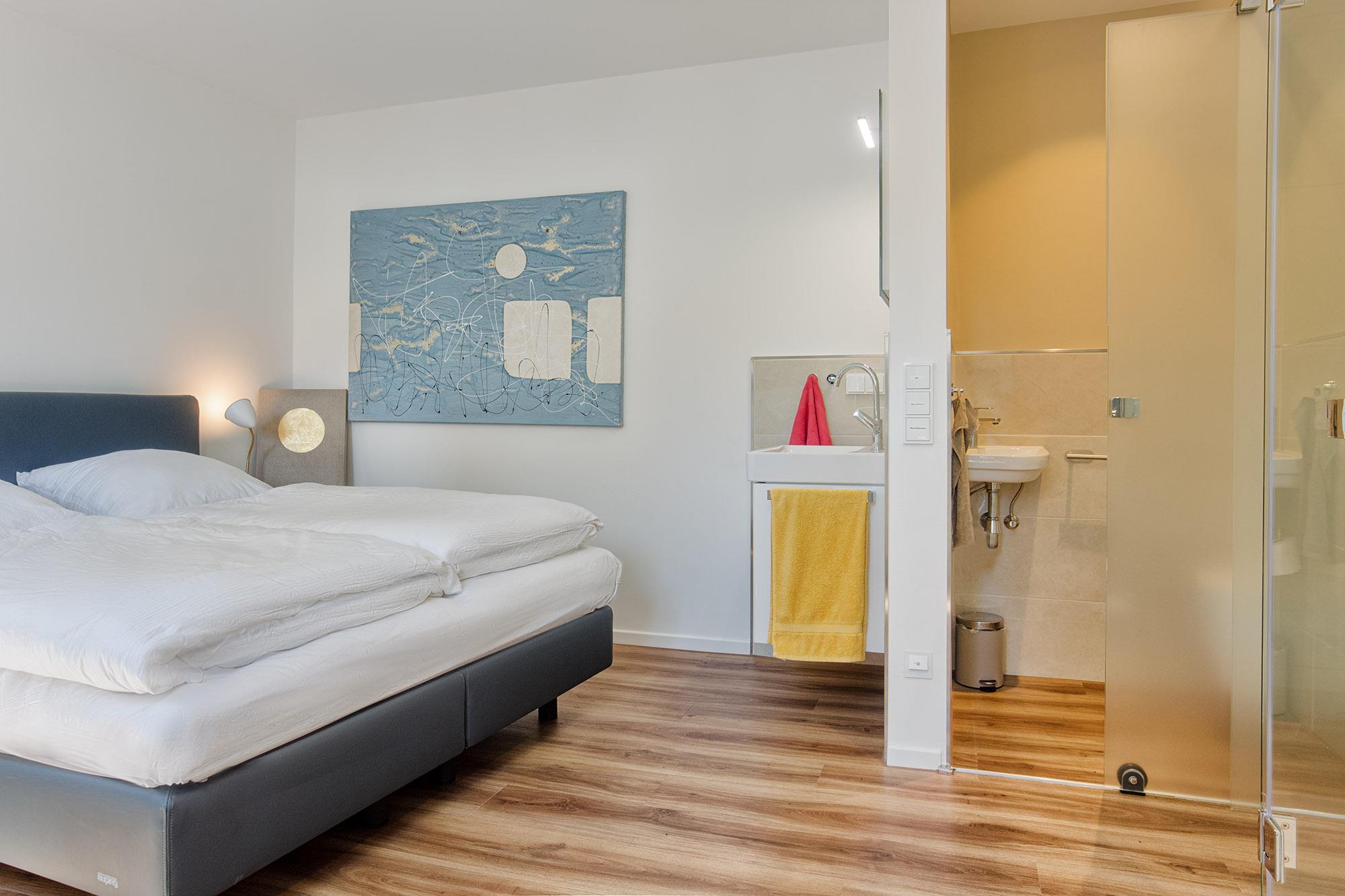 Die vollverglaste, ebenerdige Dusche sowie das Waschbecken befinden sich im Schlafzimmerbereich. Der kleine WC-Bereich mit Geberit-WC und Handwaschbecken ist privatissime vom Schlafbereich durch eine Schiebetüranlage mit Sandstrahlglas abgetrennt.