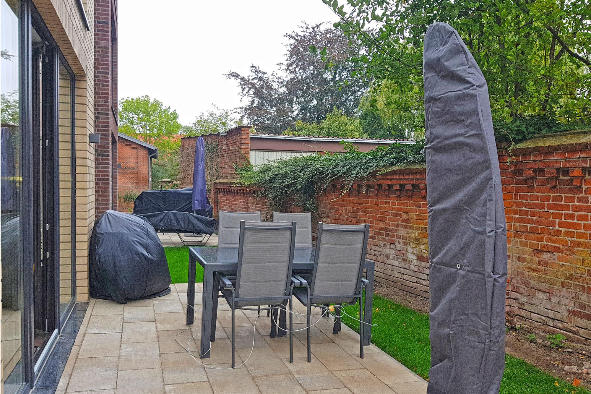 Der gemütliche Wohnbereich ist mit einer bequemen Couch, HD-TV und WLAN ausgestattet. Große, bodentiefe Fenster lassen viel Tageslicht in die Wohnung und bieten einen schönen Blick auf die möblierte Terrasse mit Grill und den nutzbaren Gartenbereich – der perfekte Ort für entspannte Stunden an der frischen Ostseeluft.