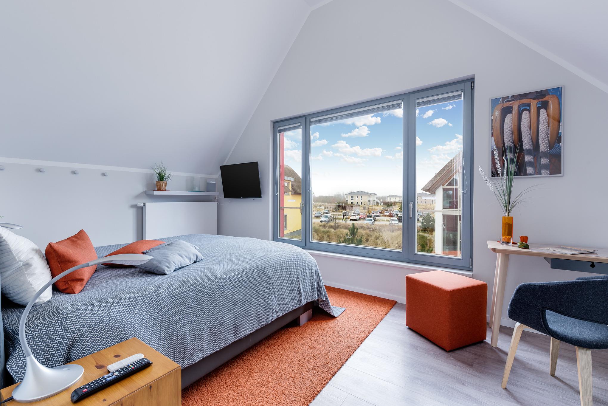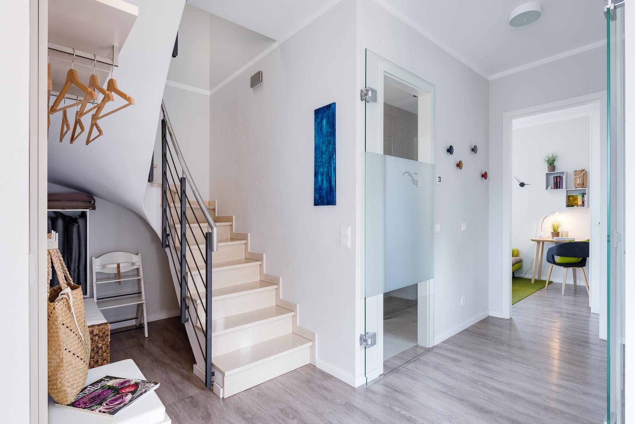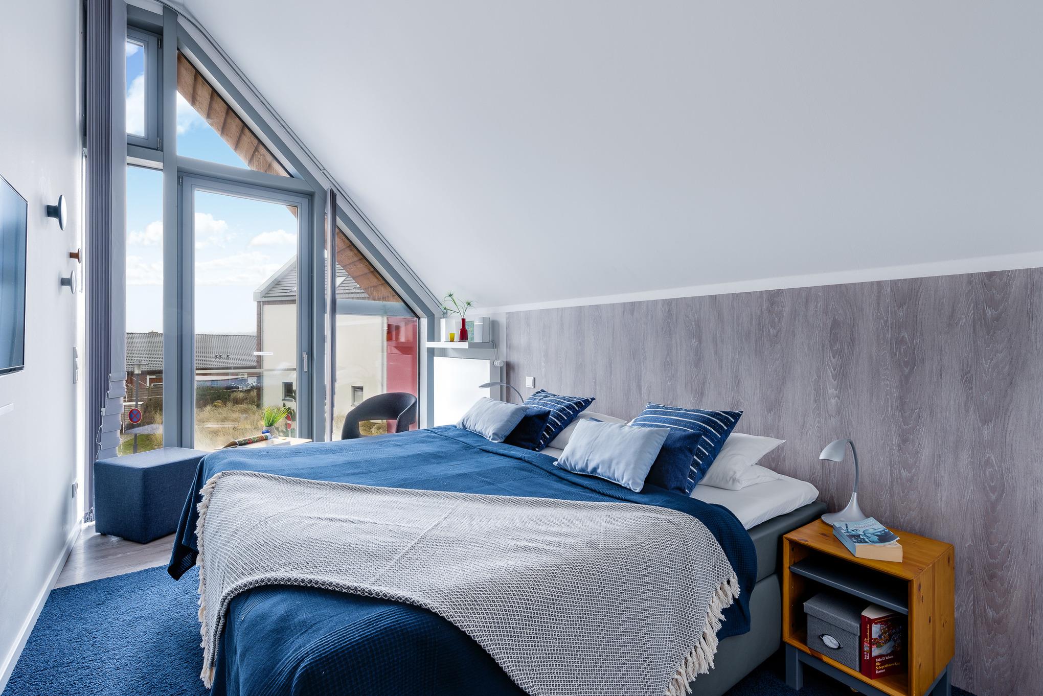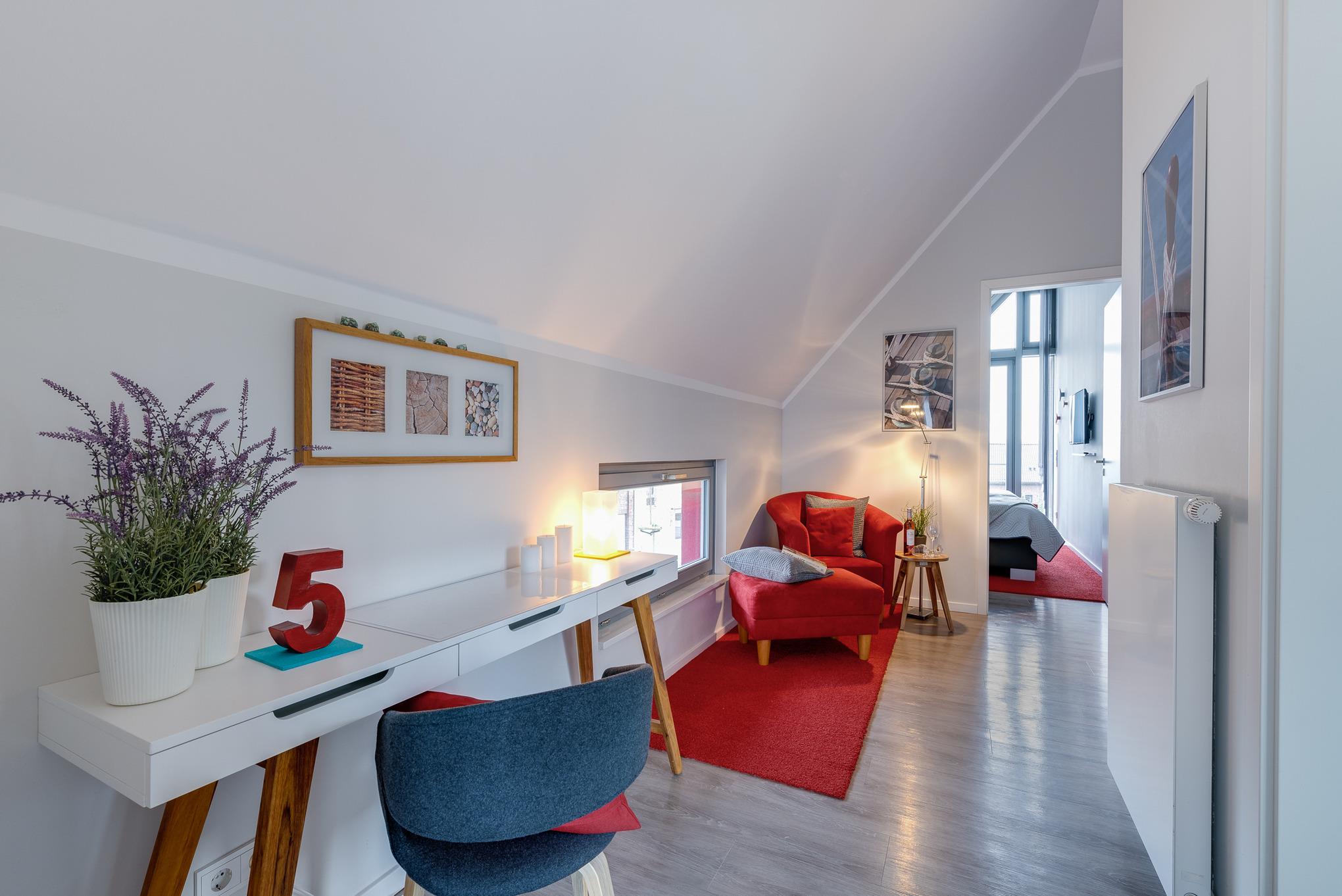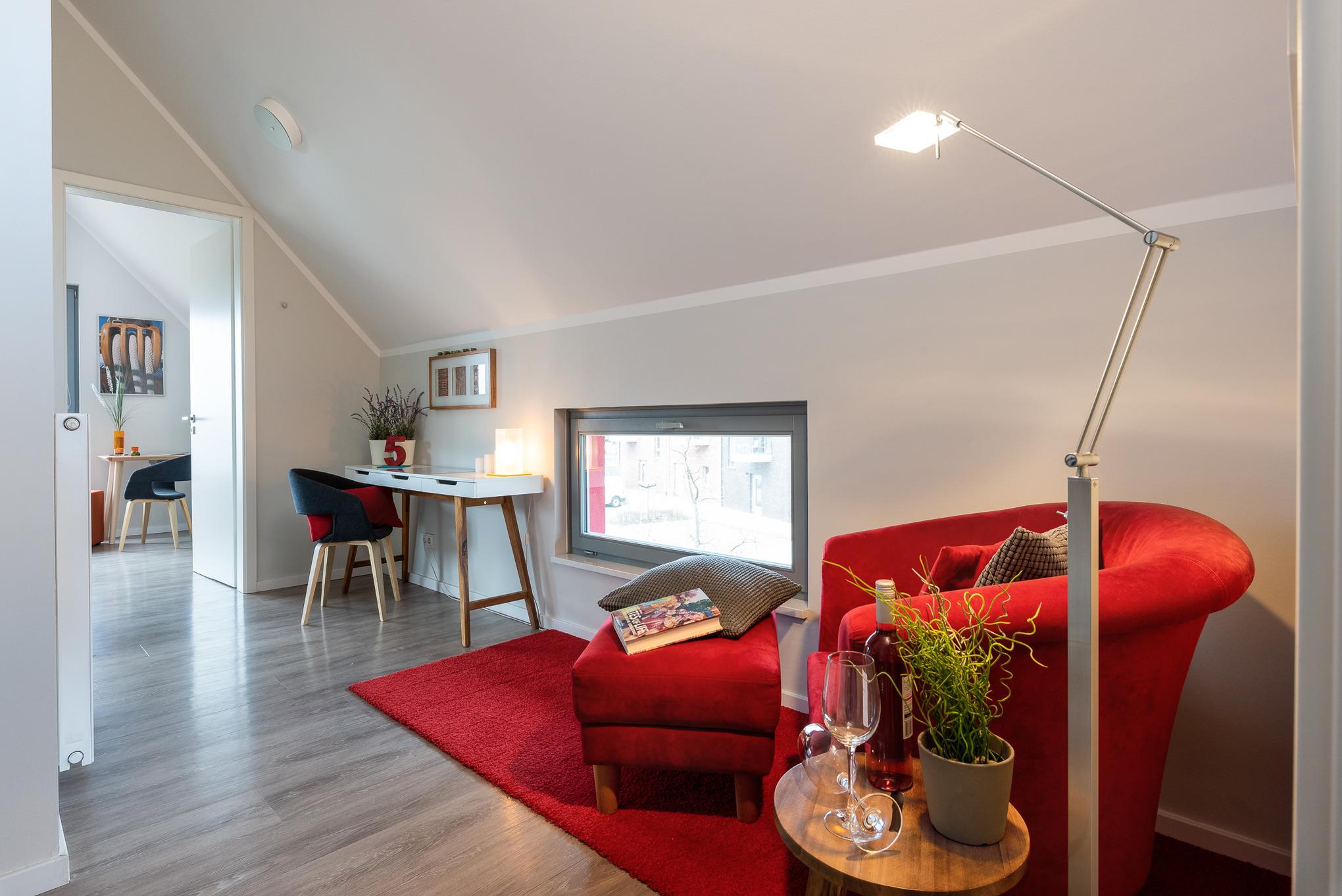 Schon von weitem leuchtet Ihnen das freistehende rote Einzelhaus in zentraler Lage entgegen. Zwei Terrassen sind in einen eigenen, einer Dünenlandschaft nachempfundenen, Garten eingebettet. Innen erwartet Sie auf zwei Etagen eine helle, großzügige Wohnung mit hochwertiger moderner Ausstattung.