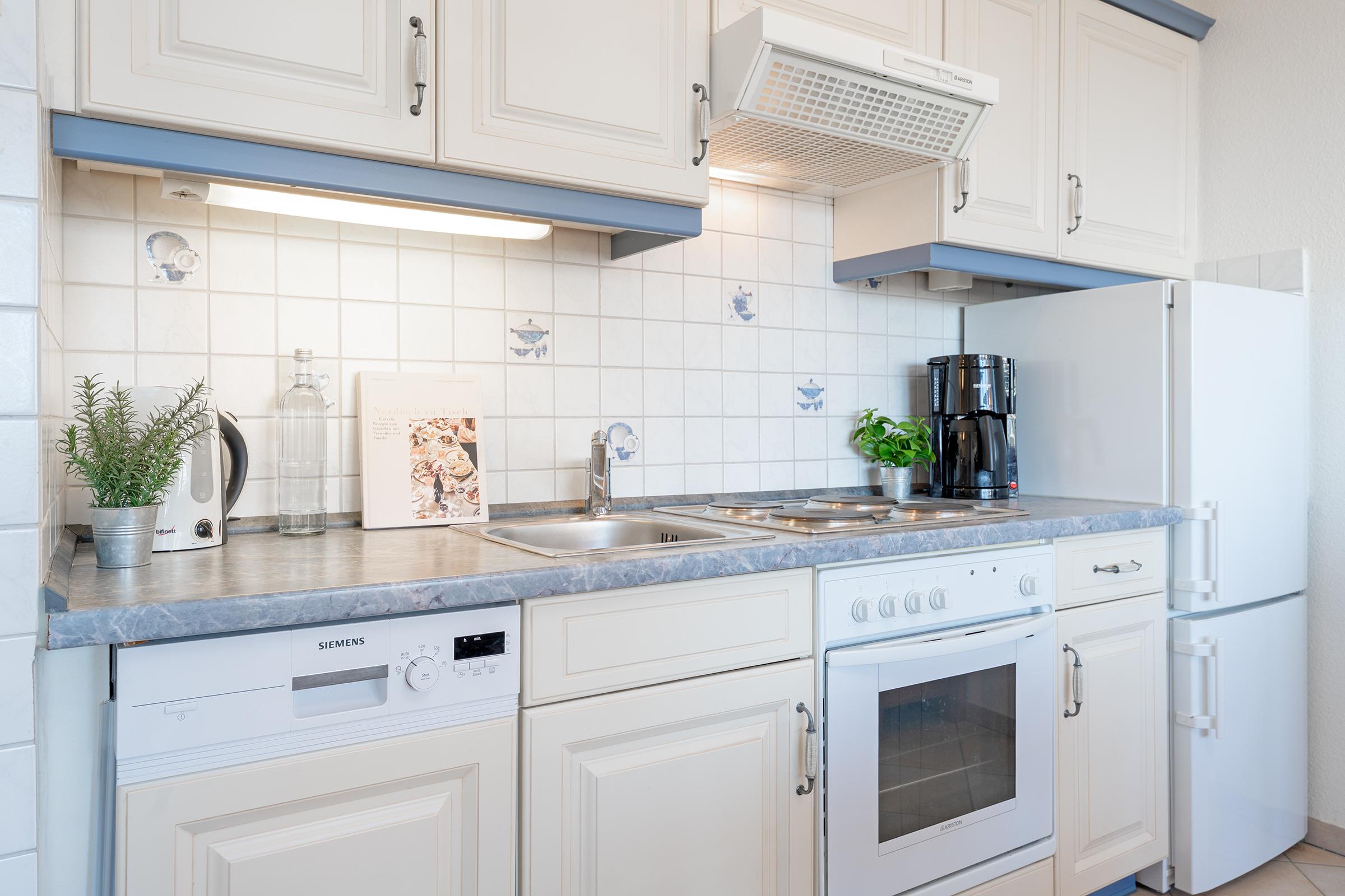 Die angrenzende Küche ist vollständig ausgestattet und lässt keine Wünsche offen: Ein Cerankochfeld, ein Backofen, eine Spülmaschine sowie eine Kaffeemaschine, ein Wasserkocher und ein Toaster stehen für die Zubereitung Ihrer Mahlzeiten bereit. Ein komfortables Schlafzimmer mit gemütlichem Doppelbett sorgt für erholsame Nächte. Das zweite Schlafzimmer verfügt über ein Etagenbett. Das moderne Badezimmer ist mit einer Dusche mit Wanne, Waschbecken, WC und Haartrockner ausgestattet. Eine gemeinschaftliche Waschmaschine und ein Trockner stehen gegen Gebühr zur Verfügung.