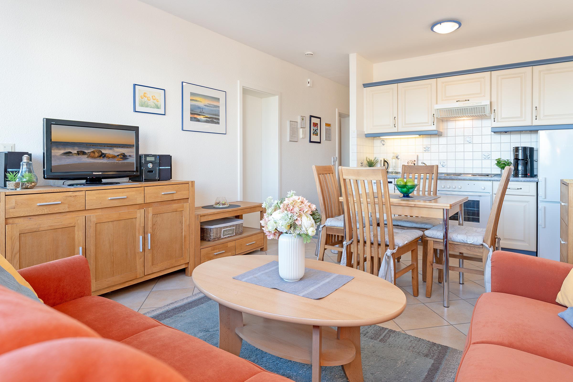 Diese gemütliche Ferienwohnung im 1. Stock lädt zu einem entspannten Aufenthalt an der Ostseeküste ein. Der offene Wohnbereich ist stilvoll eingerichtet und bietet mit einem gemütlichen Sofa, einem TV sowie einem Essbereich den idealen Ort für gemeinsame Stunden. Vom Wohnzimmer gelangen Sie auf den überdachten Balkon, von dem aus Sie einen wunderbaren Blick auf das Meer genießen können – perfekt, um den Tag mit einer Tasse Kaffee zu beginnen oder einem Glas Wein ausklingen zu lassen.
