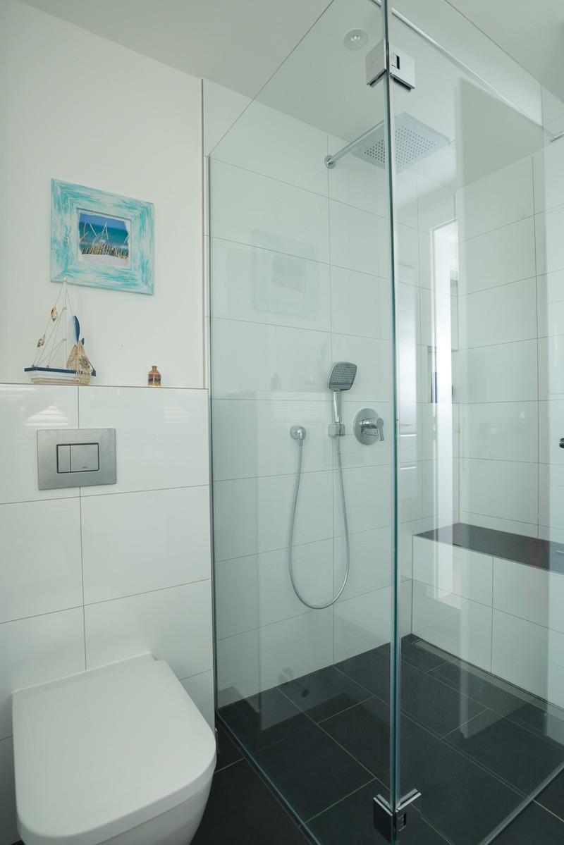 Im Flurbereich steht Ihnen ein Einbauschrank, bestehend aus Garderobe, Spiegel und Schuhschrank, zur Verfügung. Das Bad mit einem Fenster zum Hafen bzw. zur Innenstadt verfügt über eine große und helle Dusche mit Regenbrause, Handbrause, geflieste Sitzbank und einer Verglasung mit Pendeltür.