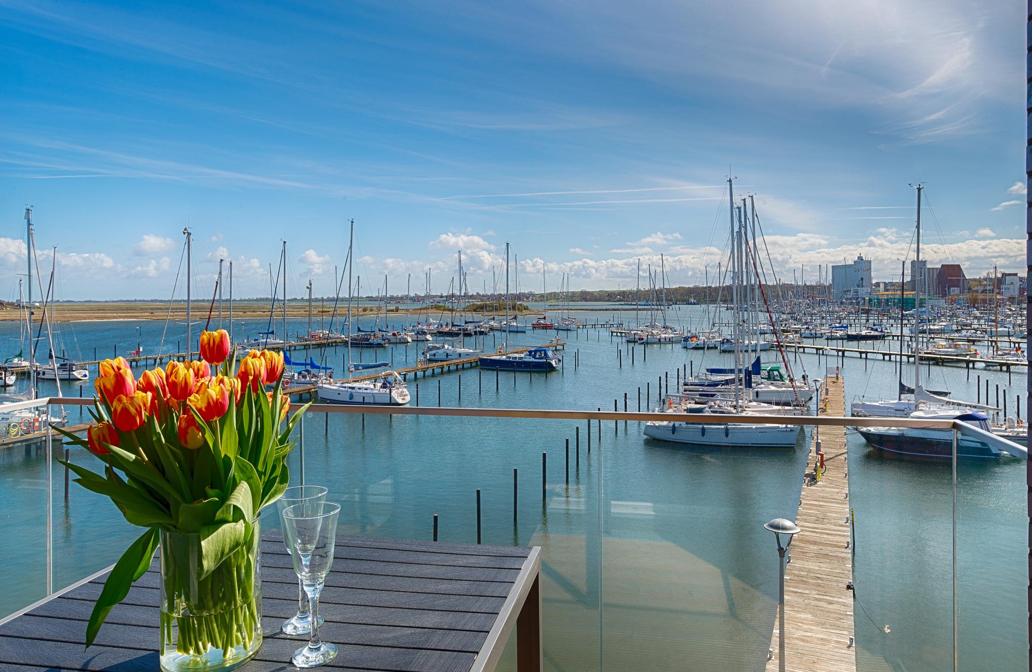 Lassen Sie Ihren Blick über den Jachthafen, den Binnensee, das Meer und bishin zur Fehmarnsundbrücke schweifen.