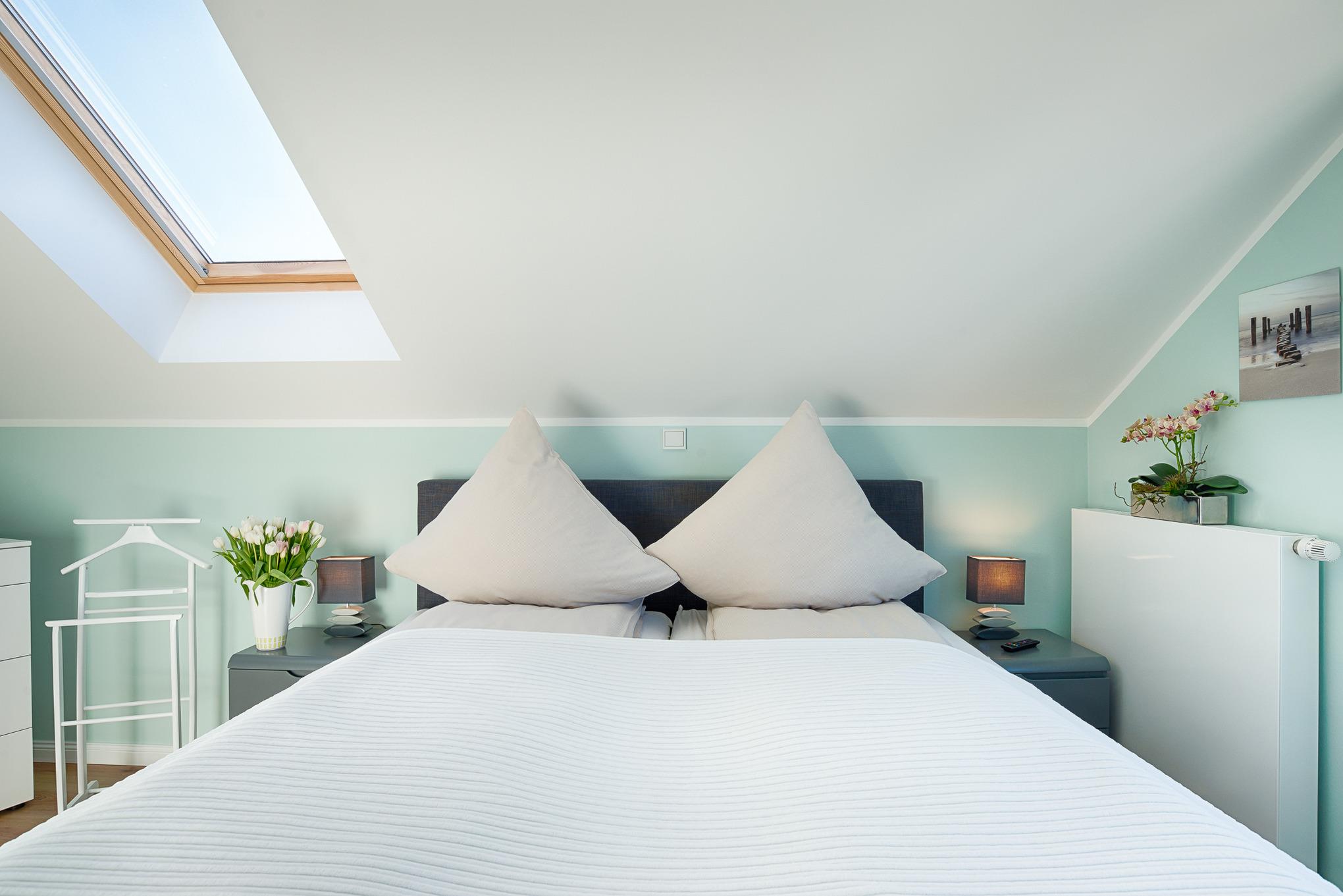 Zwei Schlafzimmer mit Boxspringbetten fördern ausreichenden und erholsamen Schlaf. Ein Kinderreisebett und ein Hochstuhl sind ebenfalls vorhanden.