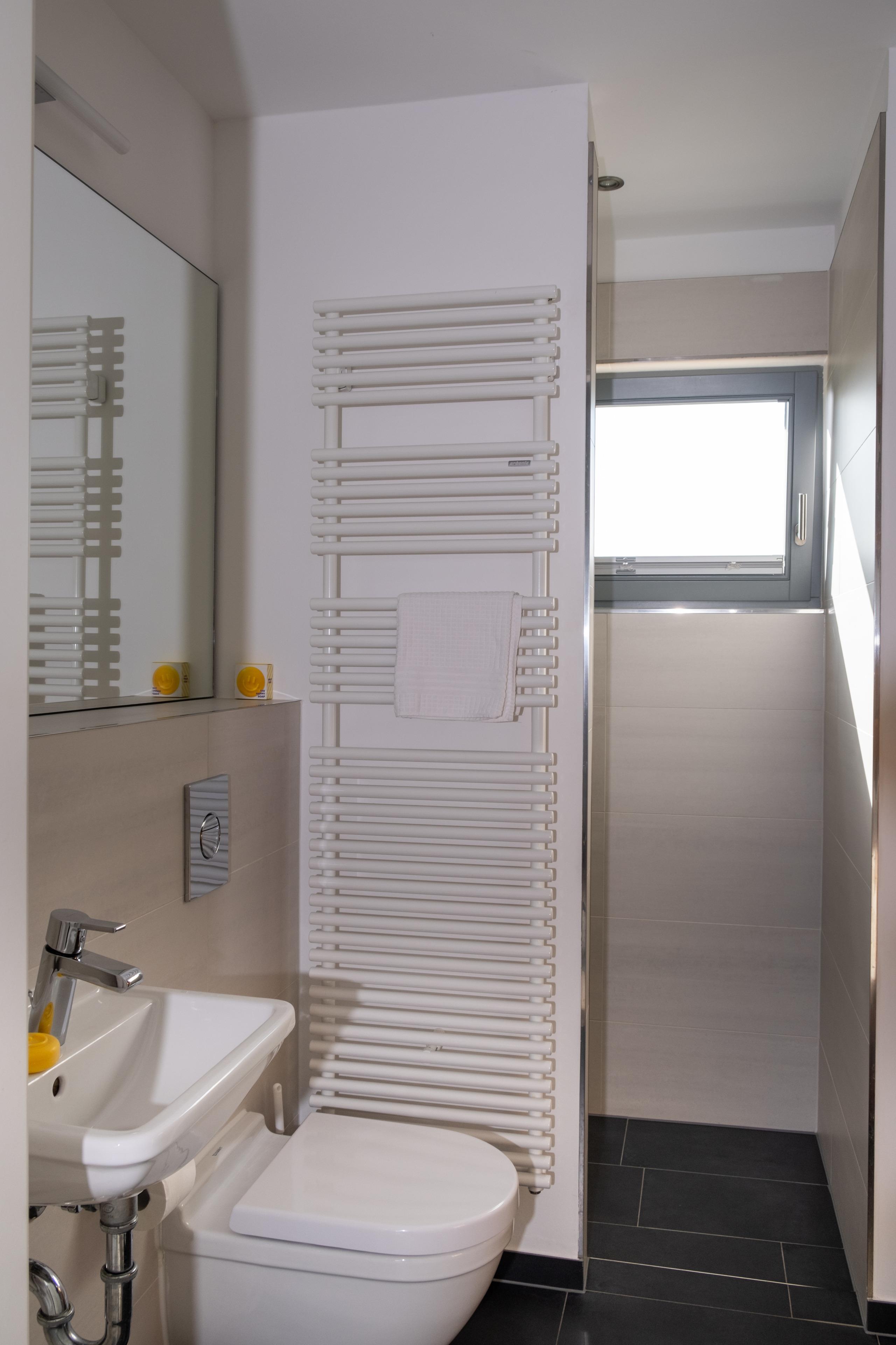Das obere Bad verfügt über Dusche und Badewanne sowie über einen Waschtrockner.