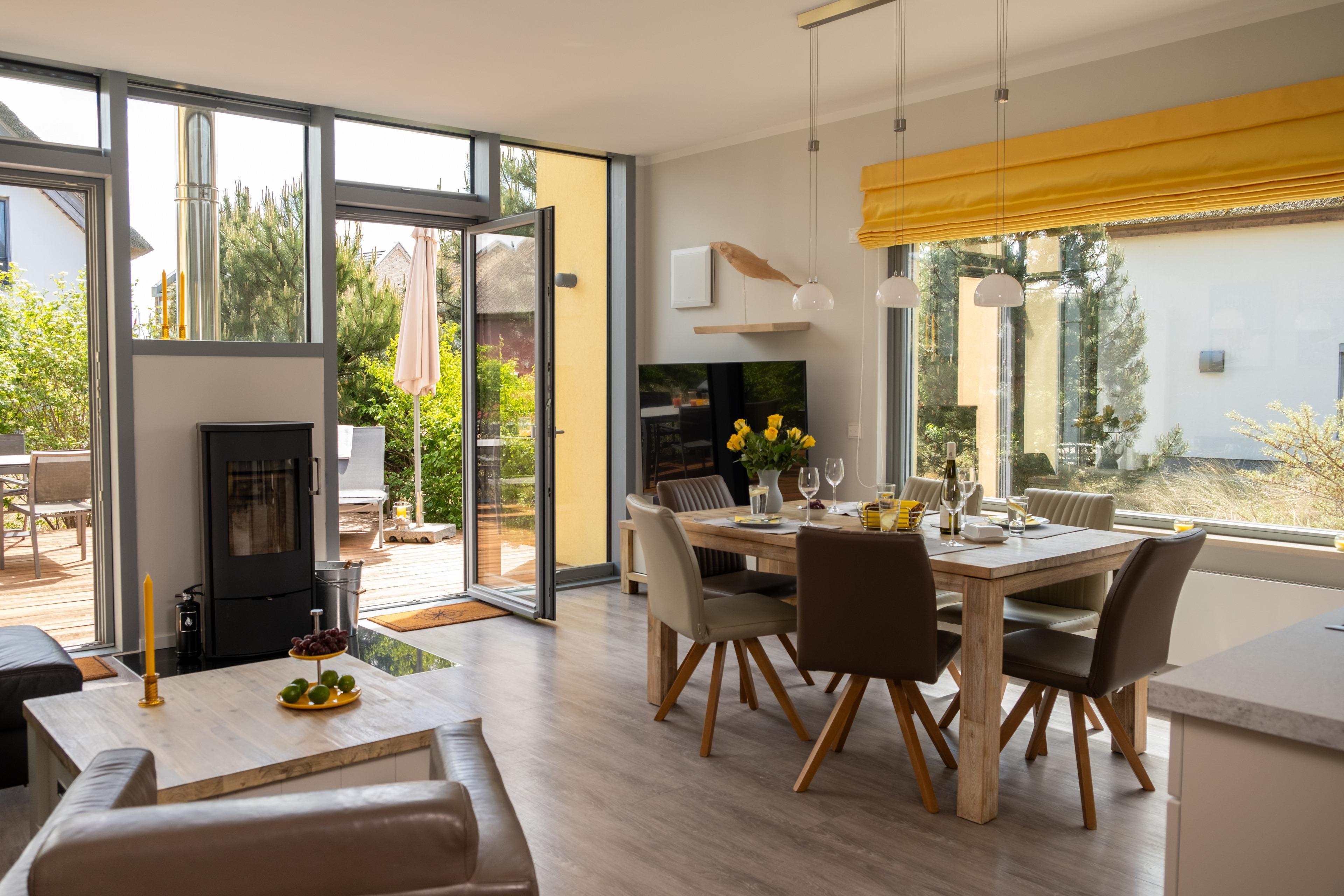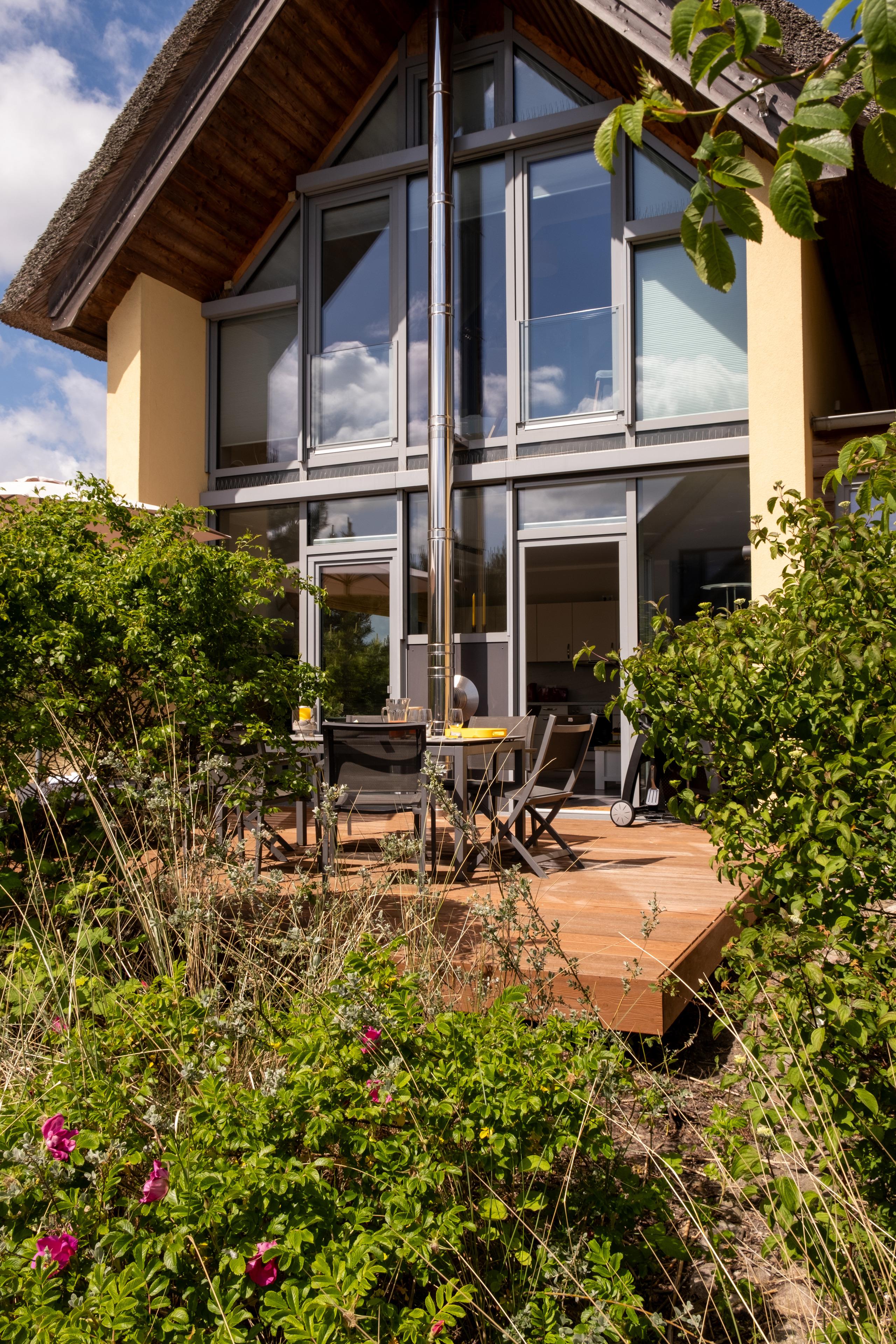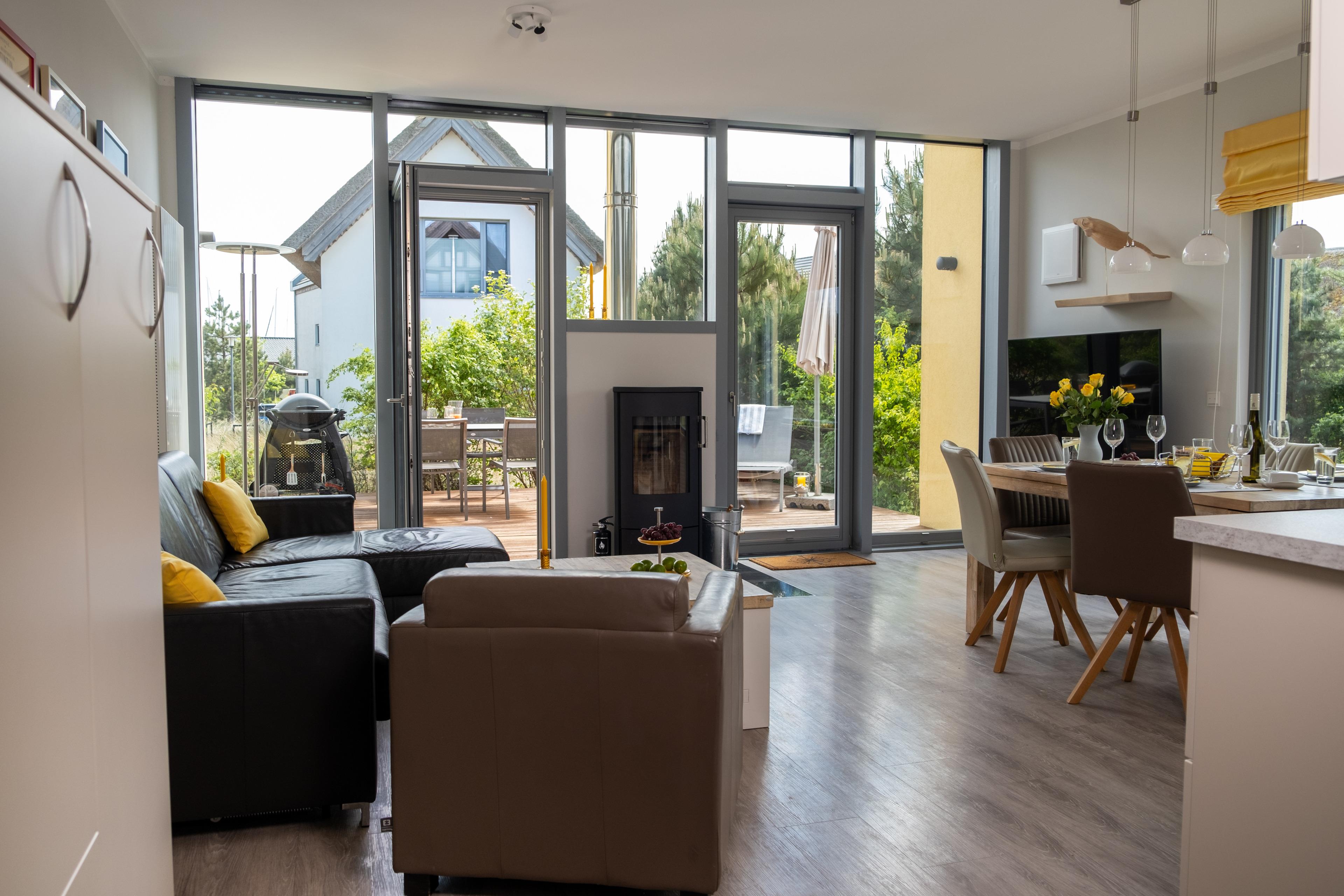 Das Sofa lässt sich einfach und schnell in ein Doppelbett (140x190) verwandeln. In der kalten Jahreszeit sorgt ein Kamin für Wärme und Gemütlichkeit, in den warmen Monaten bietet die große Holzterrasse mit hochwertigen Gartenmöbeln und Weber-Grill viel Platz für das Leben an der frischen Ostseeluft.