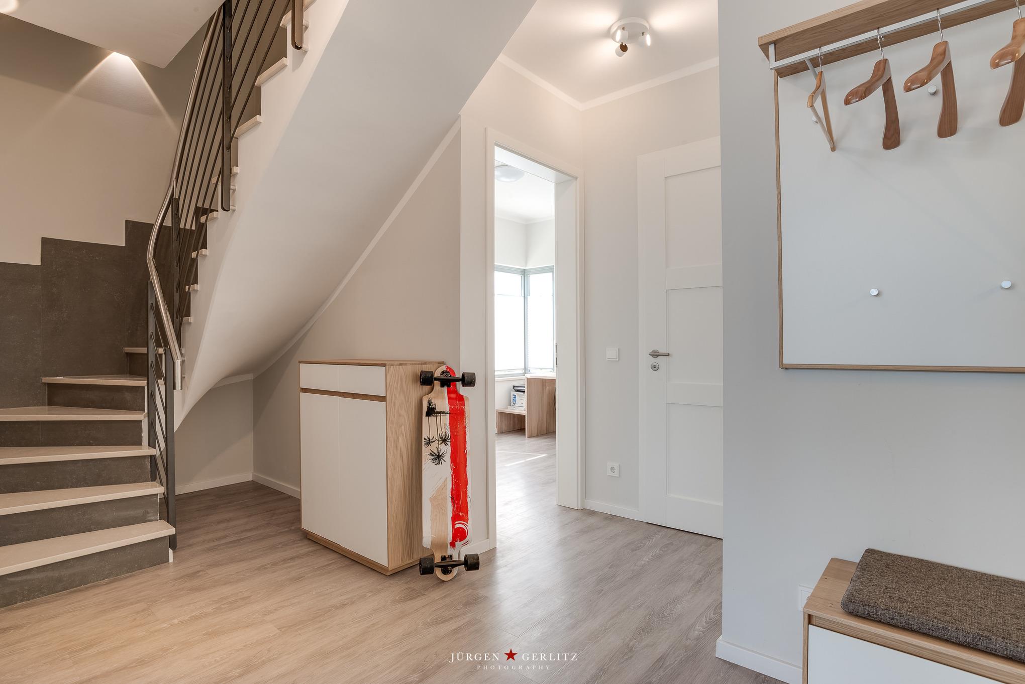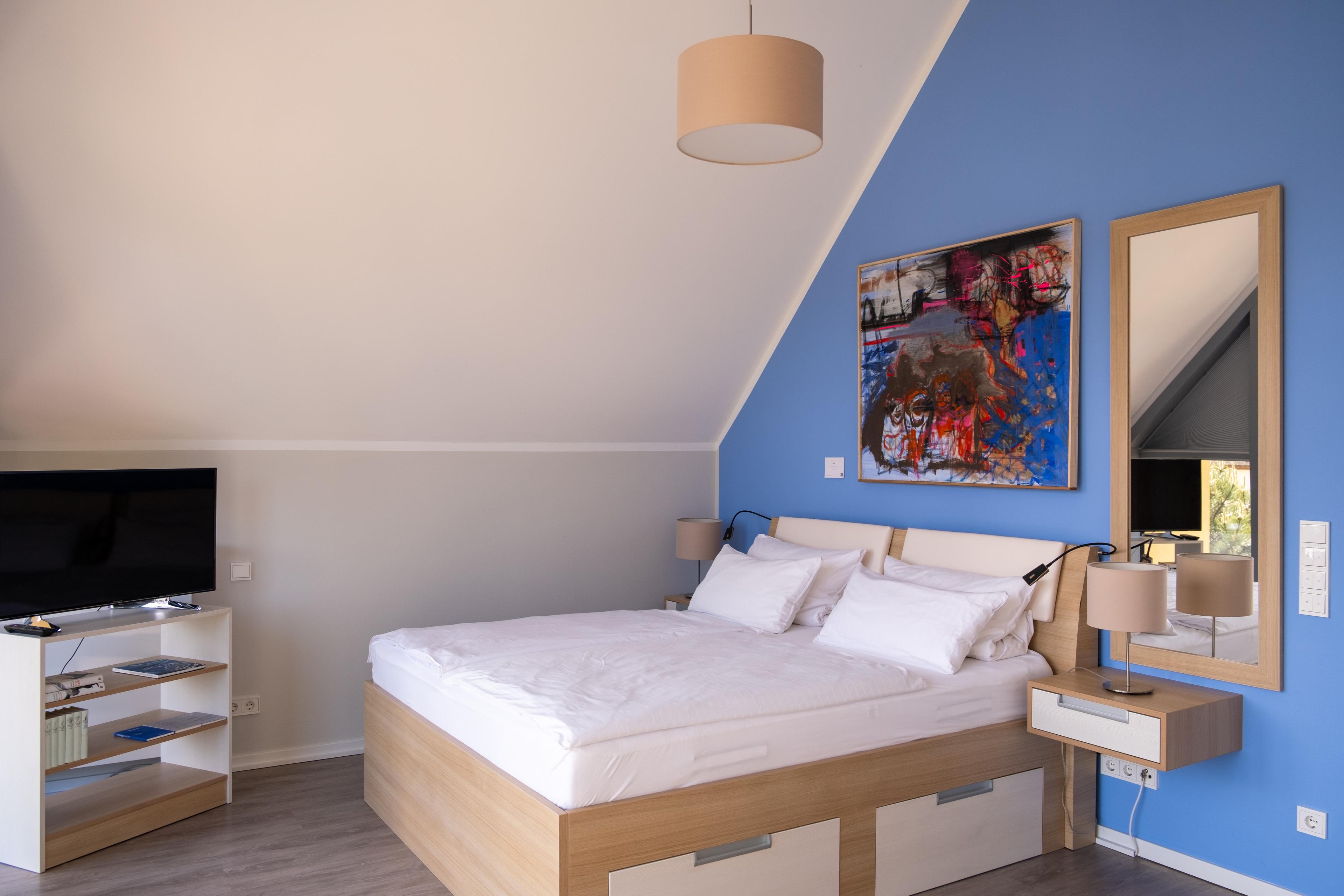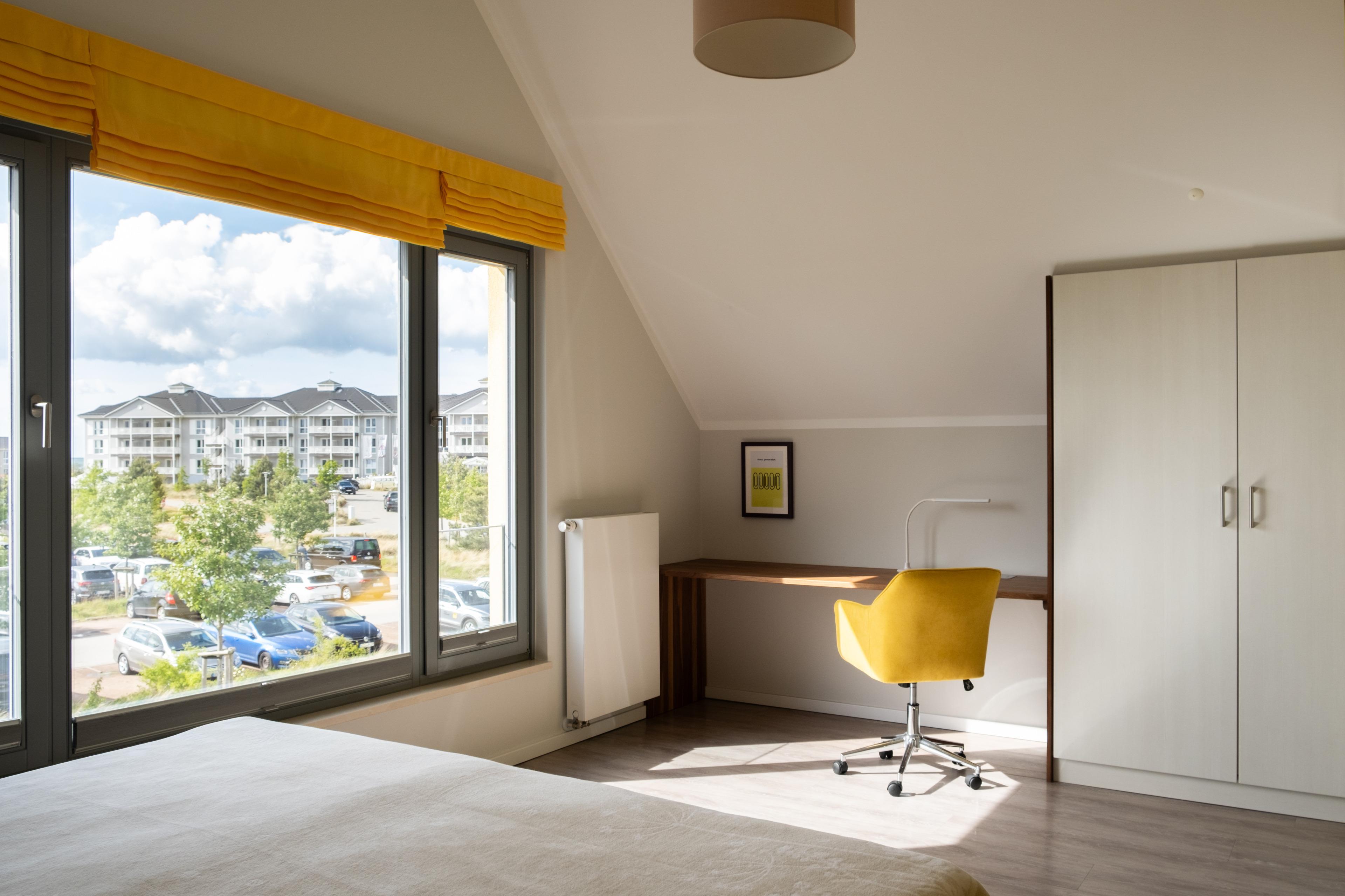 Das geräumige, helle Ferienhaus ist hochwertig ausgestattet. In der oberen Etage liegen zwei Schlafzimmer mit komfortablen Boxspringbetten. Im ersten Schlafzimmer stehen ein Doppelbett und ein Kleiderschrank mit Safe. Dieses Zimmer ist mit einem Fernseher ausgestattet. Im zweiten Schlafzimmer besteht die Möglichkeit, die Betten einzeln zu stellen. Auch hier befindet sich ein Kleiderschrank.