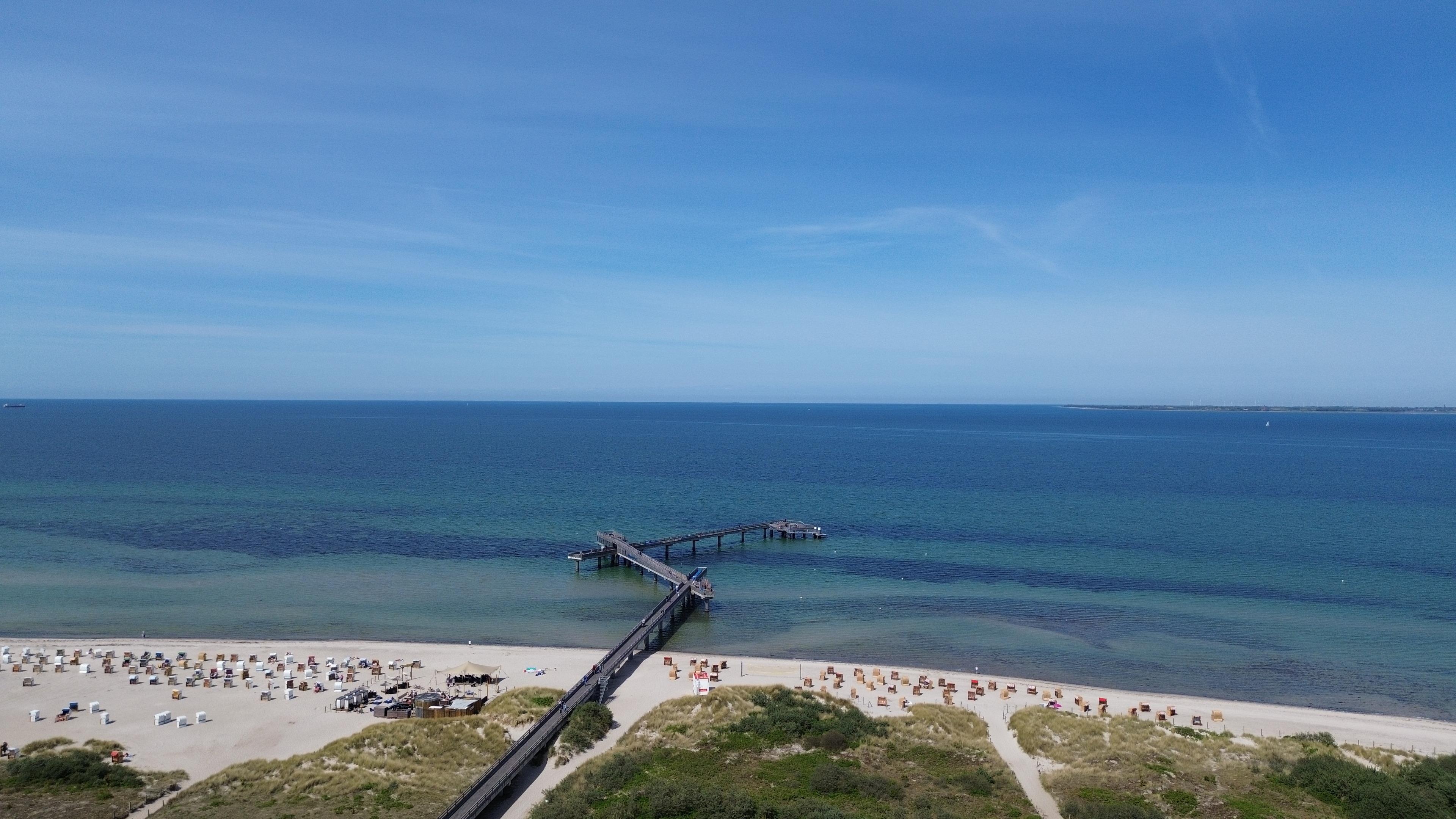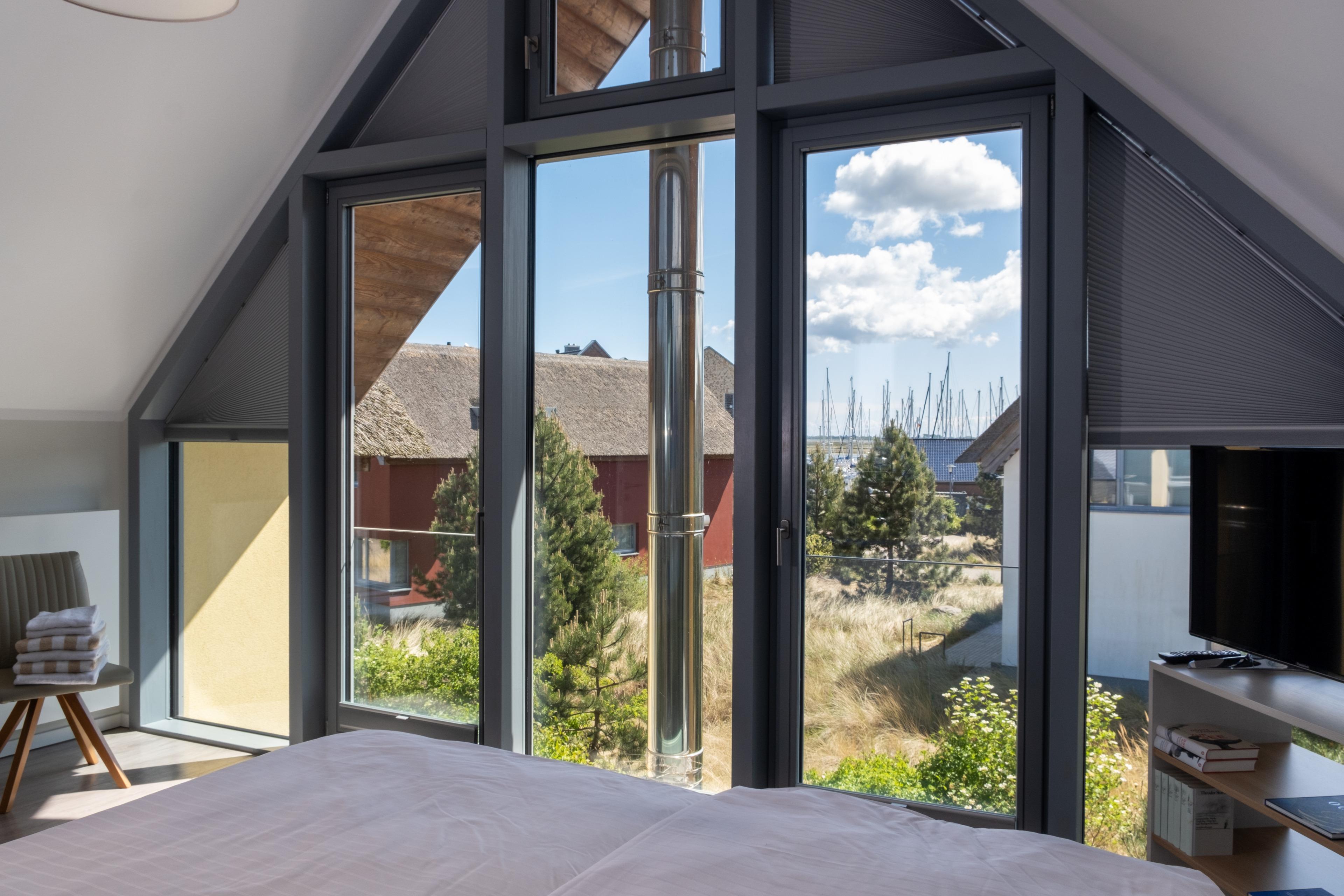 Der Blick fällt auf den Binnensee, den Yachthafen oder zum Teil auf die Ostsee.