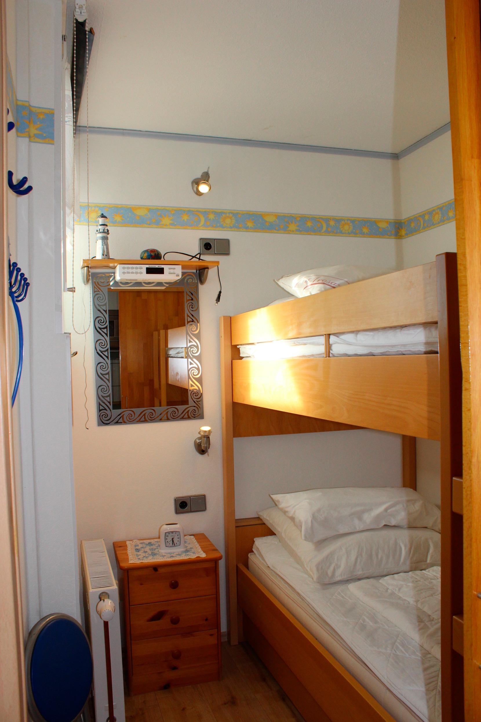 Ferienwohnung im Ferienpark Haus P, Erdgeschoss, für bis zu 4 Personen. Die Wohnung ist mit Laminatboden ausgestattet und bietet ein Wohnzimmer mit einer großen Couchgarnitur sowie einen separaten Essbereich. Der Schlafbereich mit zwei Einzelbetten kann durch einen Vorhang vom Wohnbereich abgetrennt werden. Im separaten Kinderzimmer befindet sich ein robustes Etagenbett. Der Wohnraum ist mit einem Flachbild-TV und einem DVD-Player ausgestattet. Die offene Einbauküche im Wohnbereich verfügt über ein Cerankochfeld, eine Mikrowelle und einen Backofen. Zur Wohnung gehört außerdem ein Badezimmer mit Dusche und WC sowie ein Balkon mit Sitzmöbeln. Es handelt sich um eine Nichtraucherwohnung.