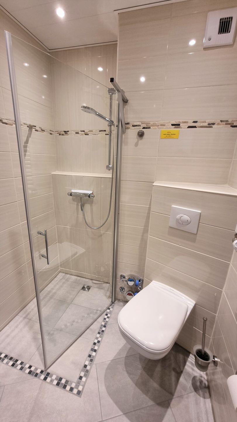 Das neue, helle Duschbad (mit bodenebenen Einstieg), Hänge-WC, Spiegelschrank sorgt gerne für die nötige Hygiene.