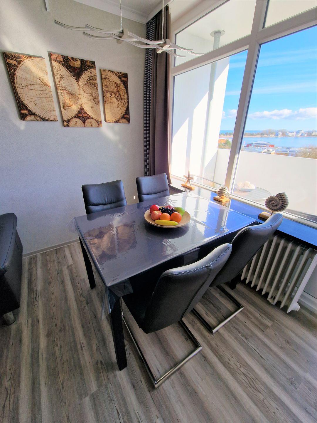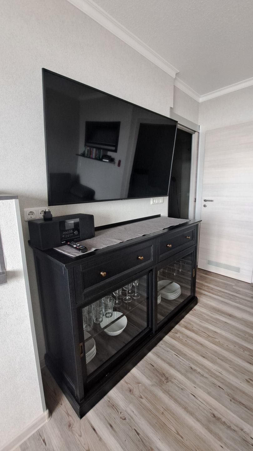Das Wohnzimmer verfügt über: HiFi-Anlage mit Internetradio und CD-Spieler, WLAN, Smart-TV, Ledersofa und Lederstühle, Auswahl an Büchern, LED Beleuchtung mit verschieden Leuchtvariationen.