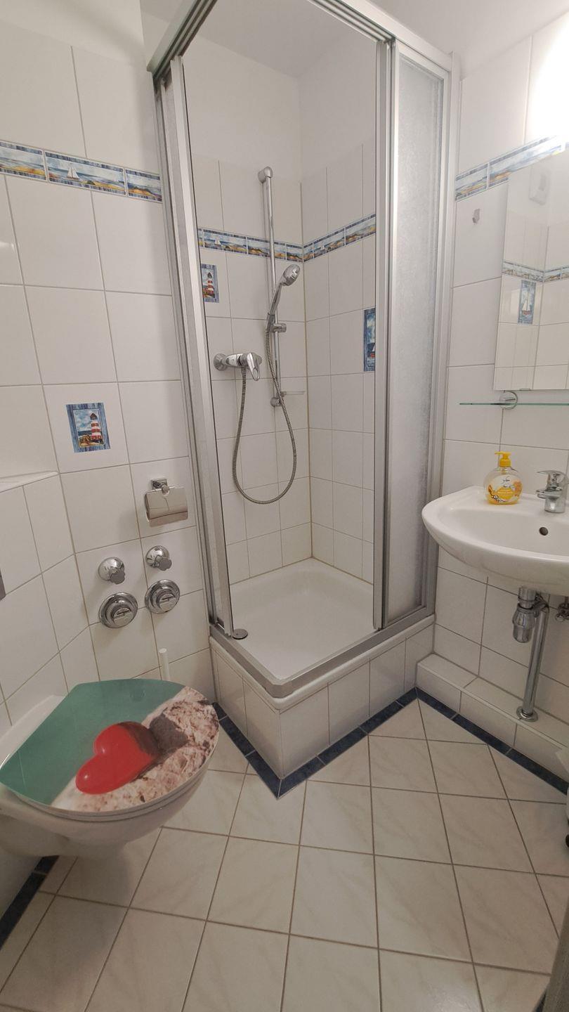 Bad: Duschkabine, Fön, Putzutensilien, Bügelbrett, Wäscheständer, Bügeleisen, Staubsauger.