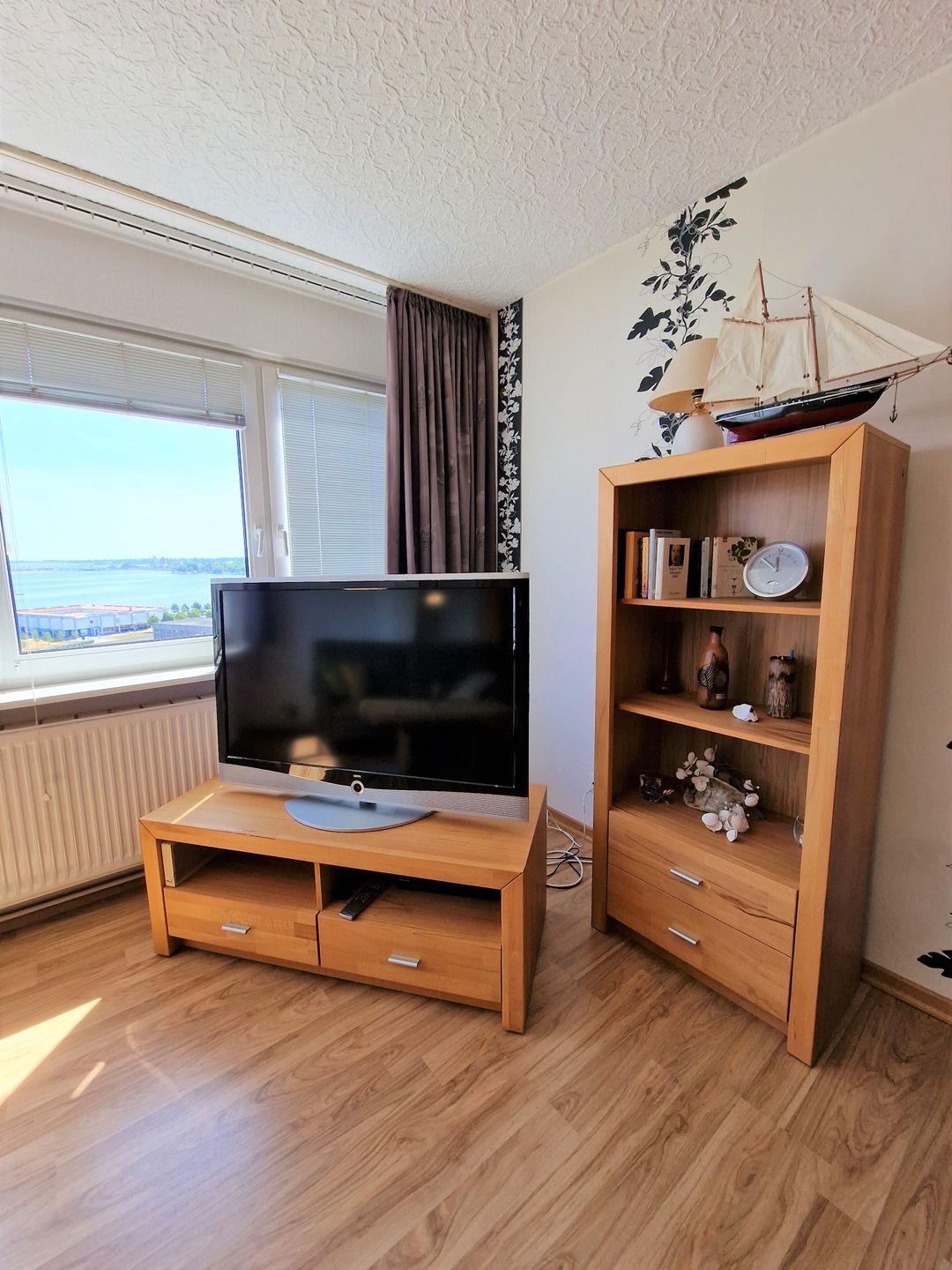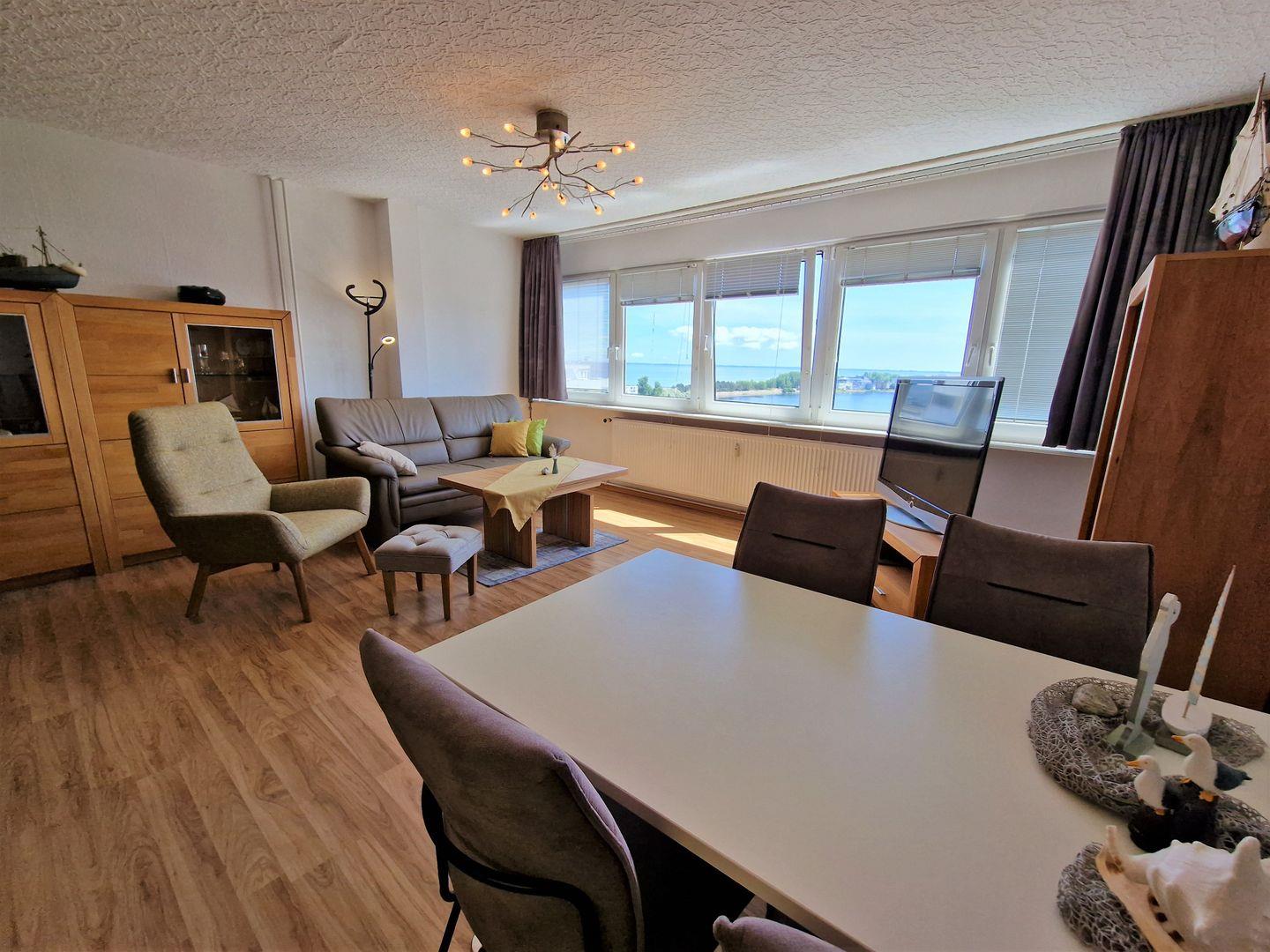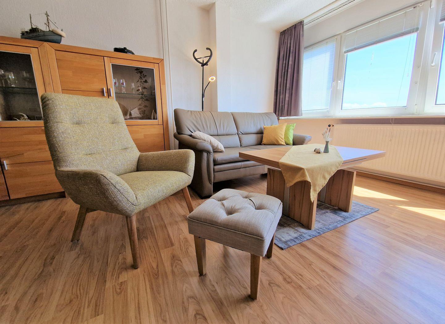 Diese Ferienwohnung besticht durch das großzügige Wohnzimmer mit langer Fensterfront und ist geeignet für max. 3 Personen (Schlafcouch).