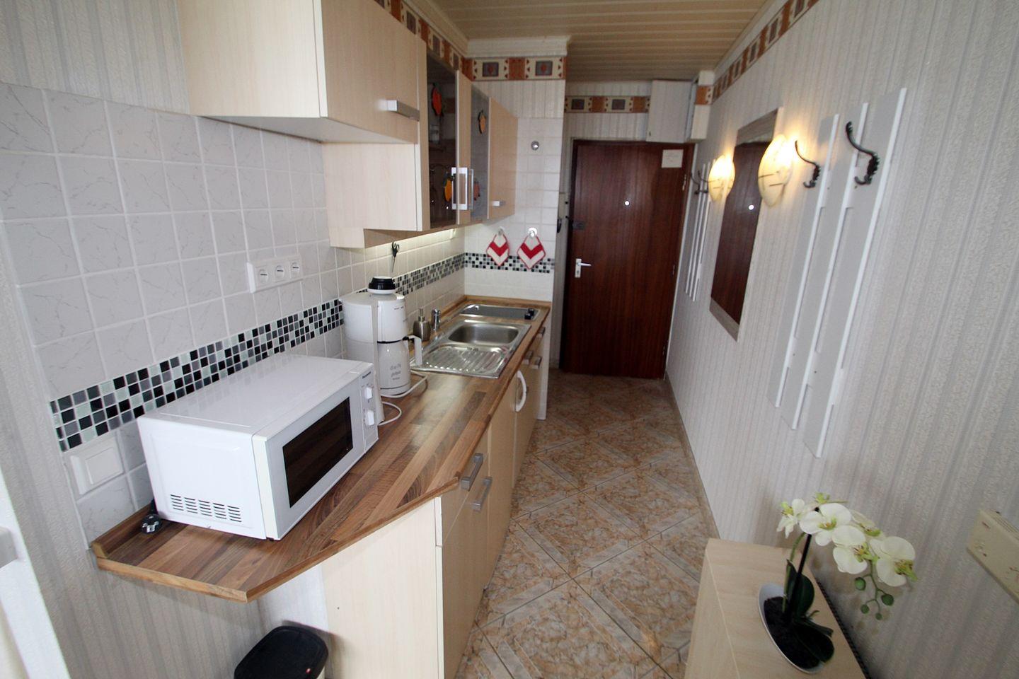 Die Küchenzeile ist mit den üblichen Utensilien ausgestattet. Kühlschrank, Mikrowelle, kleines Cerankochfeld, Kaffemaschiene etc.