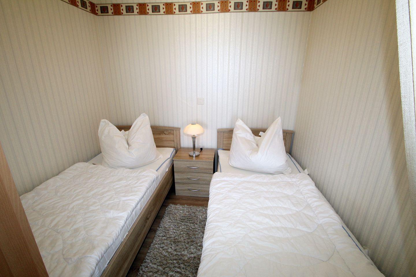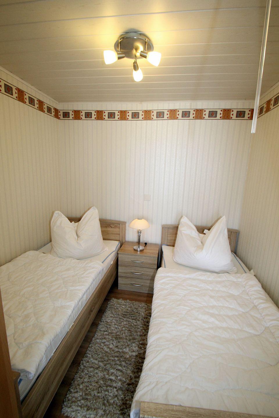 Der Schlafbereich ist durch einen Vorhang vom Wohnbereich abtrennbar und verfügt über zwei Standard-Einzelbetten und eine kleine Kommode.