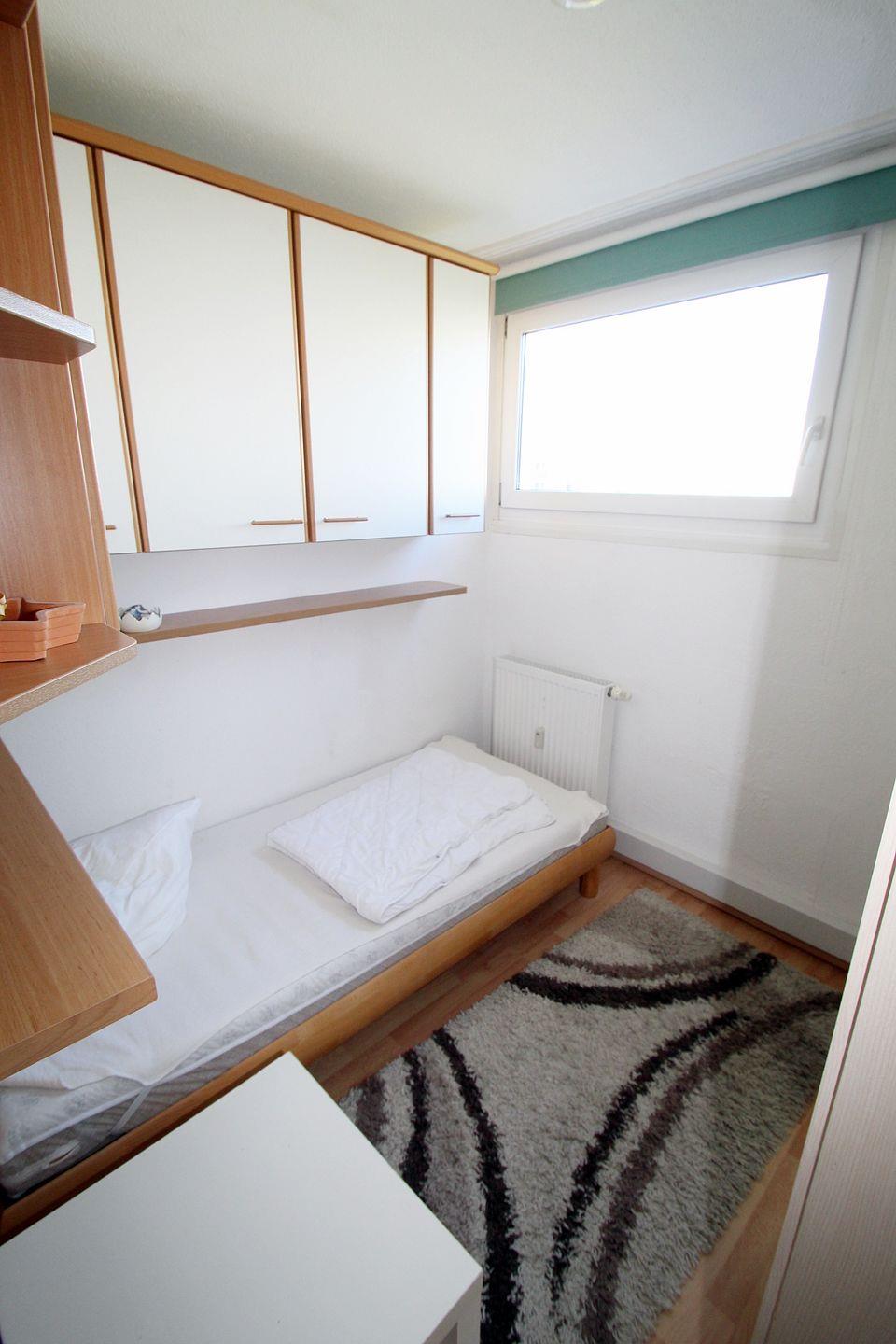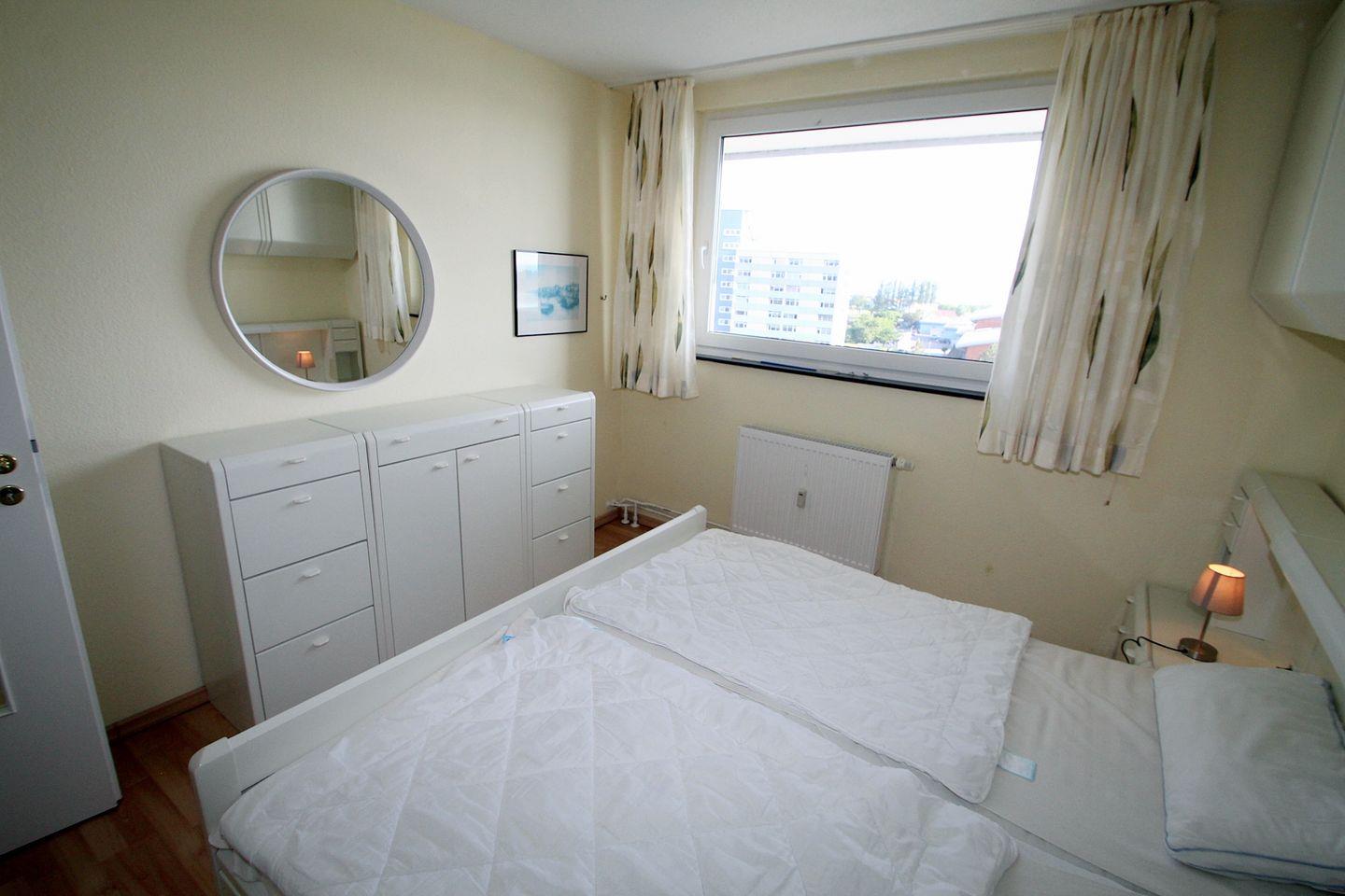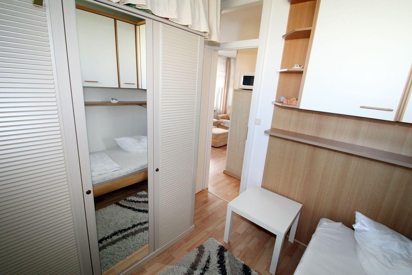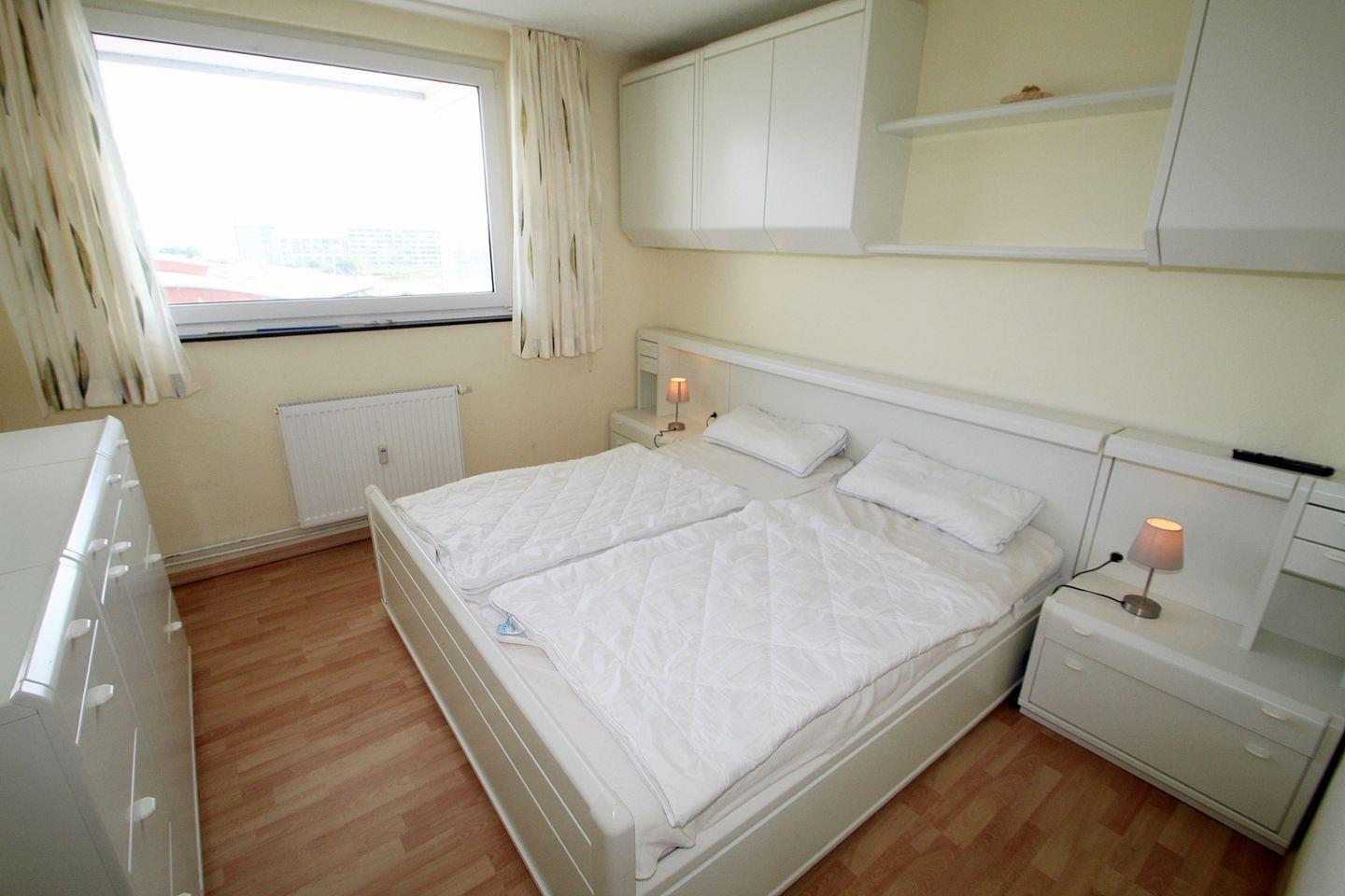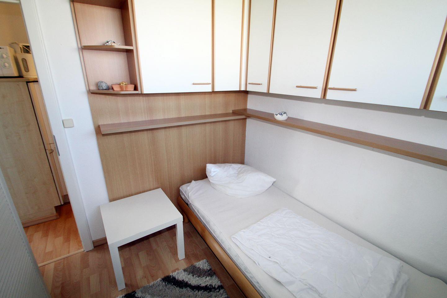 Zum Schlafen stehen zwei Zimmer zur Verfügung. Das größere Zimmer ist mit einer Kommode und Doppelbett ausgestattet. Über das Fenster können Sie ebenfalls auf das Aktiv-Hus und den Binnensee schauen. Das andere Zimmer verfügt über ein Einzelbett sowie einen Kleiderschrank. Ein kleines Fenster ist ebenfalls vorhanden.