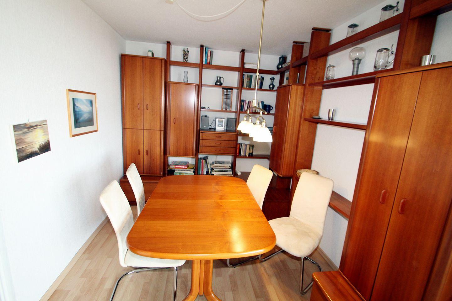 Das Wohnzimmer ist mit einer 3er-Couchgarnitur mit dazugehörigem Sessel ausgestattet. Dieser Sitzbereich liegt an einem großen Fenster mit Blick zum Aktiv-Hus und dem Binnensee.
