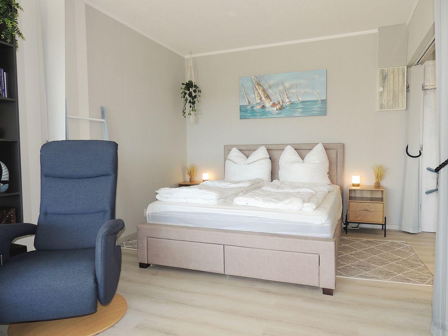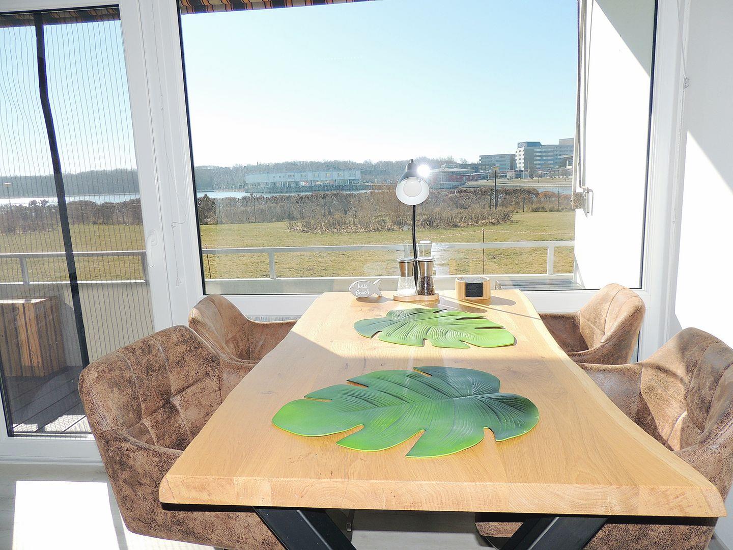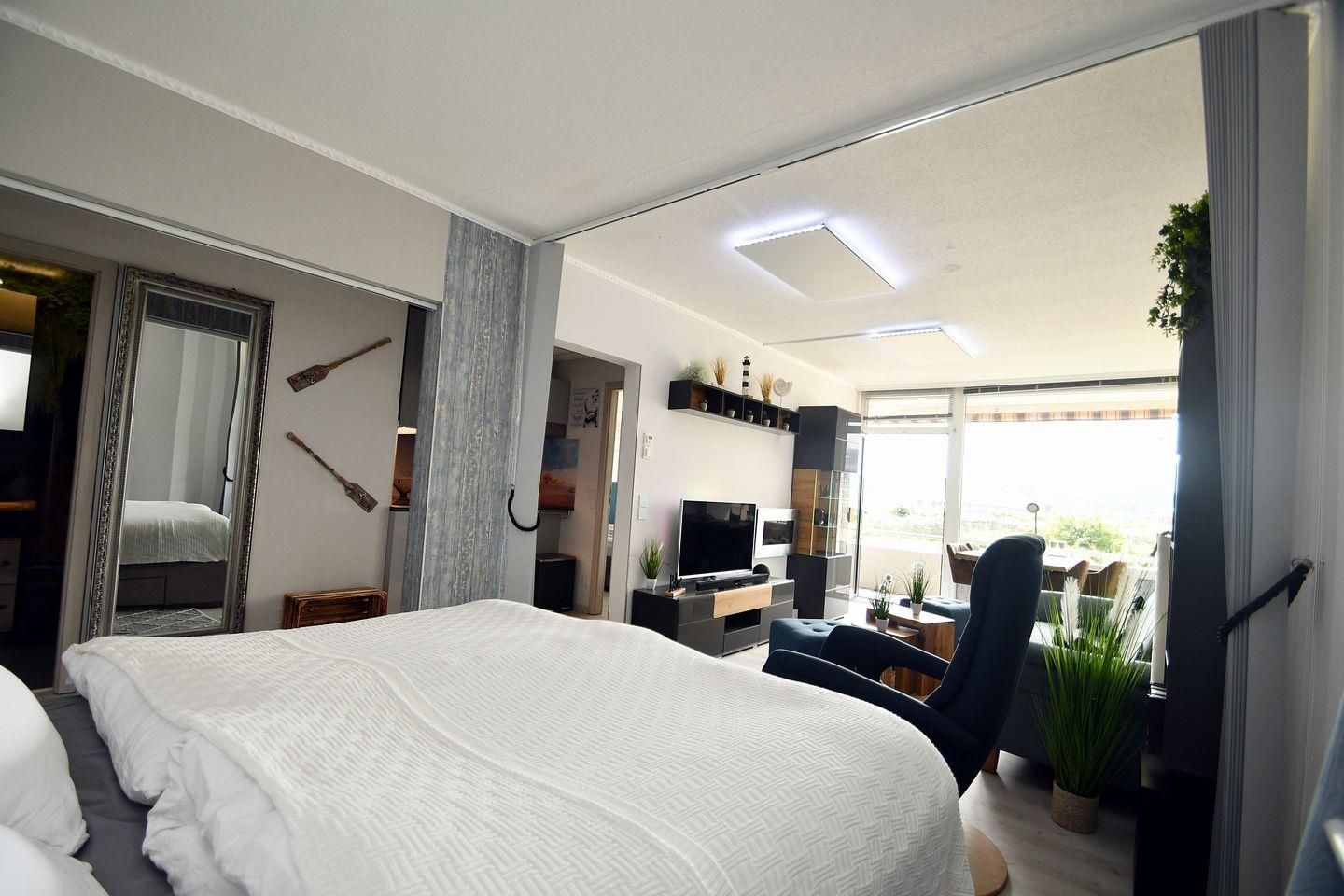 Komplett renovierte, sehr hochwertig ausgestattete, freundliche und helle Ferienwohnung "AQUANA" im Erdgeschoß mit Balkon zur Südseite und Blickrichtung über den Binnensee.