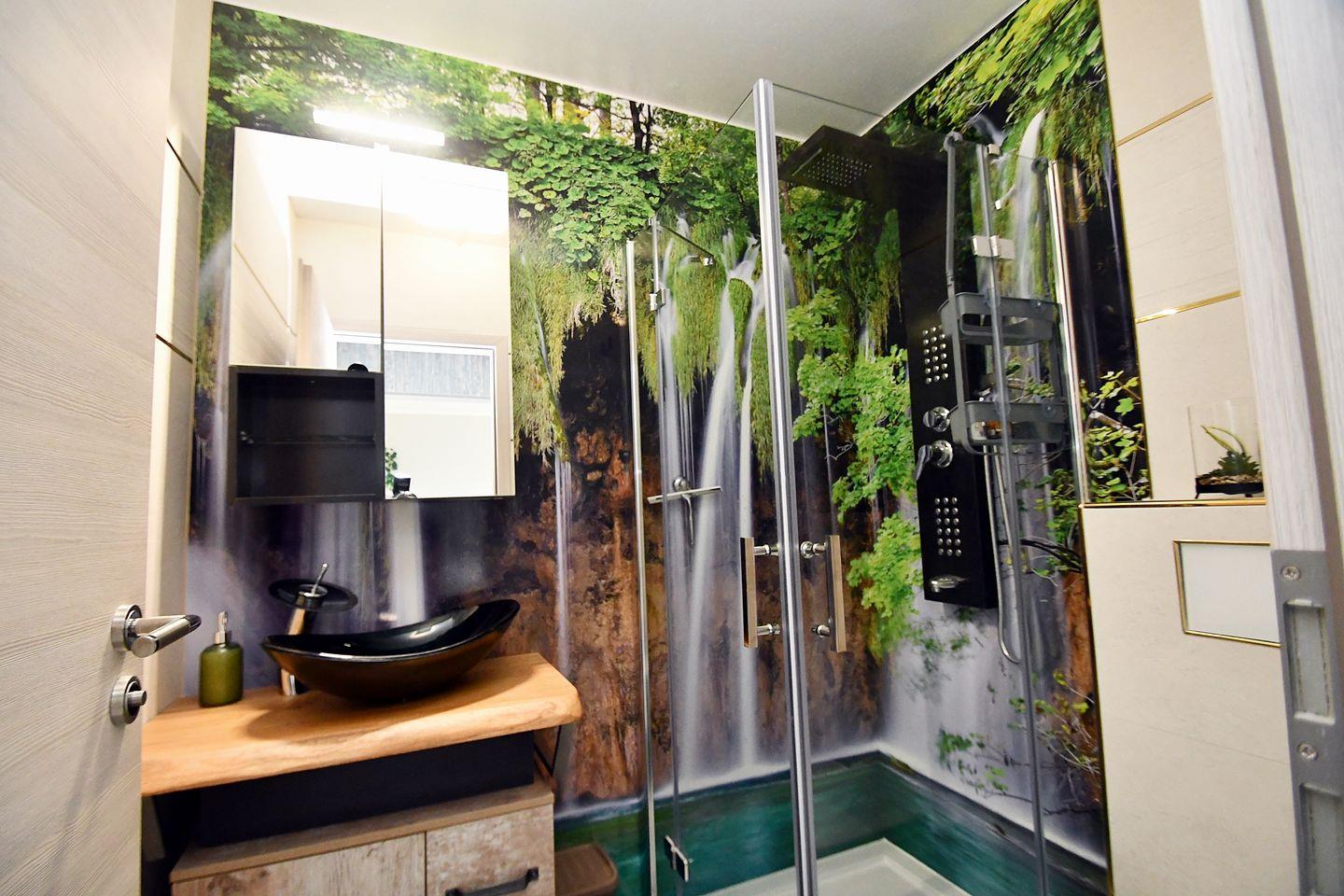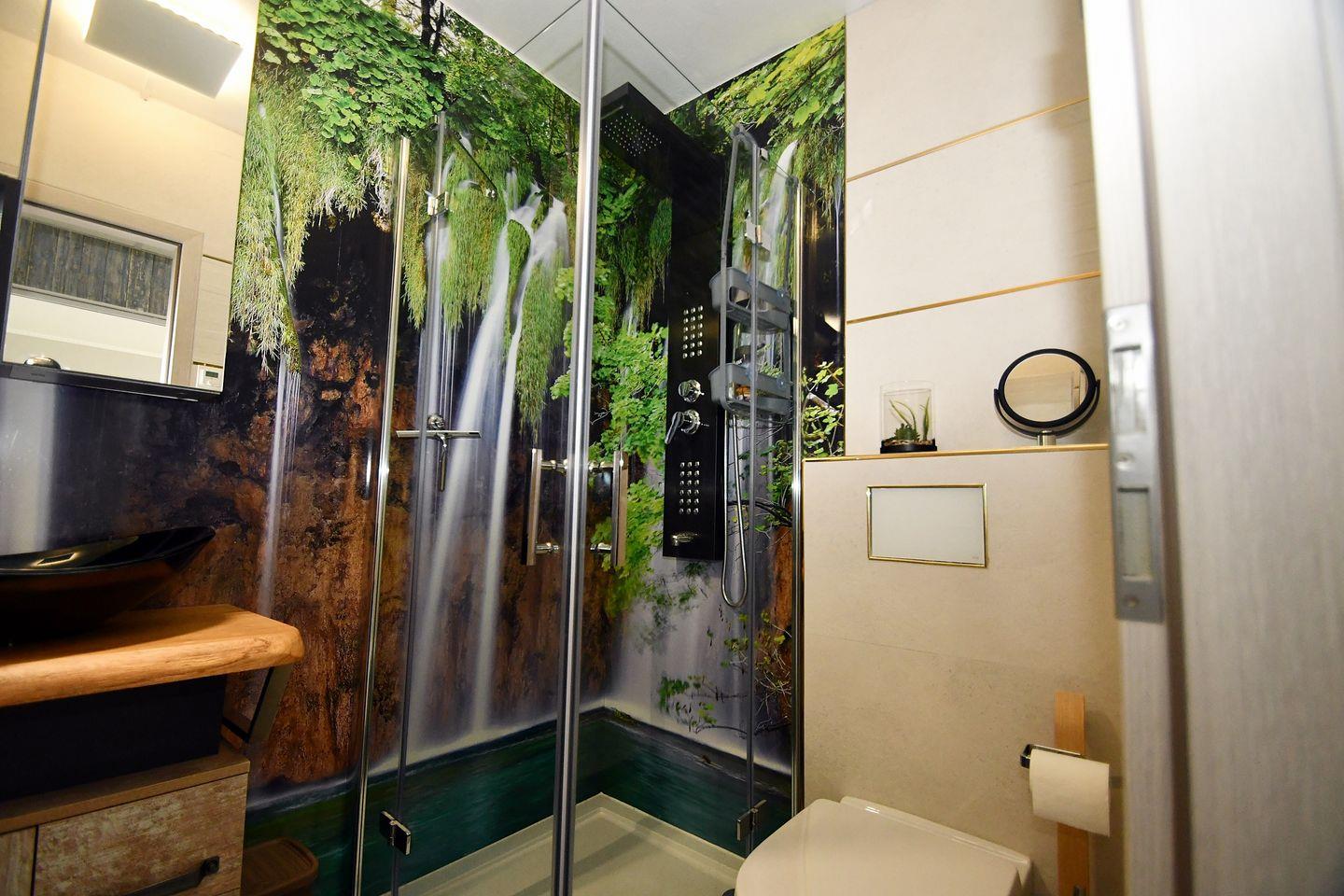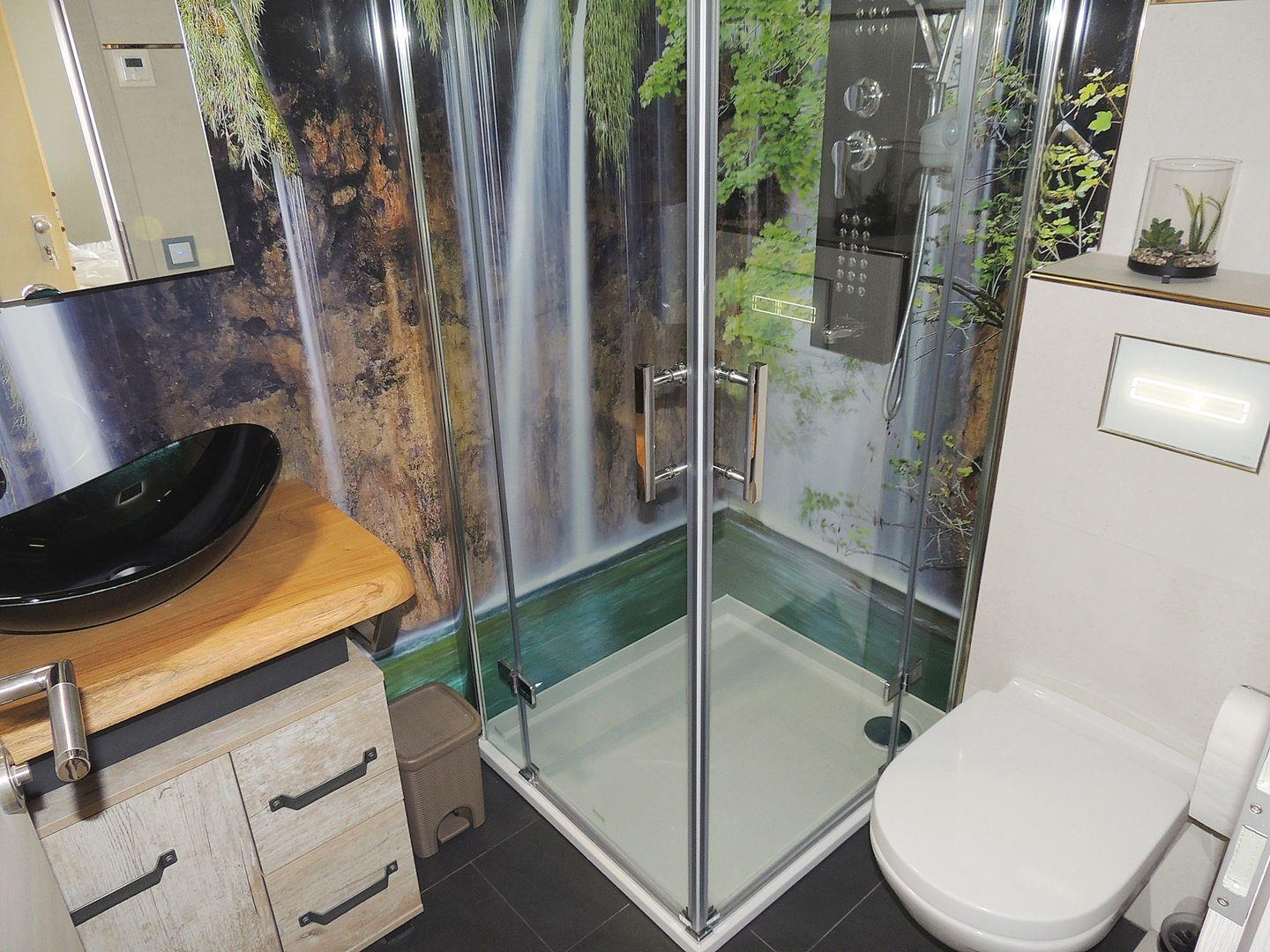 Helles und modernes Badezimmer mit Dusche und WC.
