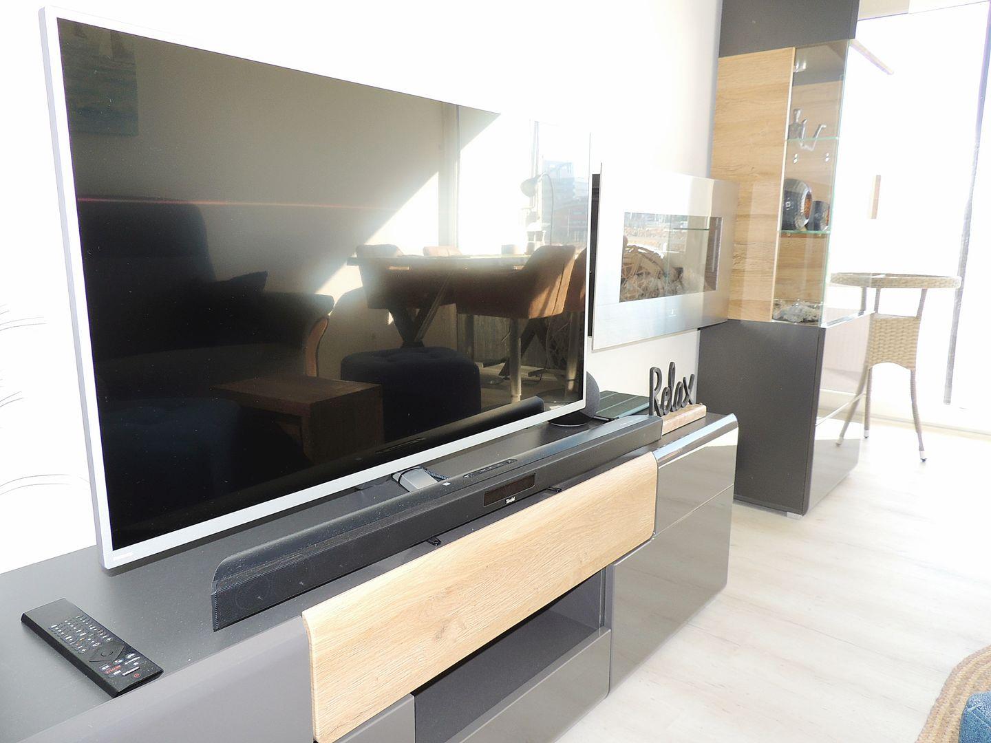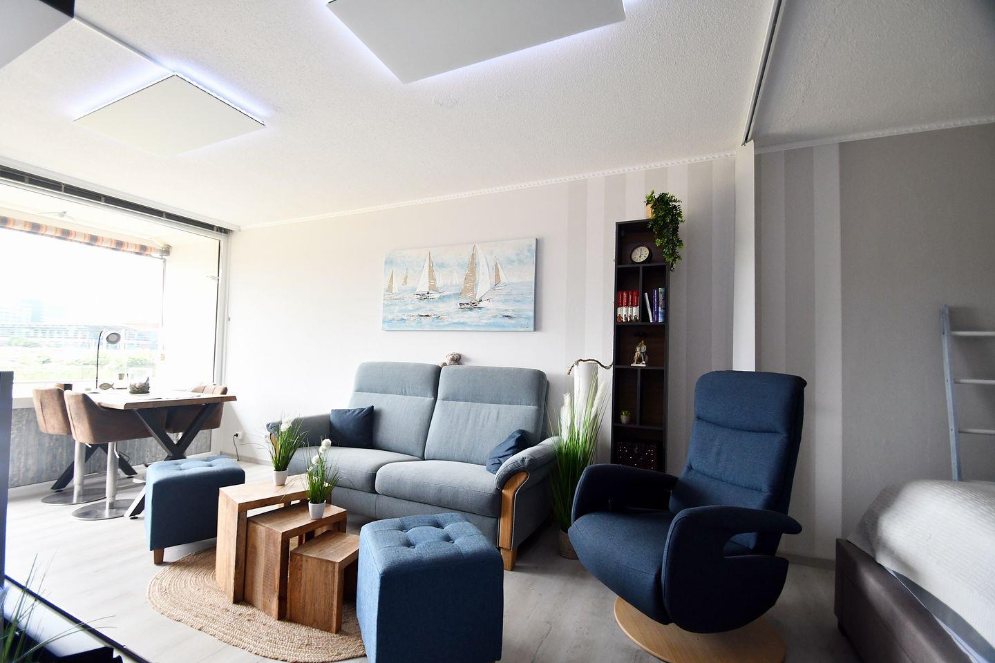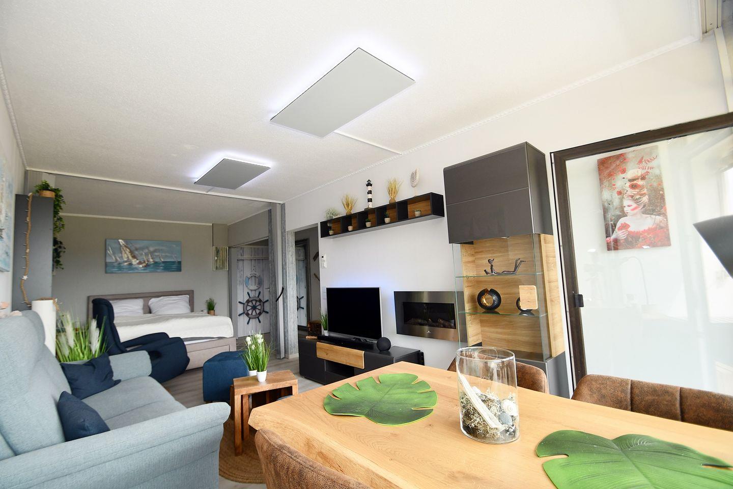 Maritimer Wohnbereich mit mit hochwertigen Sitzgarnituren, TV/DVD sowie einem Essbereich direkt am Fenster mit Blick über den Binnensee