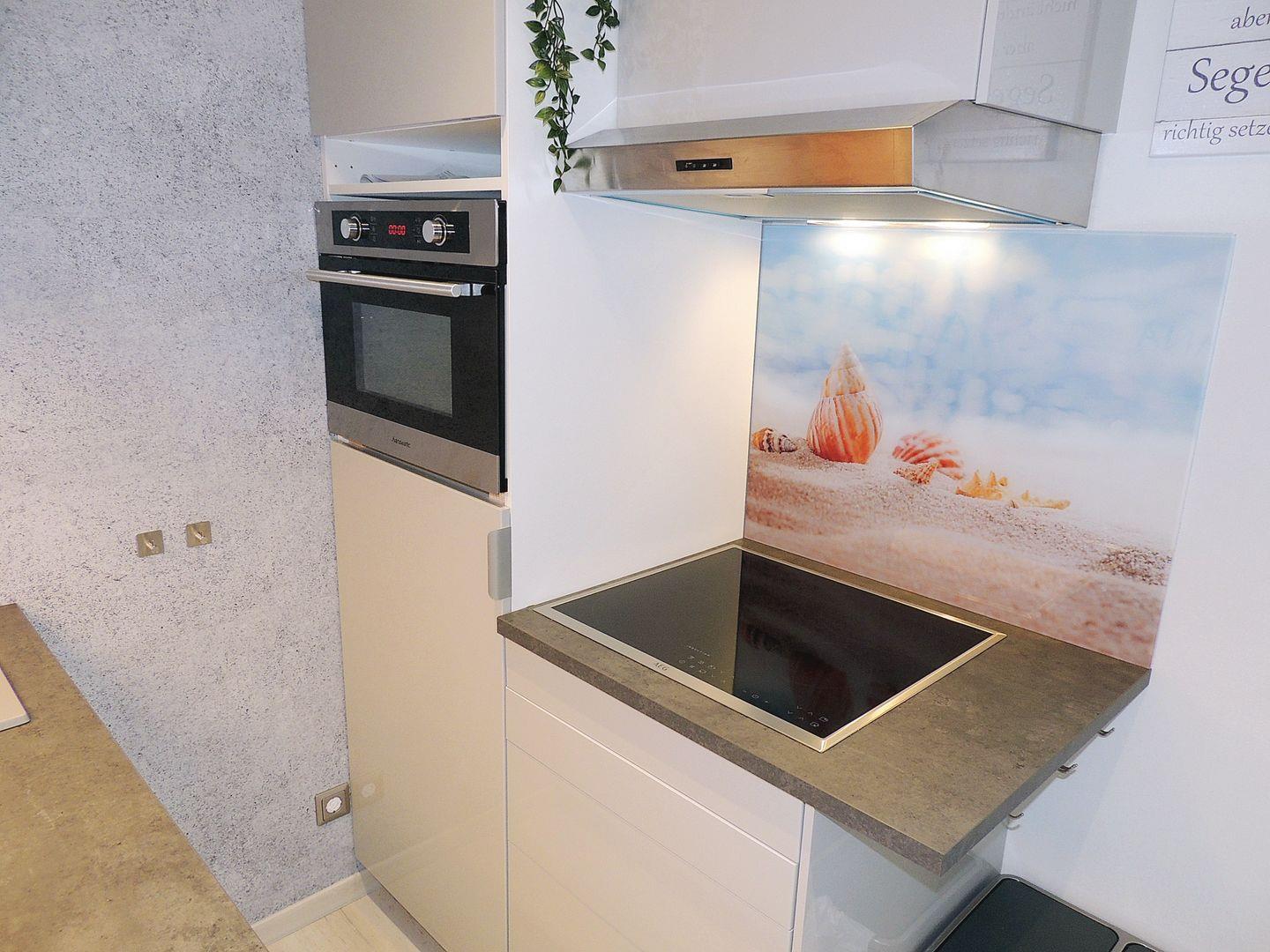 Moderne, neue Einbauküche mit Ceranfeld, Mikrowelle, Kaffeemaschine, Kühlschrank.